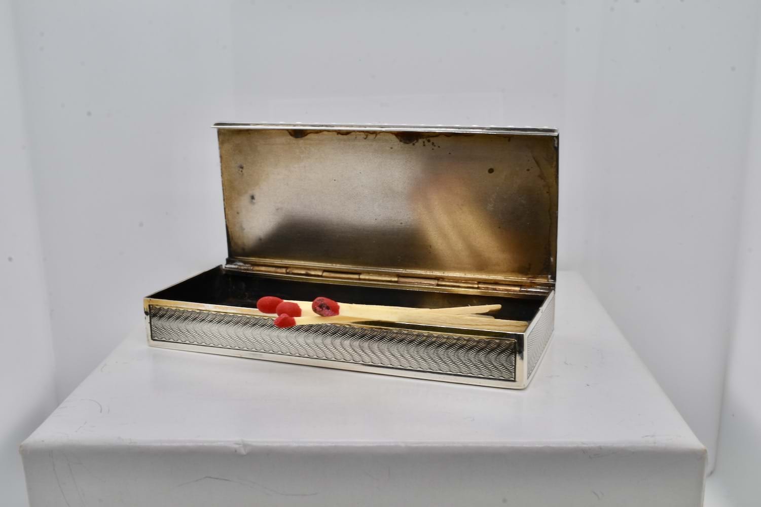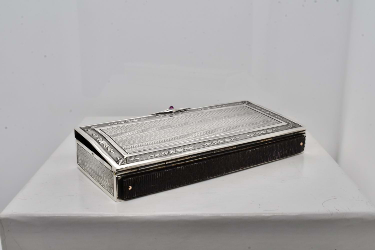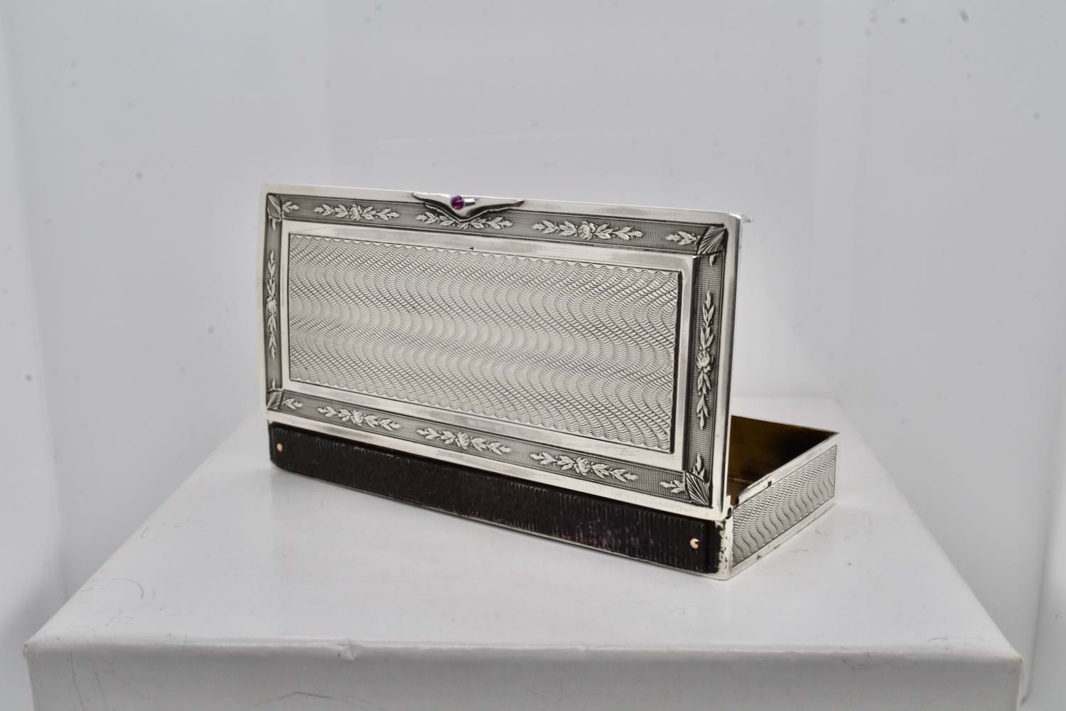 A French silver match safe, the hinged lid features a lovely foliage embossed border with waved engine turn decoration in the centre section and a raised thumbpiece with a small ruby inset and a long striker panel on one side. Hallmarked with a French boar guarantee mark along with an indistinct makers mark. Circa 1880s. Weight - 56.1grams. Measures approx. 83x38mm.