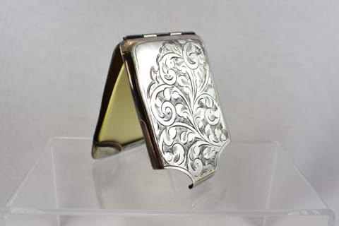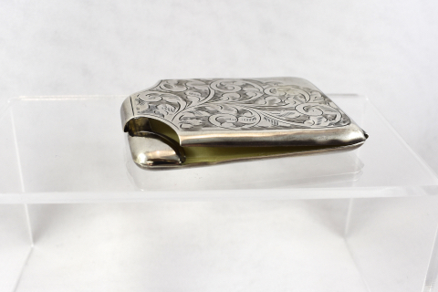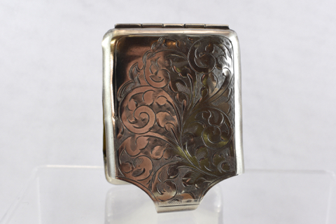 A throw back to the olden days! This quaint and beautiful silver case was intended to hold a small paper notebook and features decorative engraving on the front. Hallmarked 1927 Birmingham