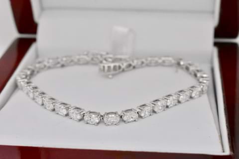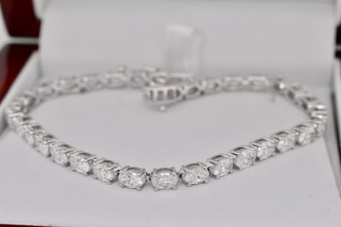 Elegant and stunning 18ct white gold tennis bracelet featuring 34 scintliating oval diamonds totalling 6.97cts, each individually claw set with an invisible clasp and figure eight safety catch. Independent Valuation Supplied