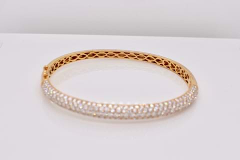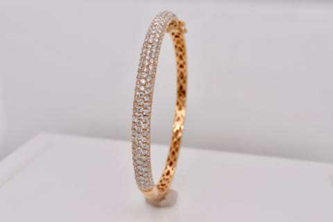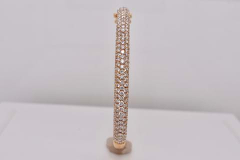 This oval, hinged bangle is crafted in 18ct rose gold and it is pave set with 198 sparkling, white, round brilliant cut diamonds totaling an impressive 4.34ct. Independent Valuation Supplied
