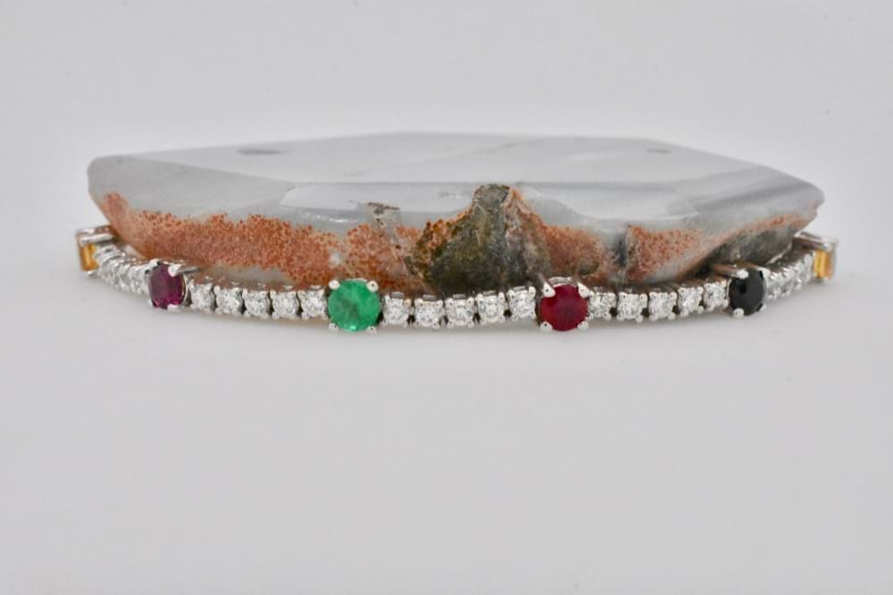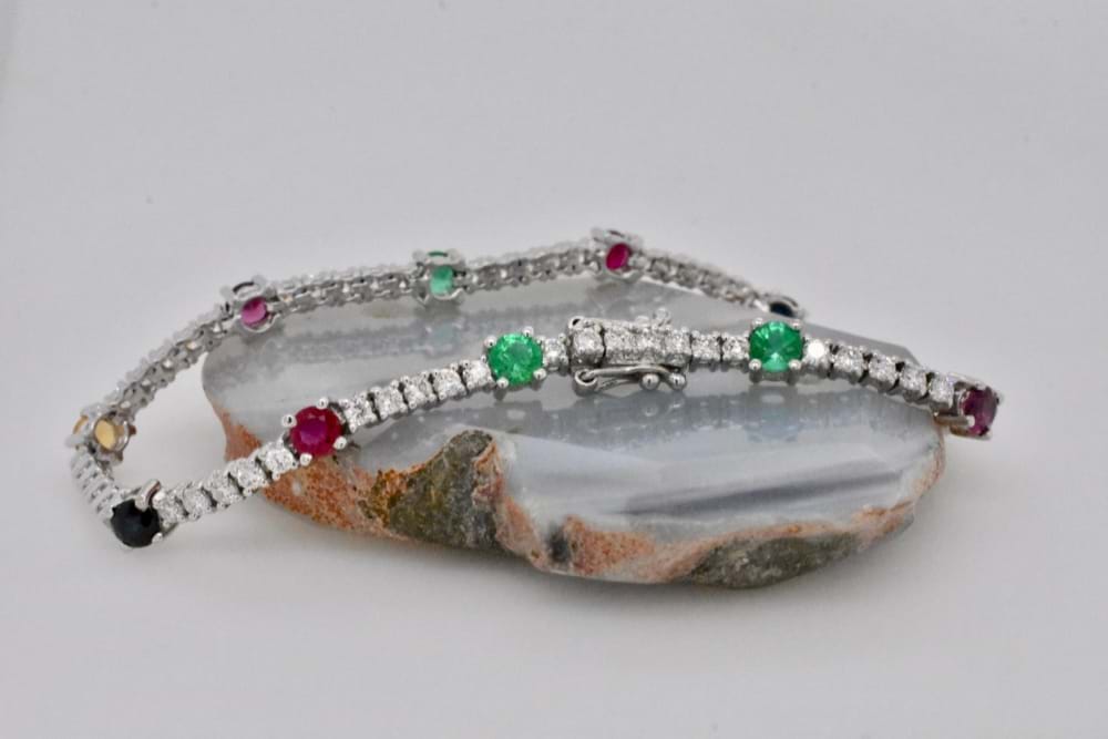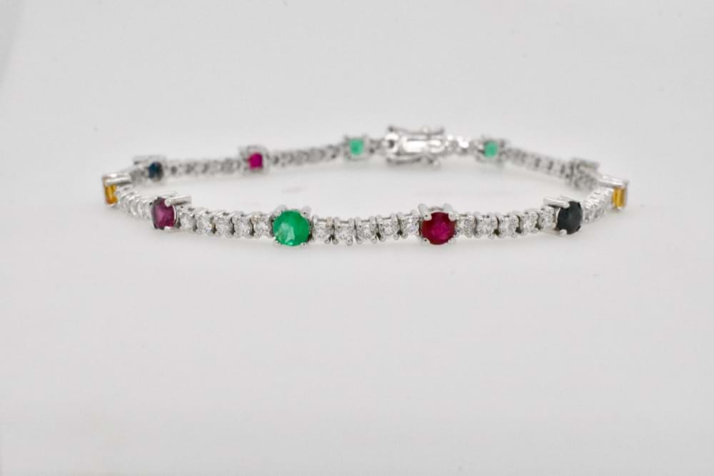 With a coloured gemstone to suit every outfit, this striking 18ct white gold bracelet contains an impressive 1.40cts of white Diamonds and alternating Emeralds, Sapphires, Rubies, Citrines and Garnets. Independent Valuation Supplied.