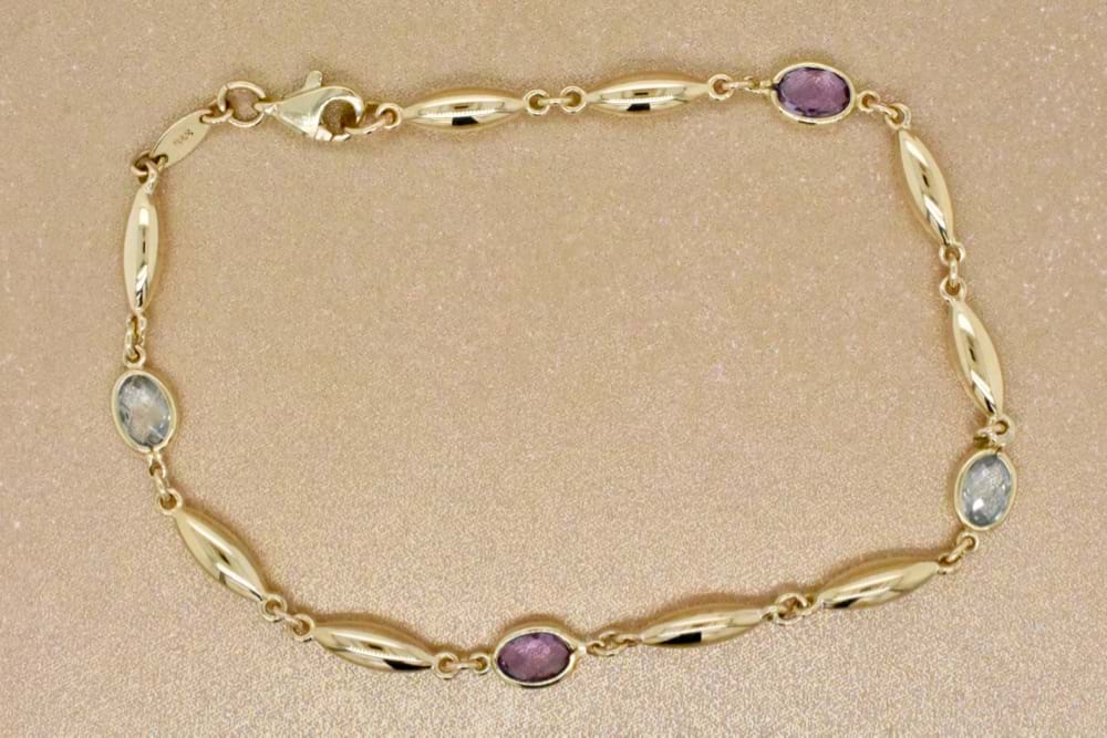 A 9ct yellow gold fancy link bracelet containing alternating amethyst and blue topaz gems separated by teardrop yellow gold links