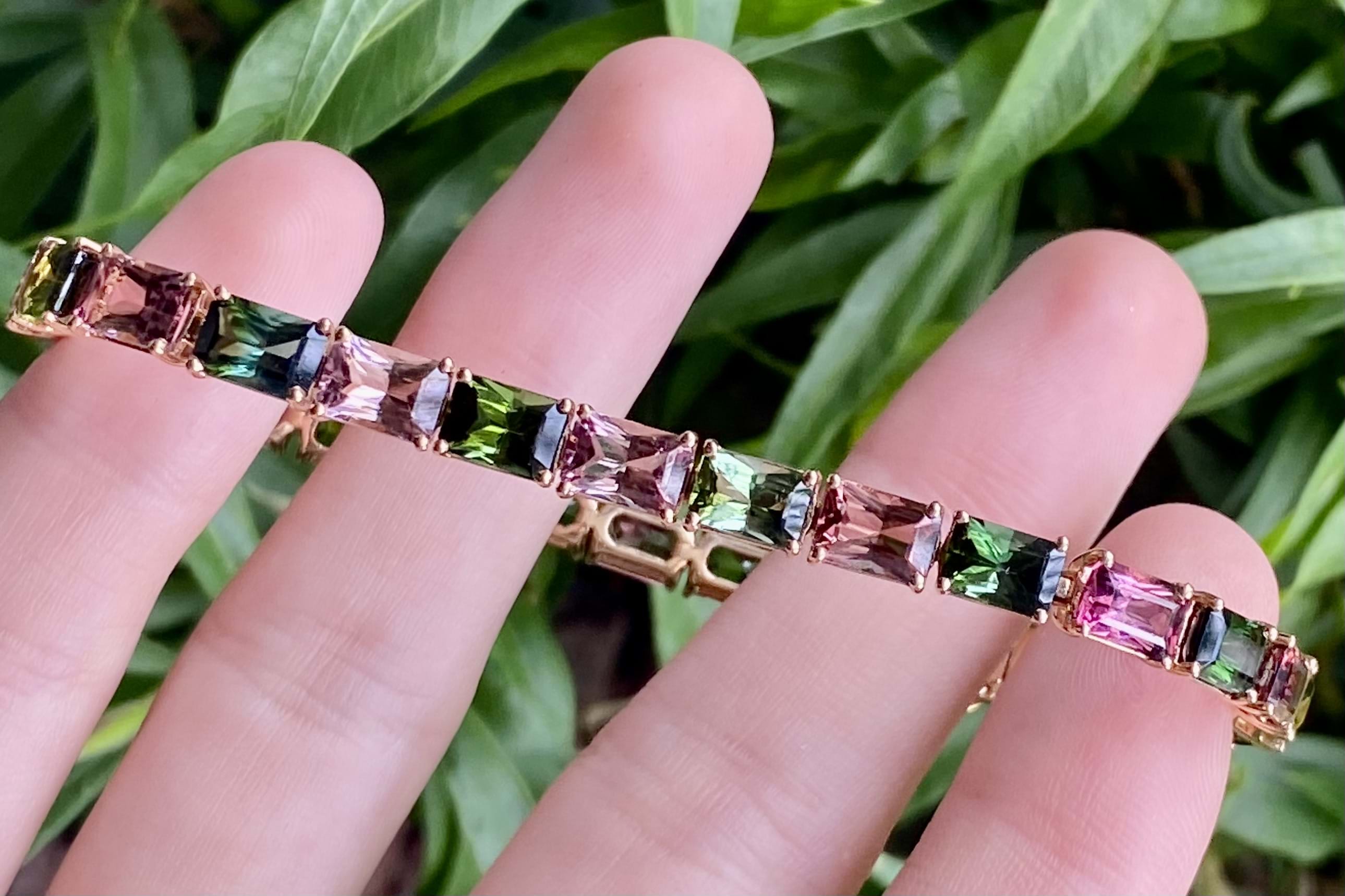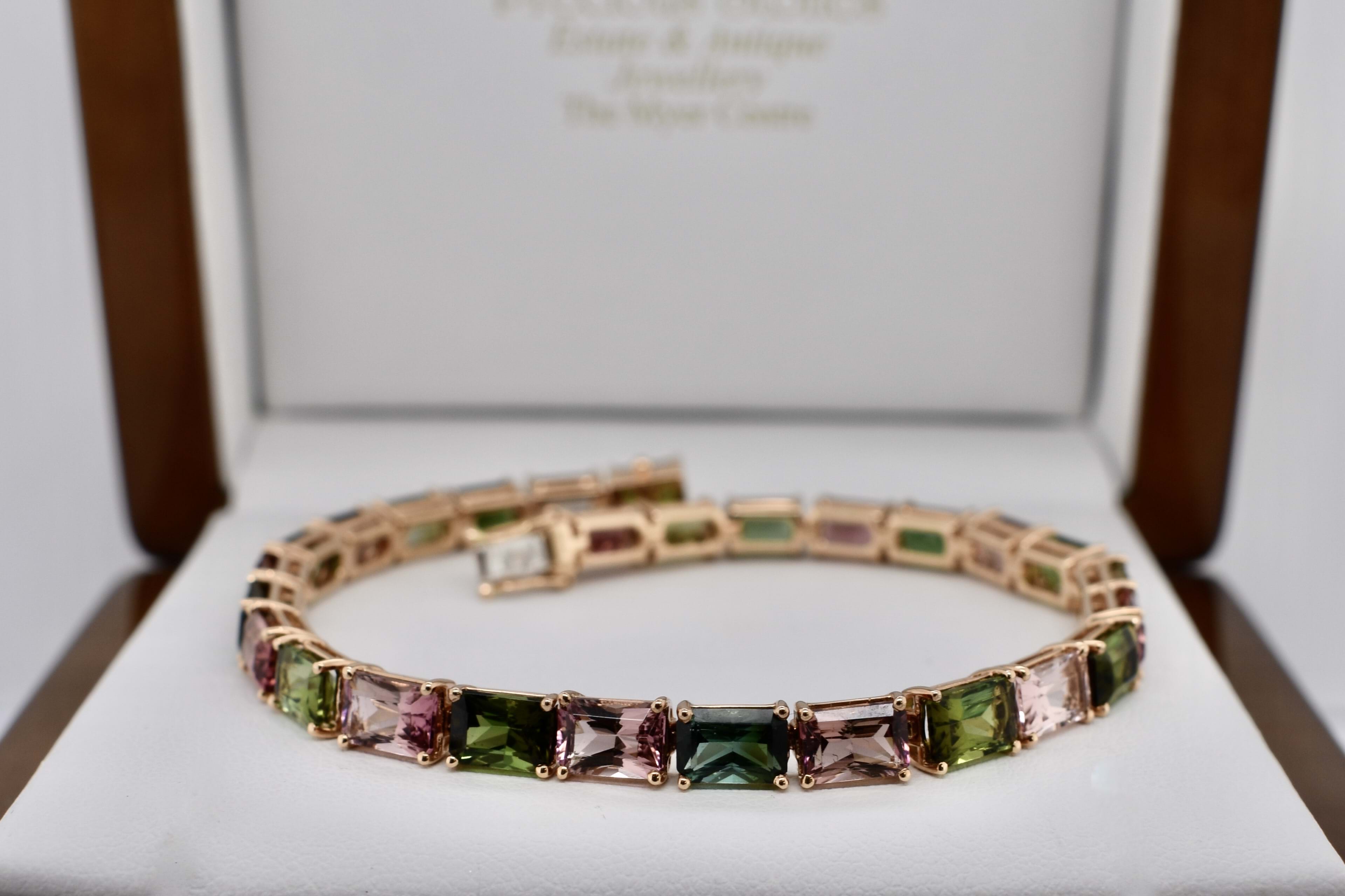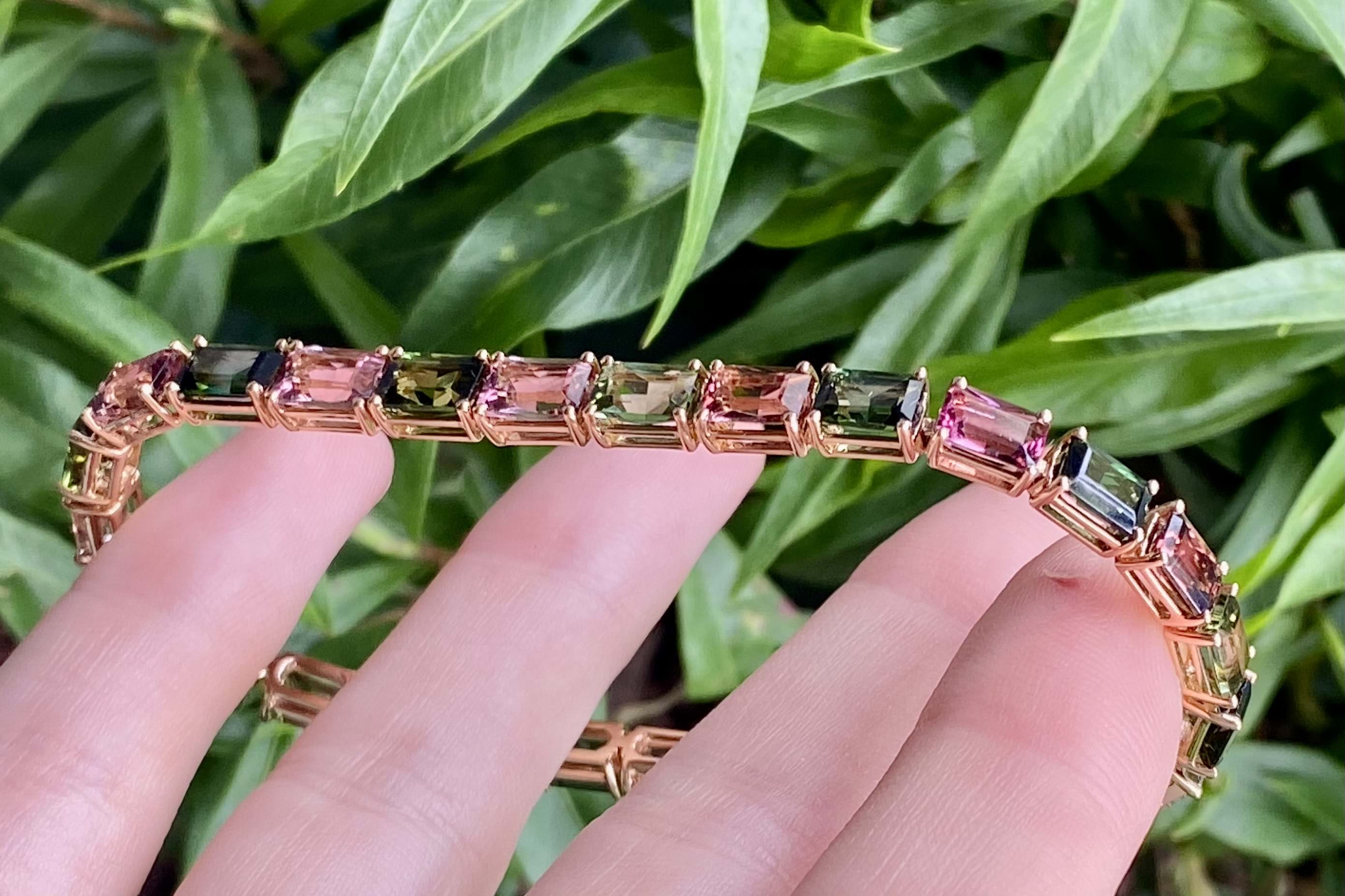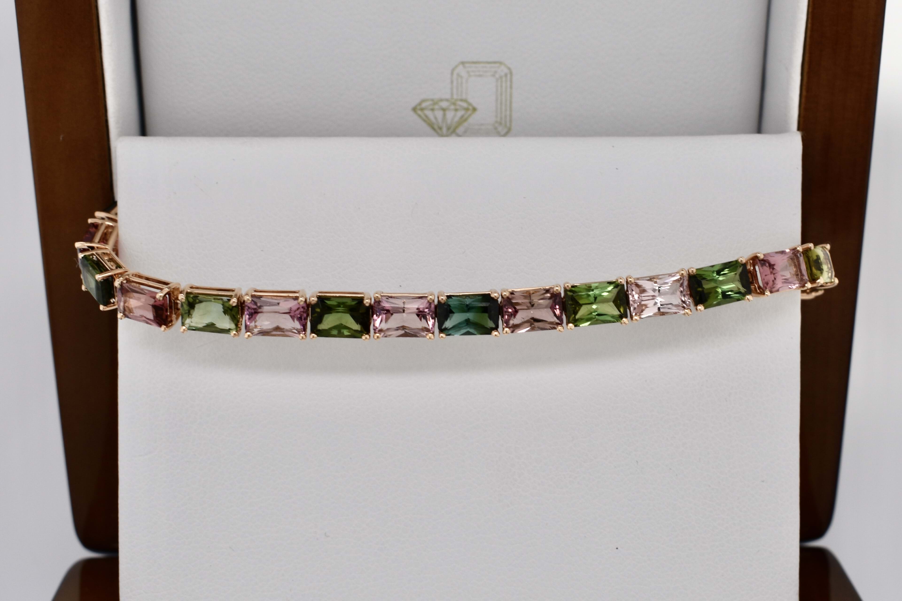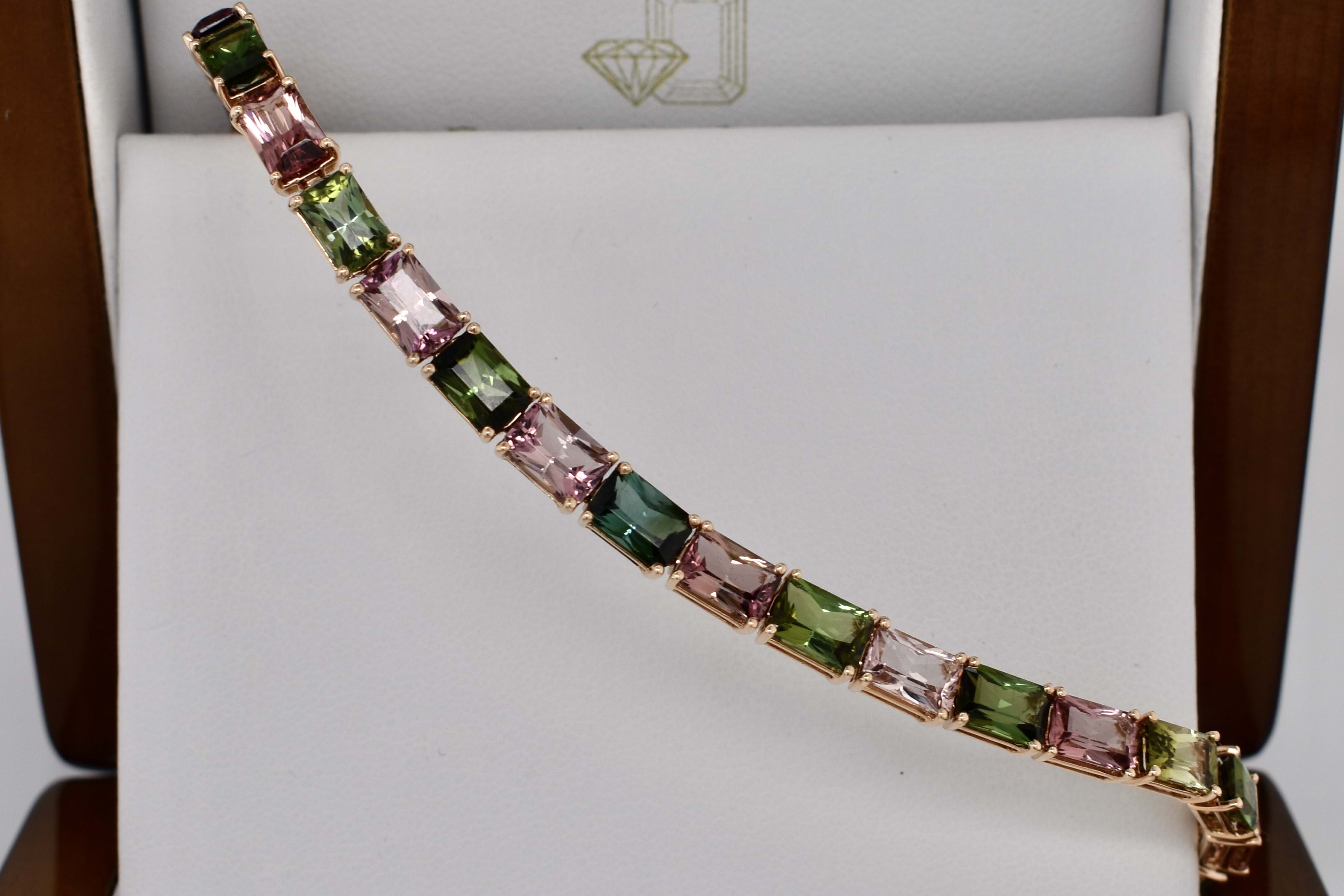 SOLD 18ct Rose Gold 10.60ct Green Tourmaline & 7.22ct Pink Tourmaline Radiant Cut 18cm Bracelet