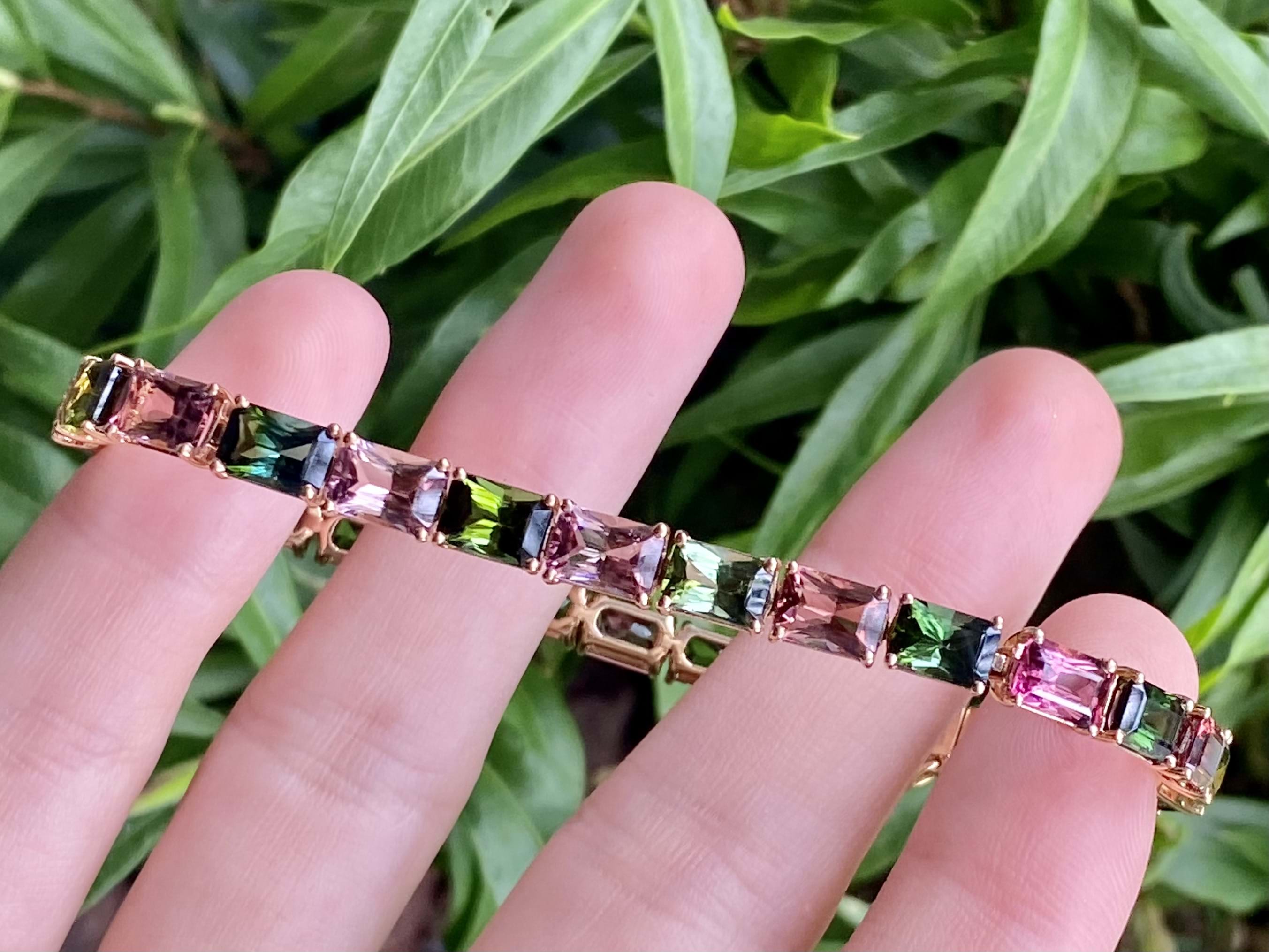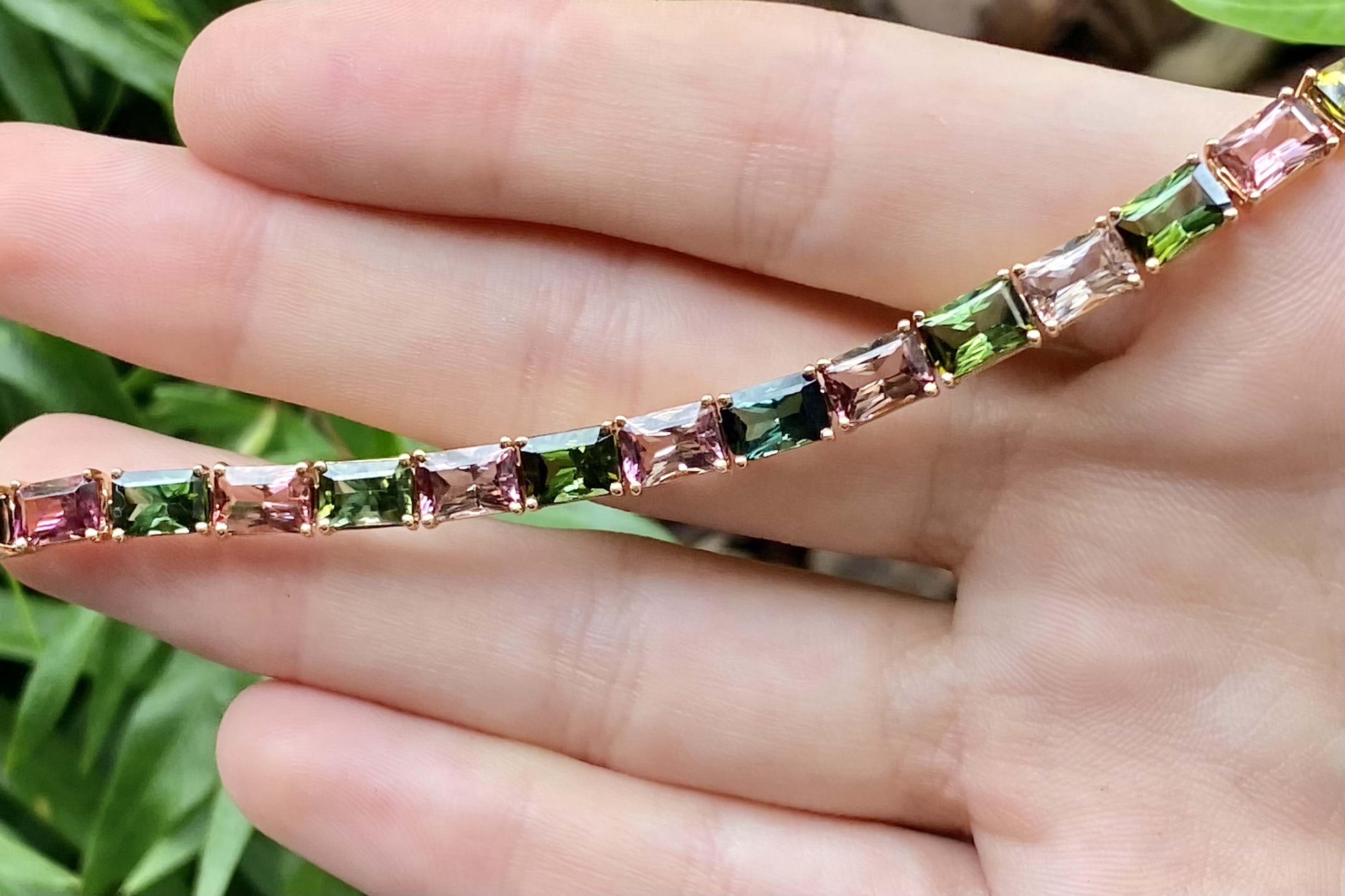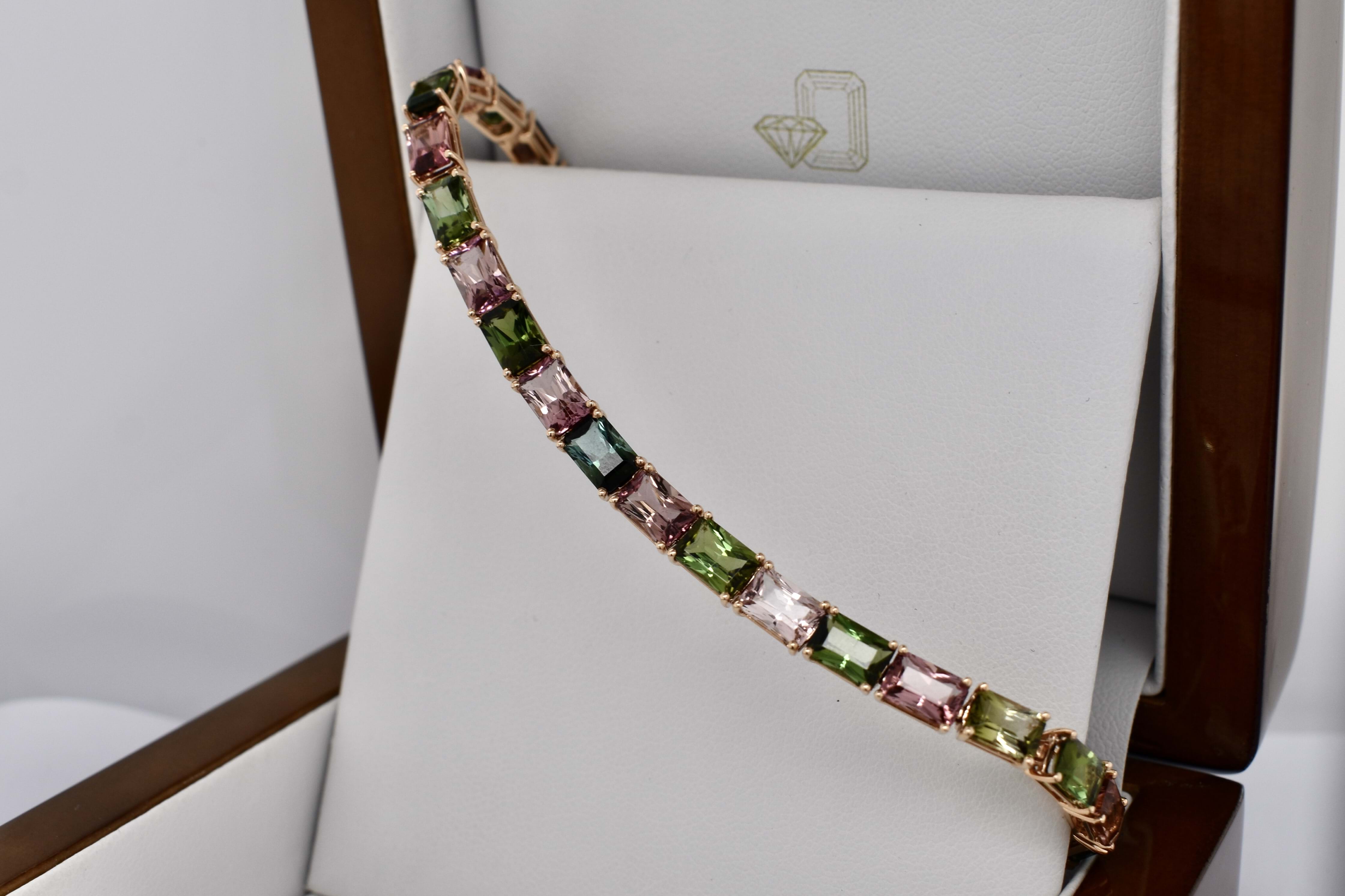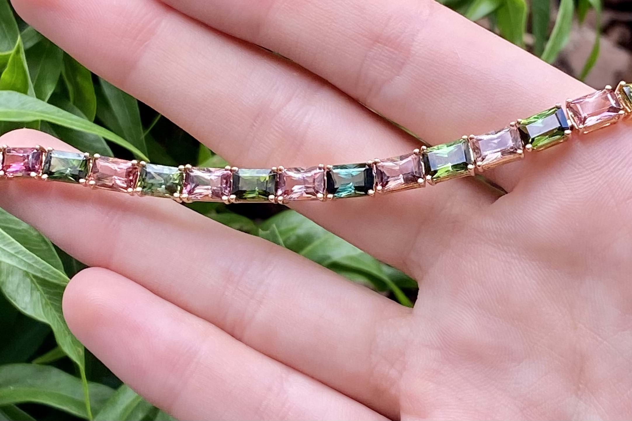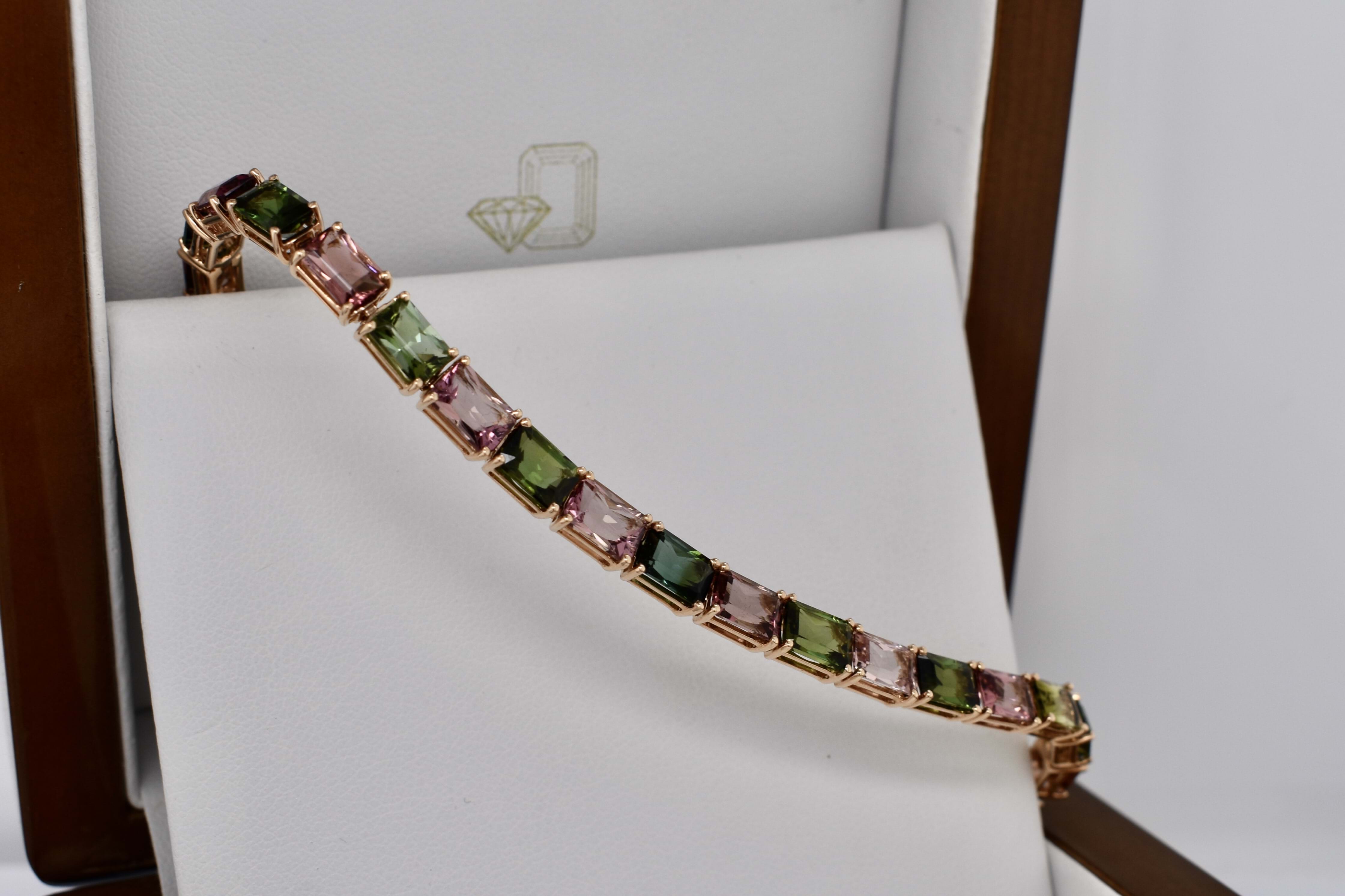 SOLD 18ct Rose Gold 10.60ct Green Tourmaline & 7.22ct Pink Tourmaline Radiant Cut 18cm Bracelet