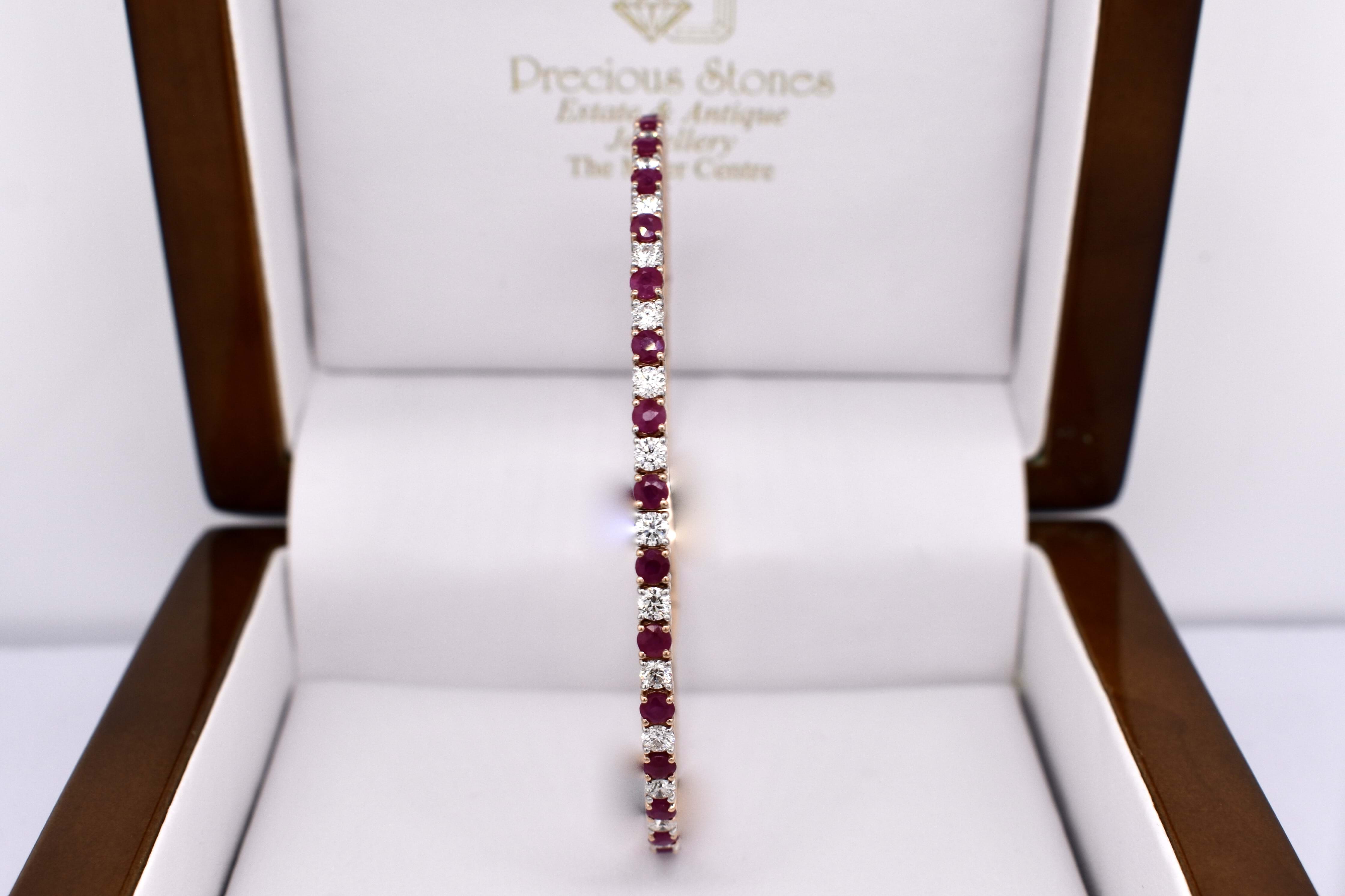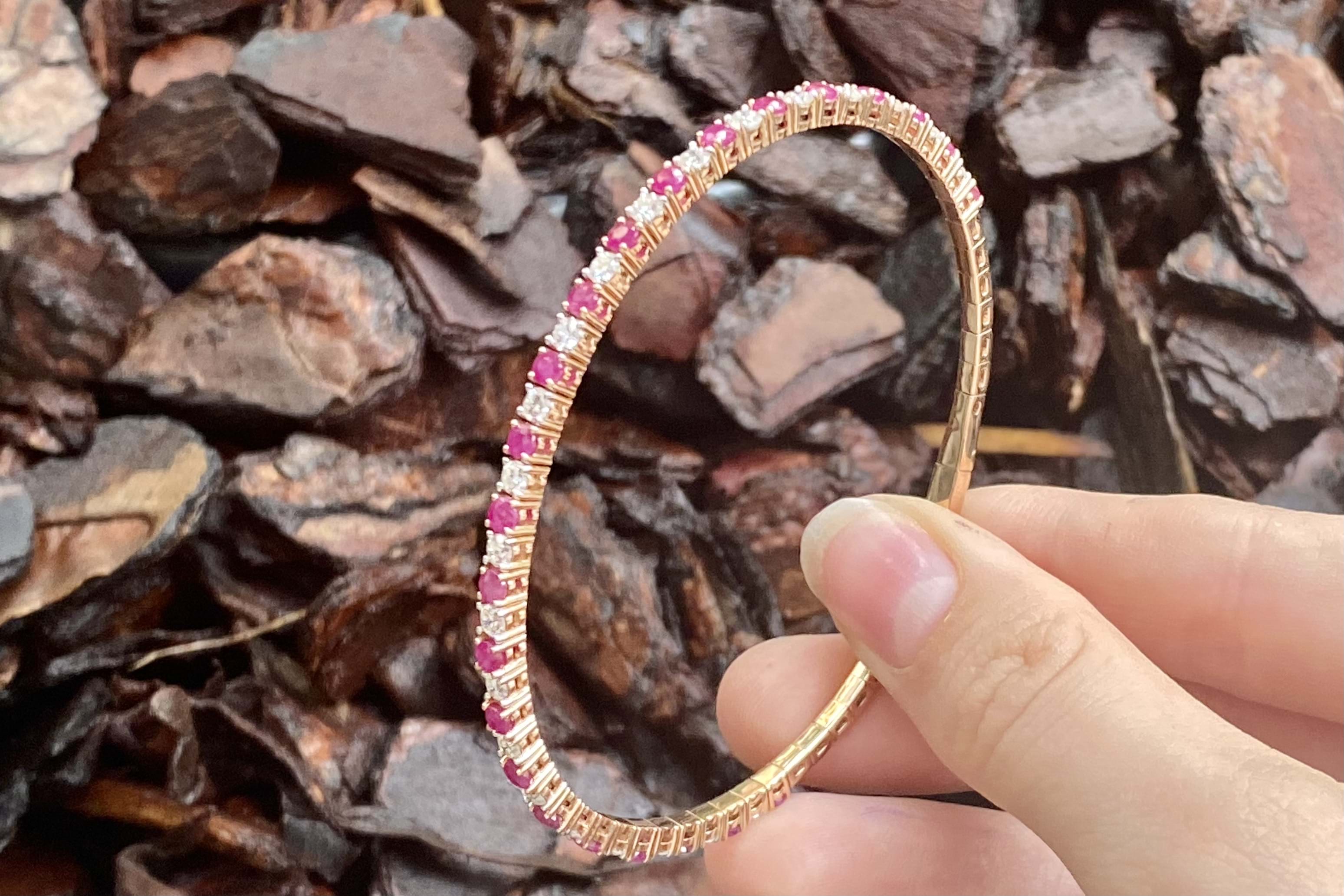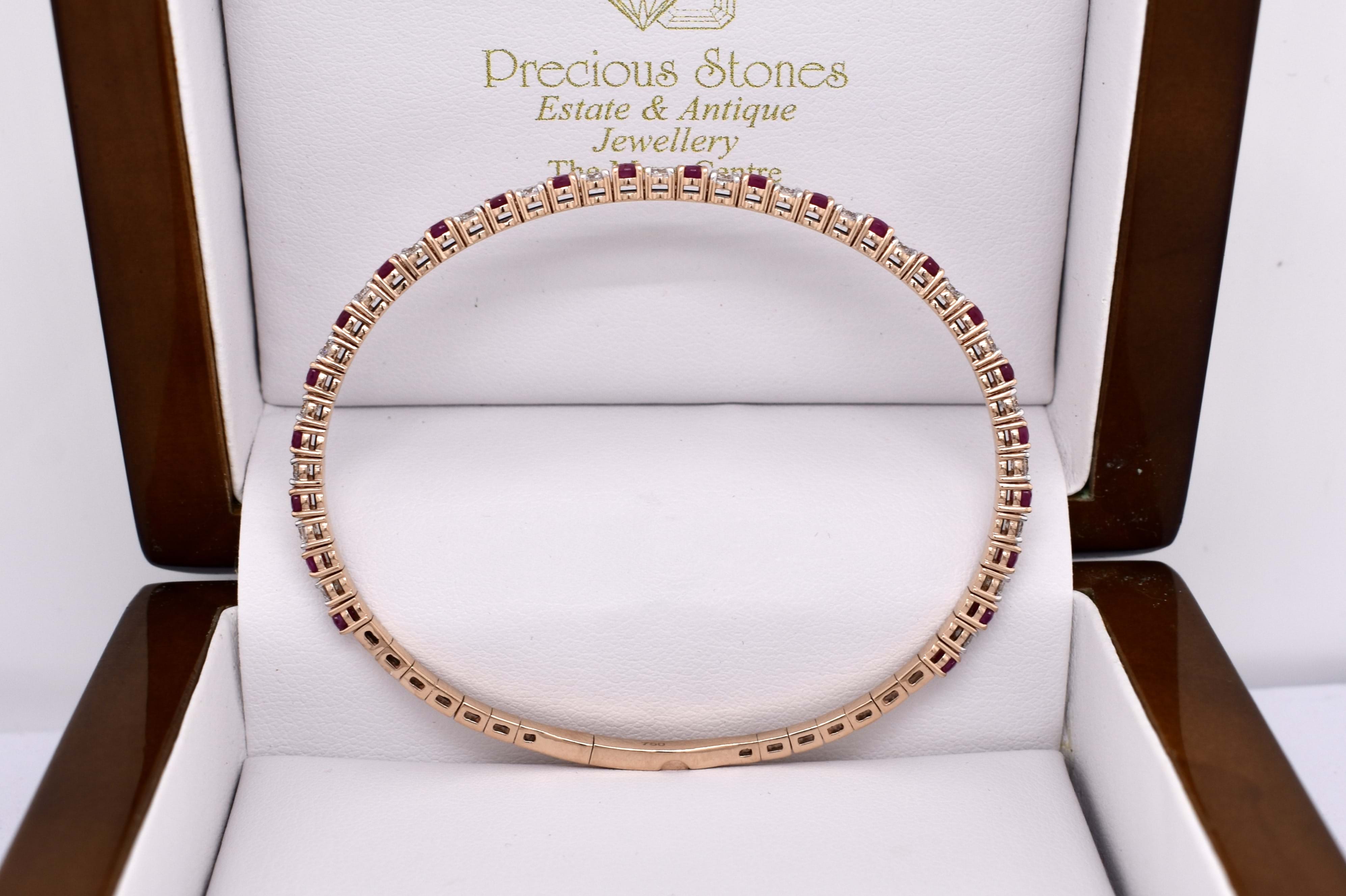 This beautiful bangle with a pop of colour is crafted in 18ct rose gold, set with 2.55ct of round red rubies. It also features 22 round brilliant cut diamonds, shared claw set alternating with the rubies to add extra sparkle. Diamonds totalling 1.42ct G SI1. Bangle is slightly flexible allowing it to fit well on the wrist and has a hand size of 60mm. Completed with a tongue and groove clasp. Independent Valuation available upon purchase.