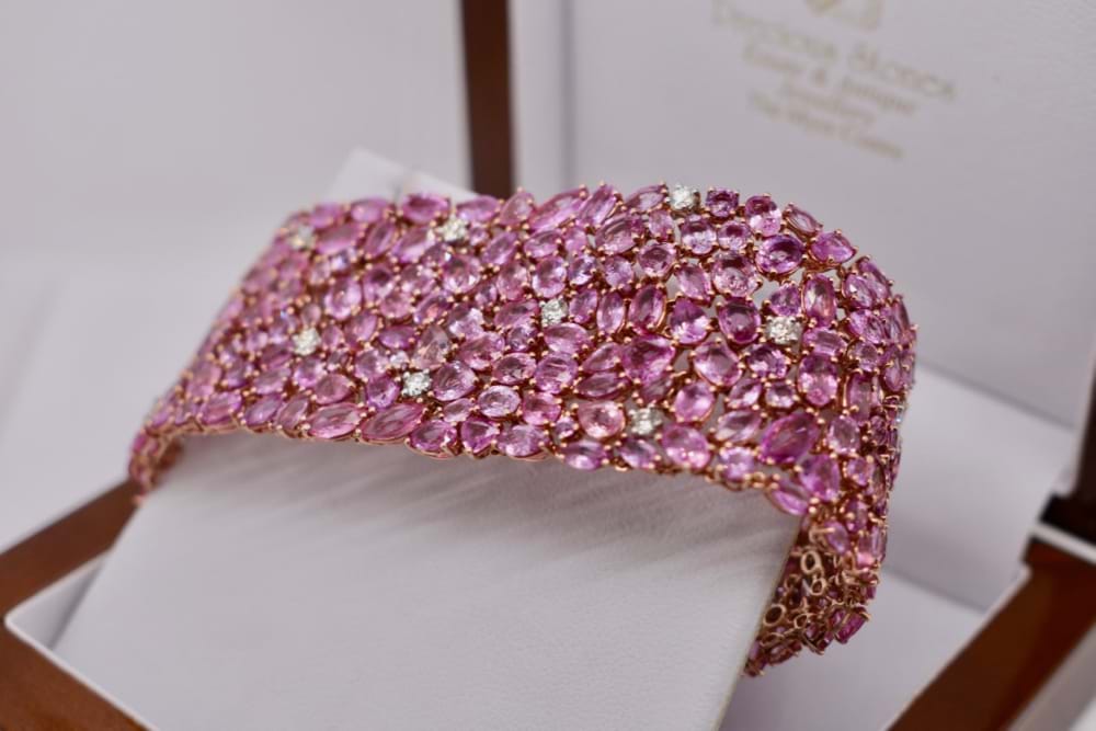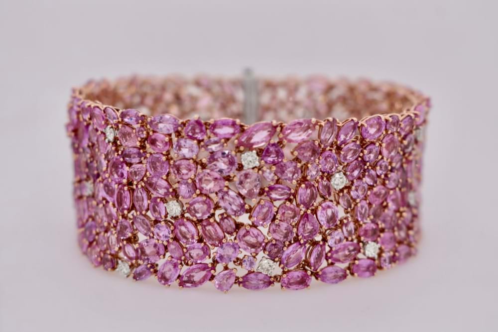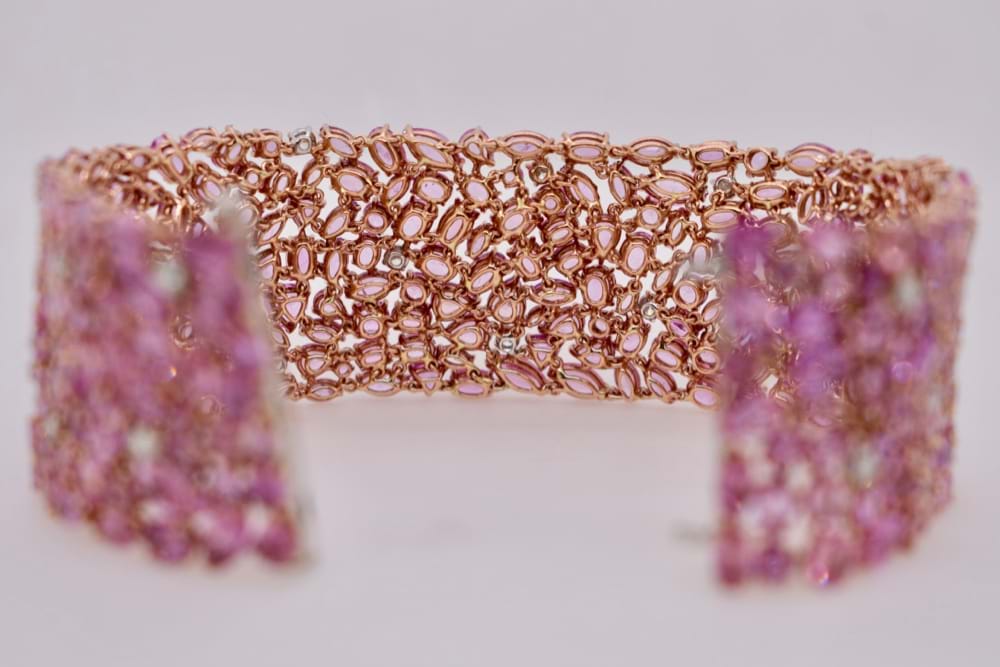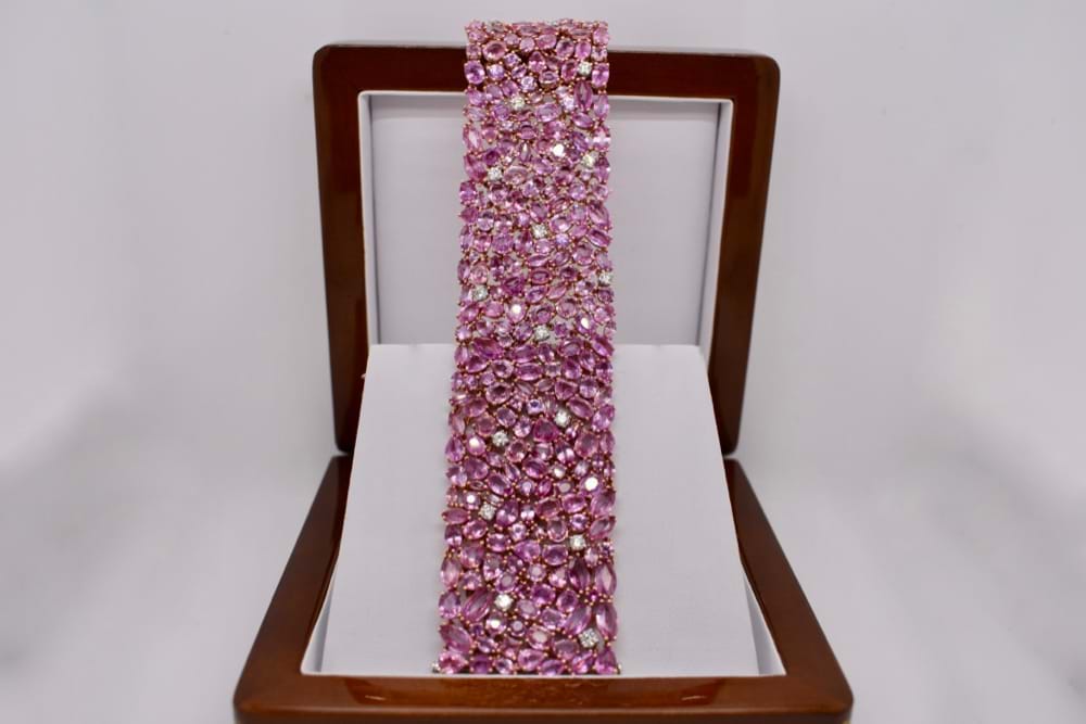 This dazzling, opulent bracelet is set in 18ct rose gold with a total of 363 stones in various shapes and cuts. The Sapphire colours range from light to mid pink, with a massive total of 341 equalling 70.43ct. Scattered throughout the design are 22 Diamonds which equal 1.40ct. The bracelet is 28mm wide with a concealed clasp, making this an incredible statement piece