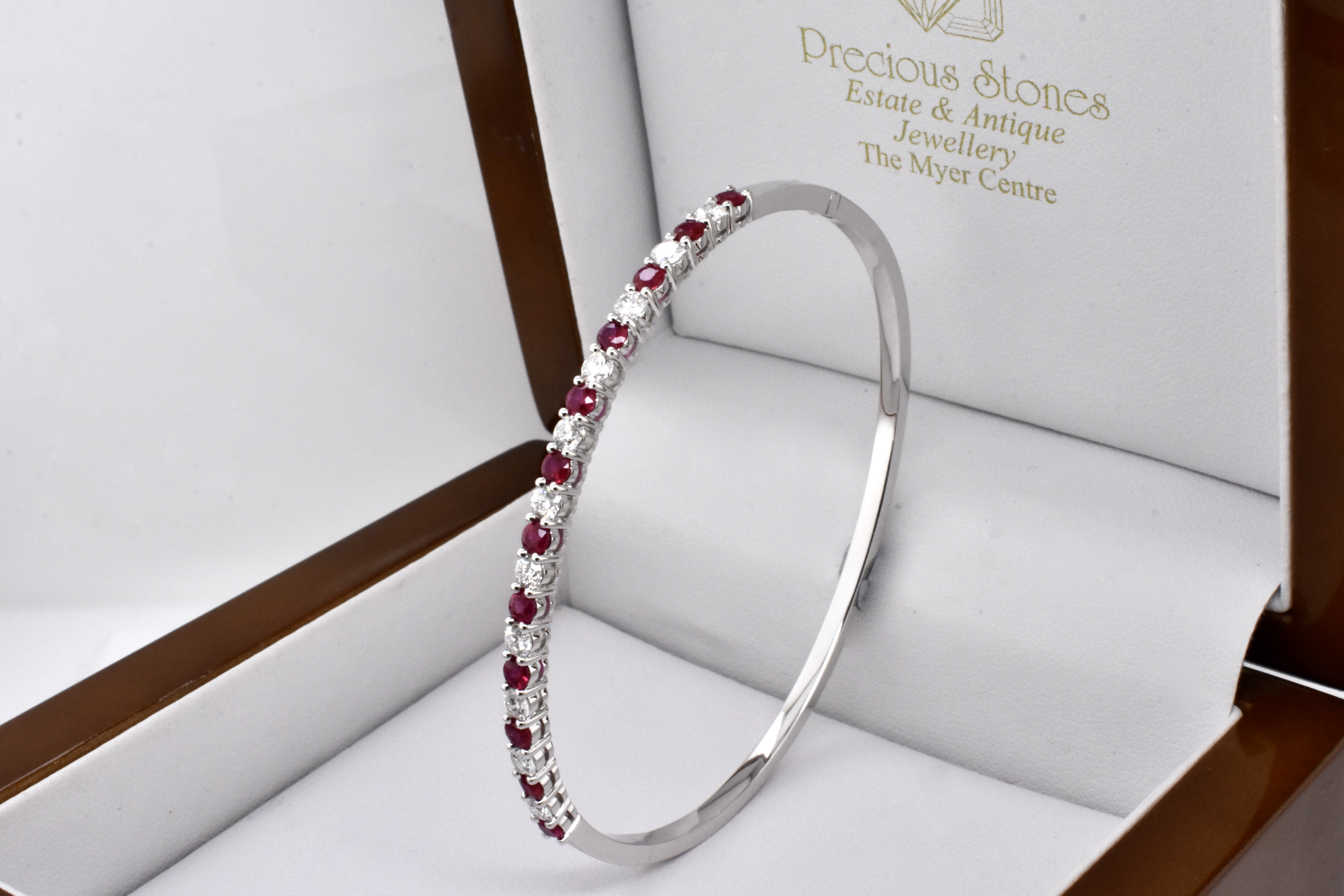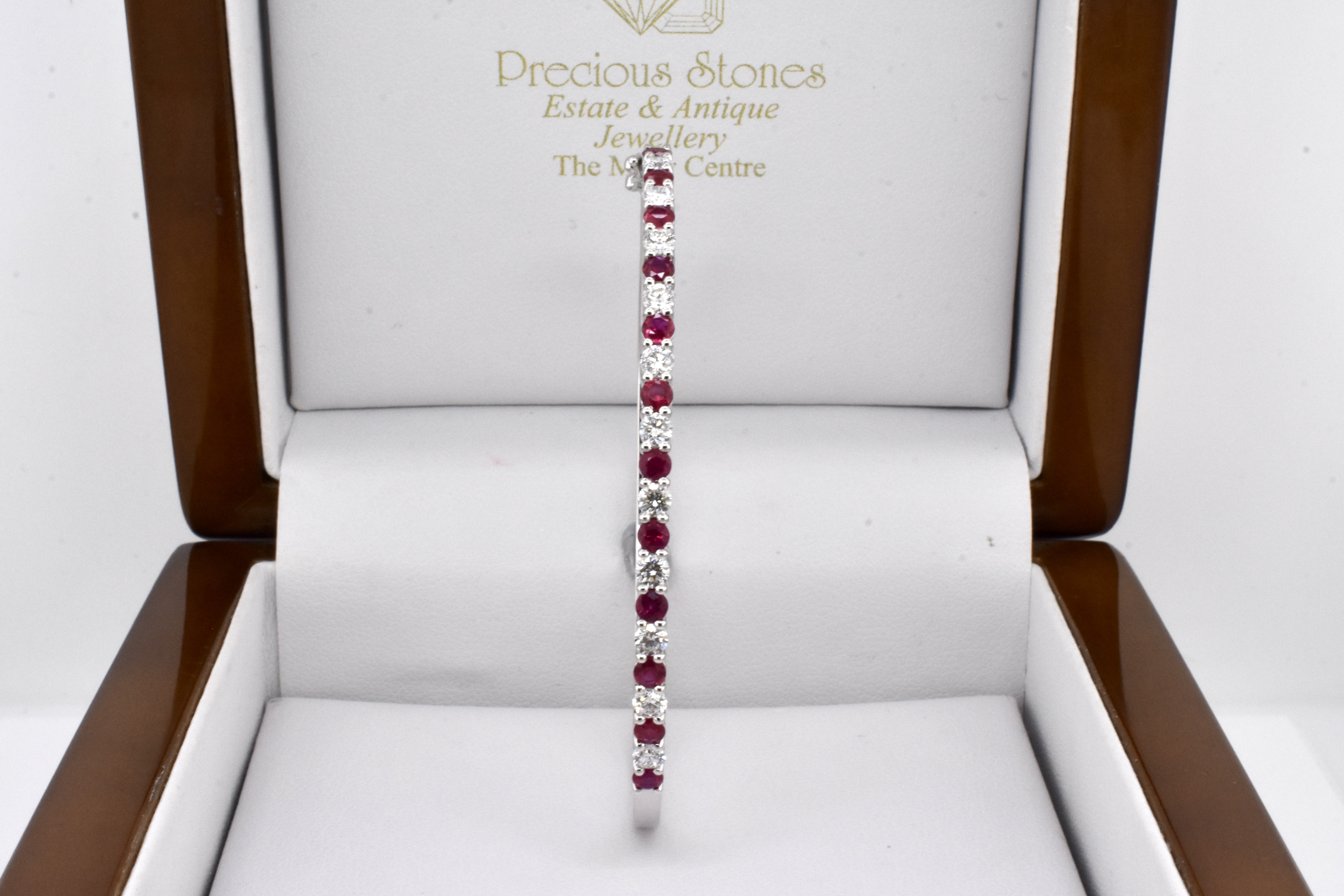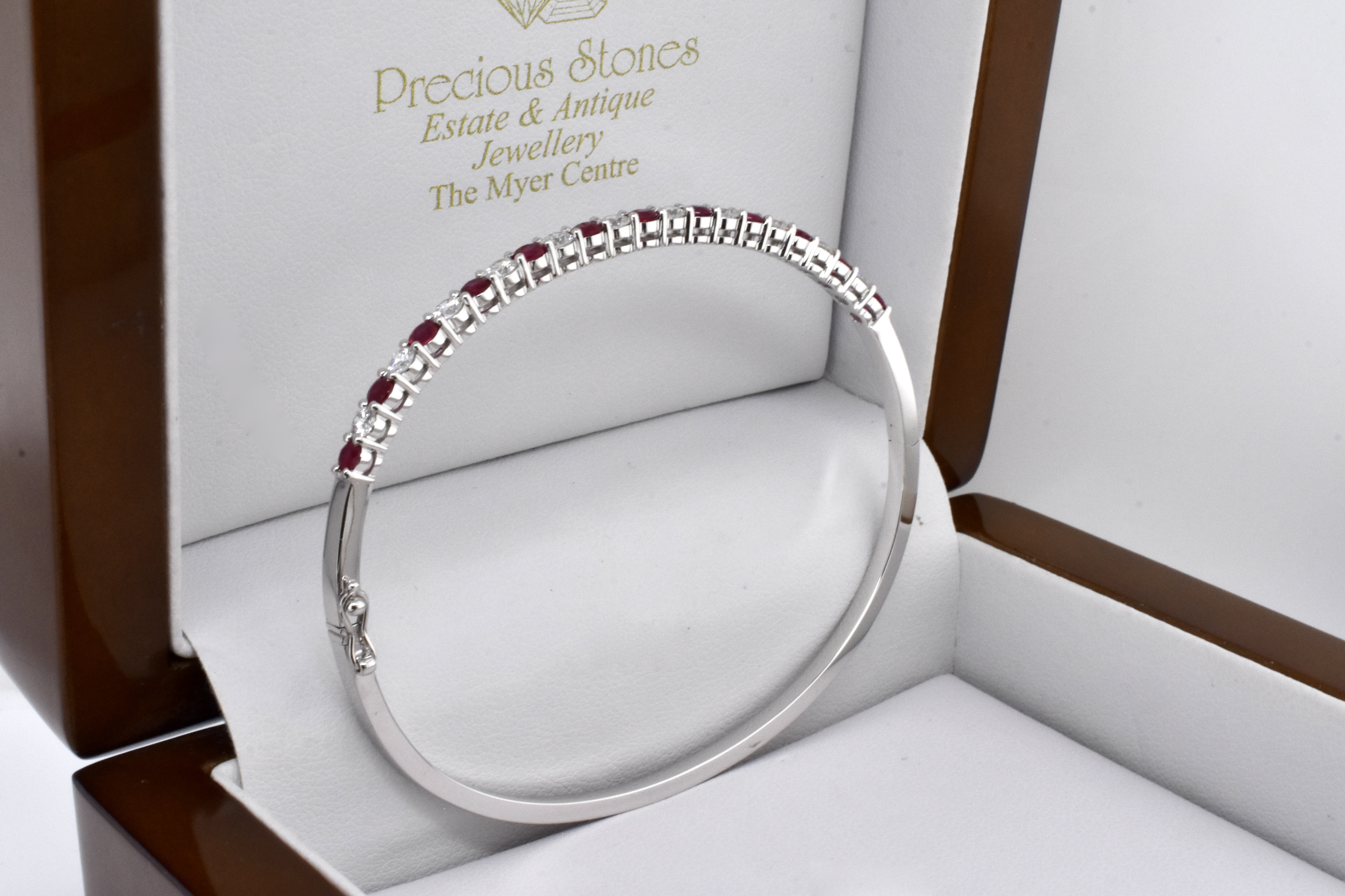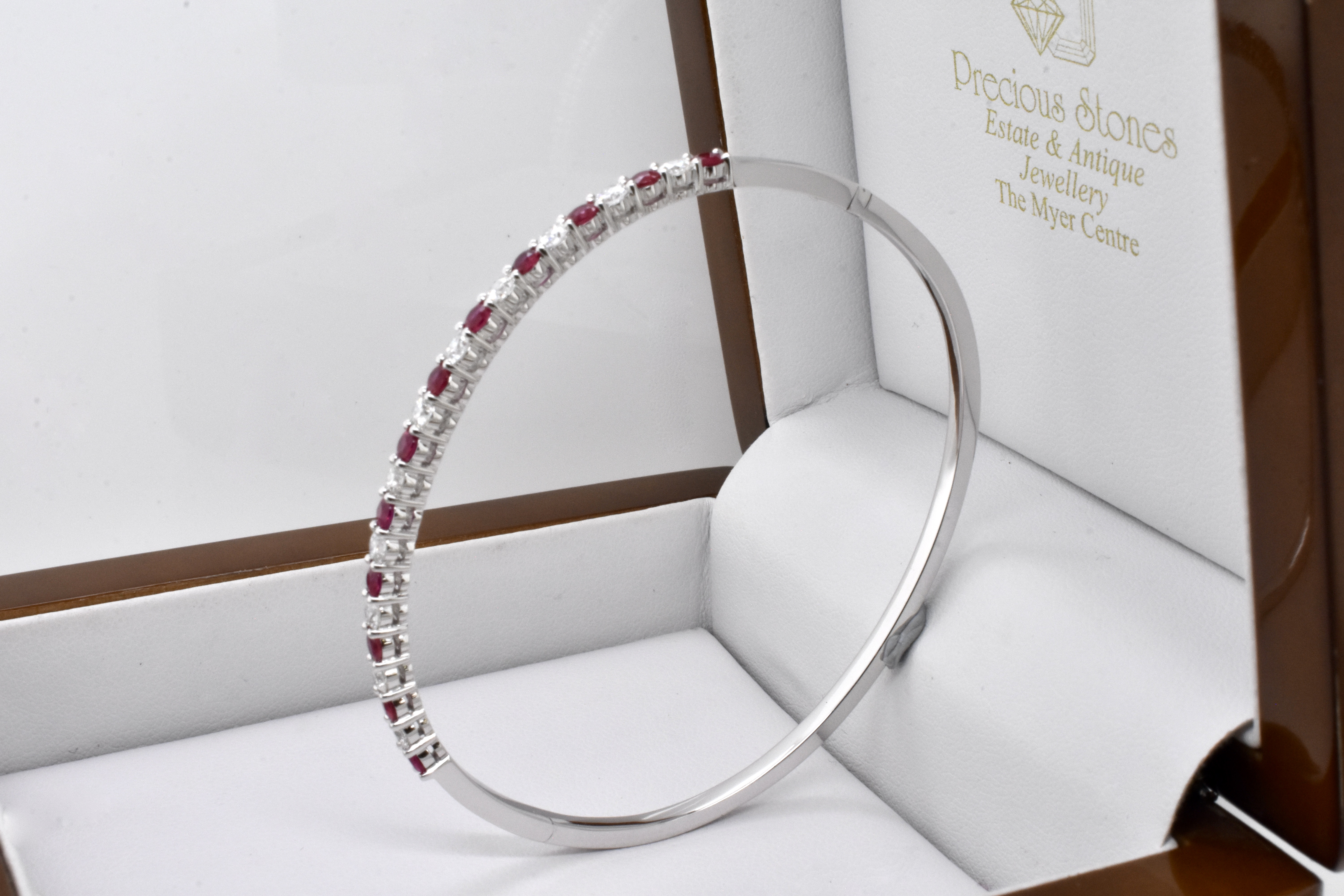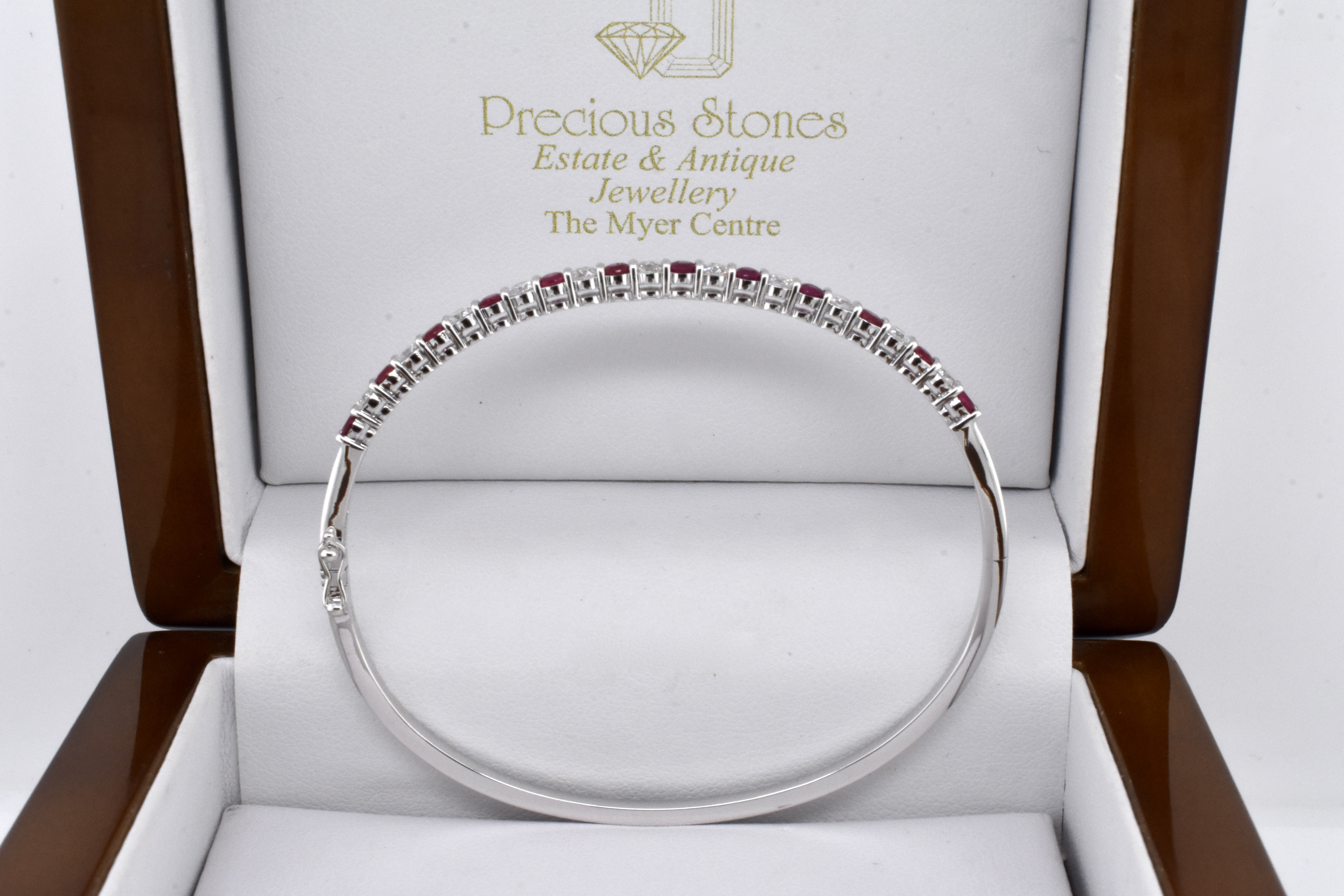 A stunning 18ct white gold oval shaped hinged bangle, with alternating round mid red rubies and twinkling RBC diamonds. There is a total of 12 rubies equalling 1.07ct and 11 diamonds totalling 0.89ct FG/VS. Bangle is 2mm wide, with a concealed clasp and secure figure of 8 catch
