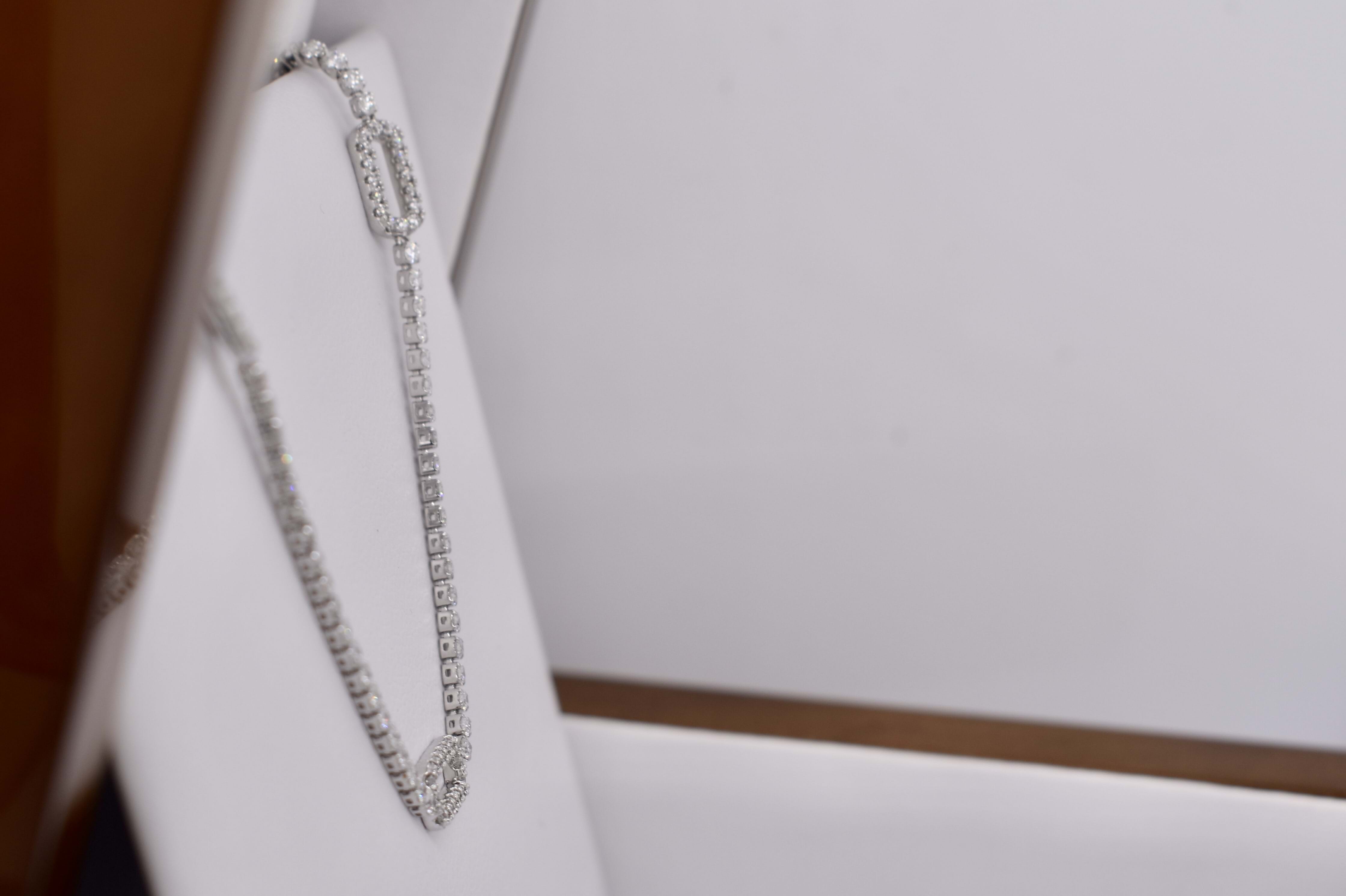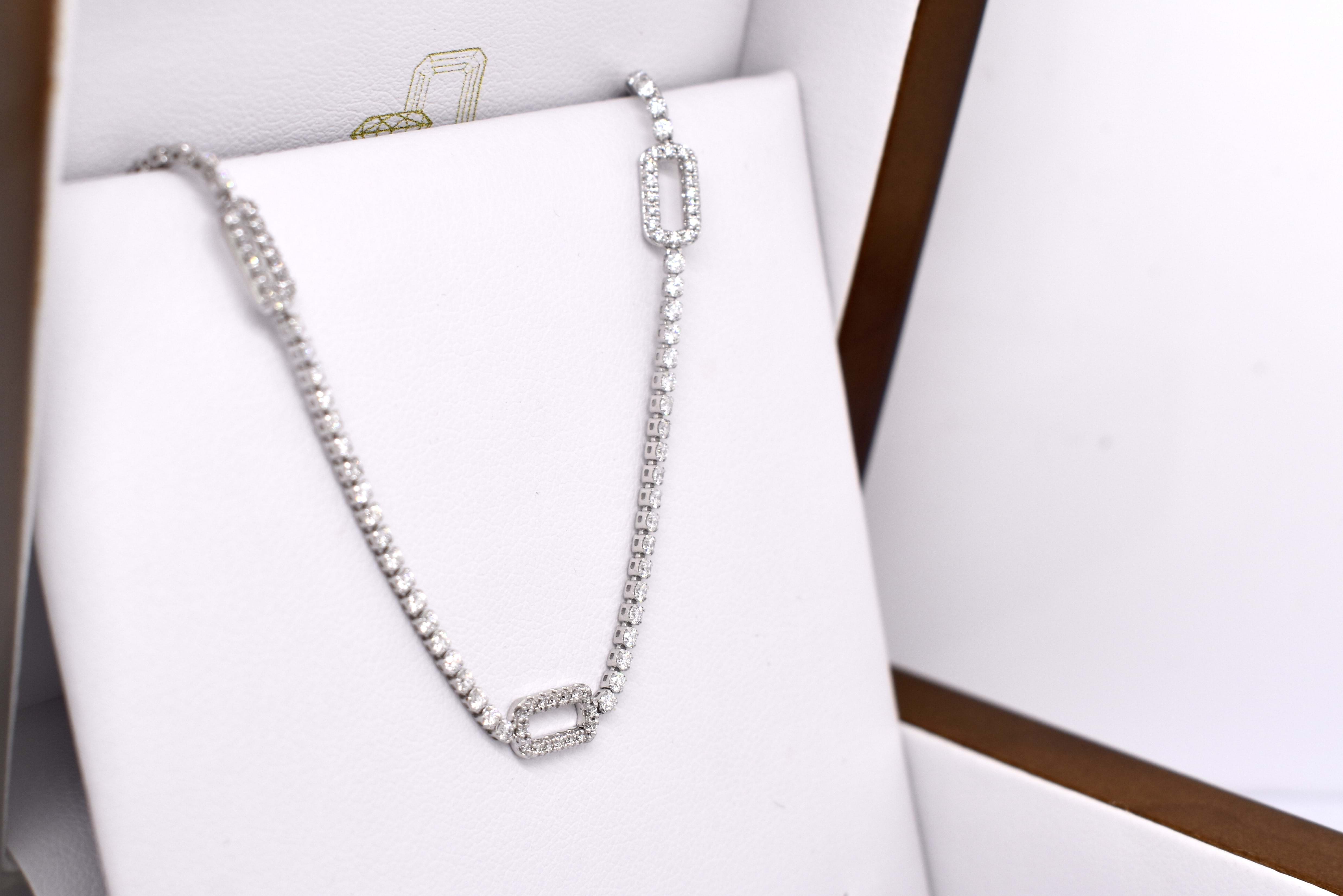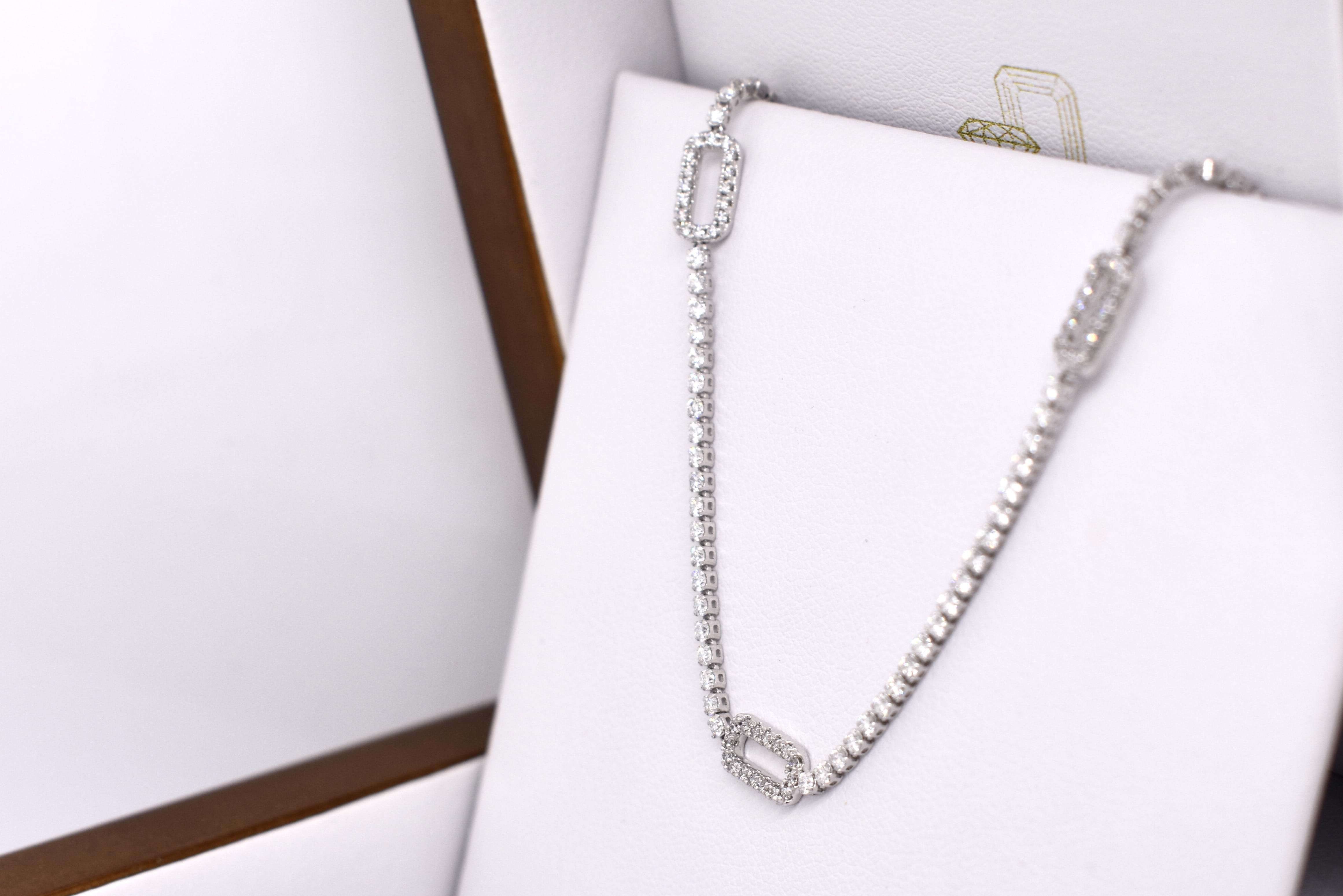 Pretty and shiny, this 18ct white gold stationed oval 'paperclip' link tennis bracelet features 122 round brilliant cut diamonds, totalling 1.20ct G SI1. Measuring 17cm long, this bracelet is completed with a lobster claw clasp. Independent Valuation available upon purchase.