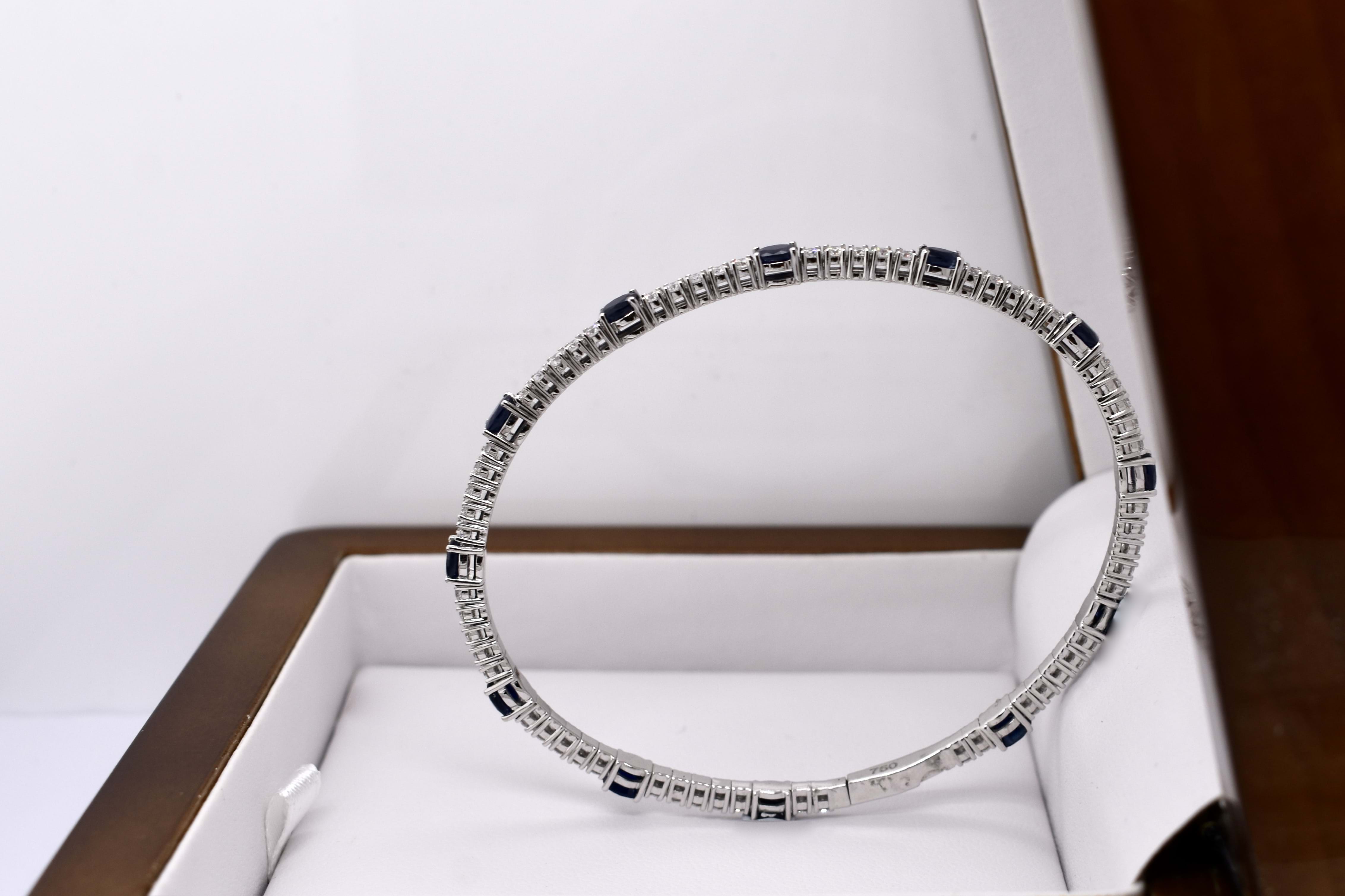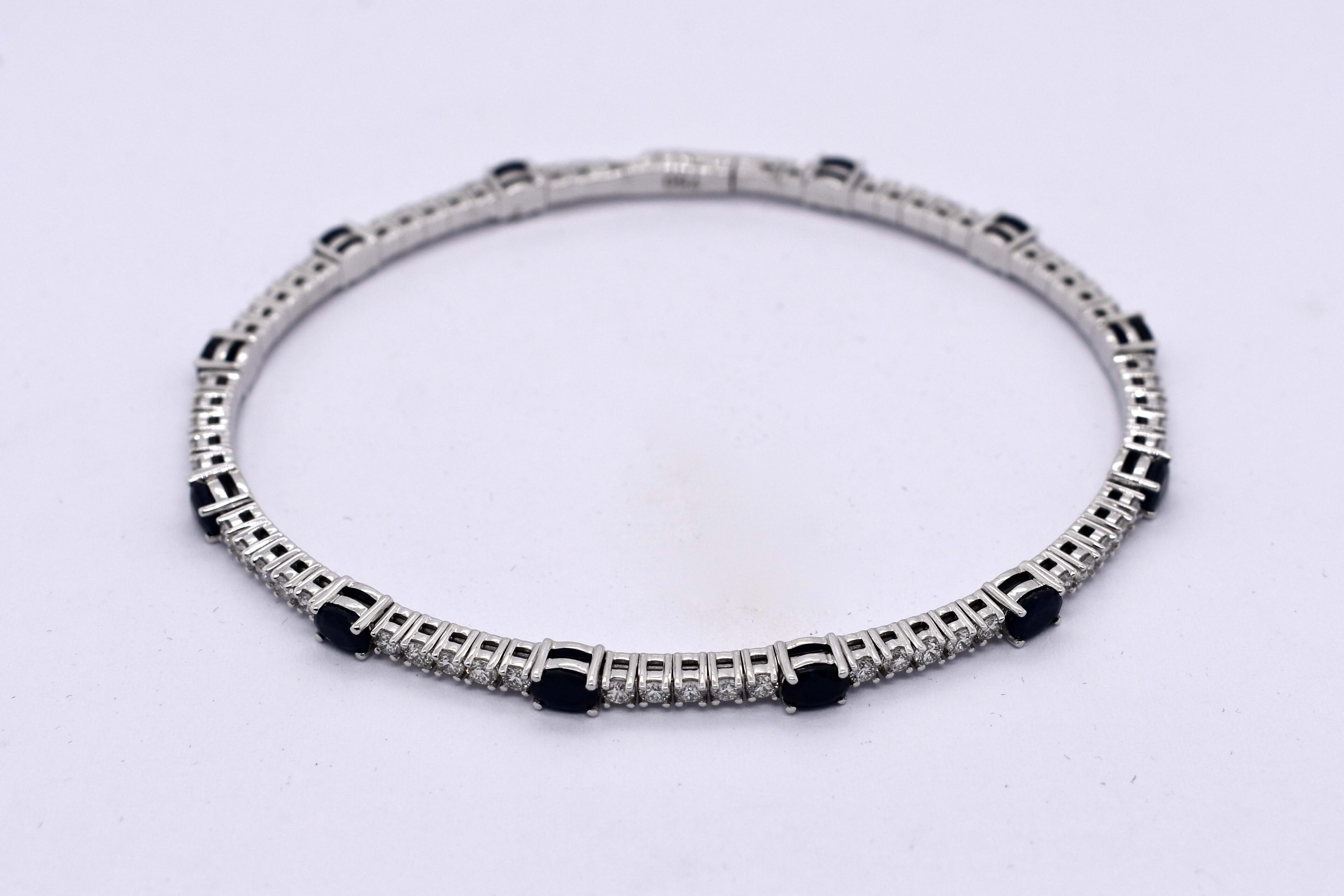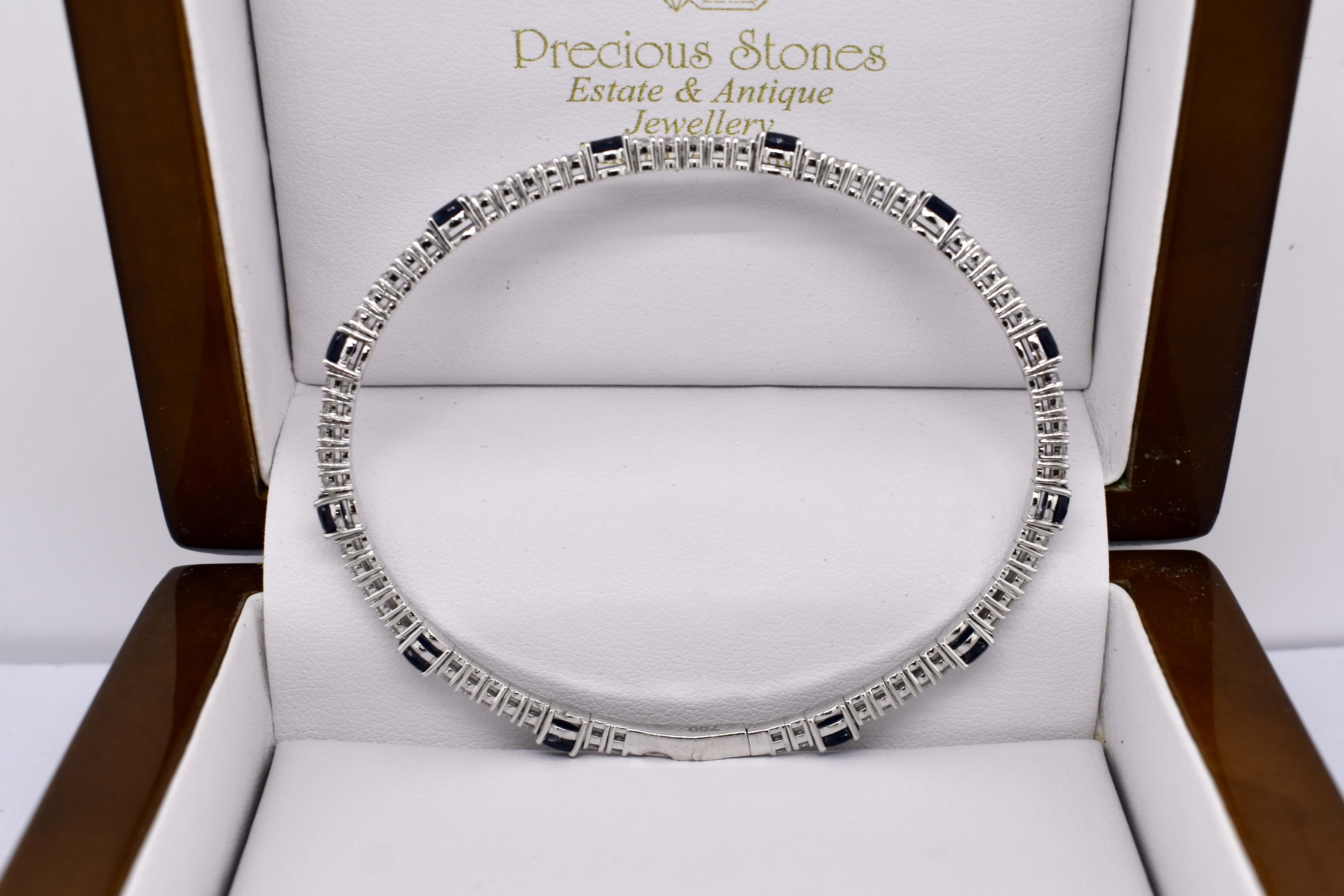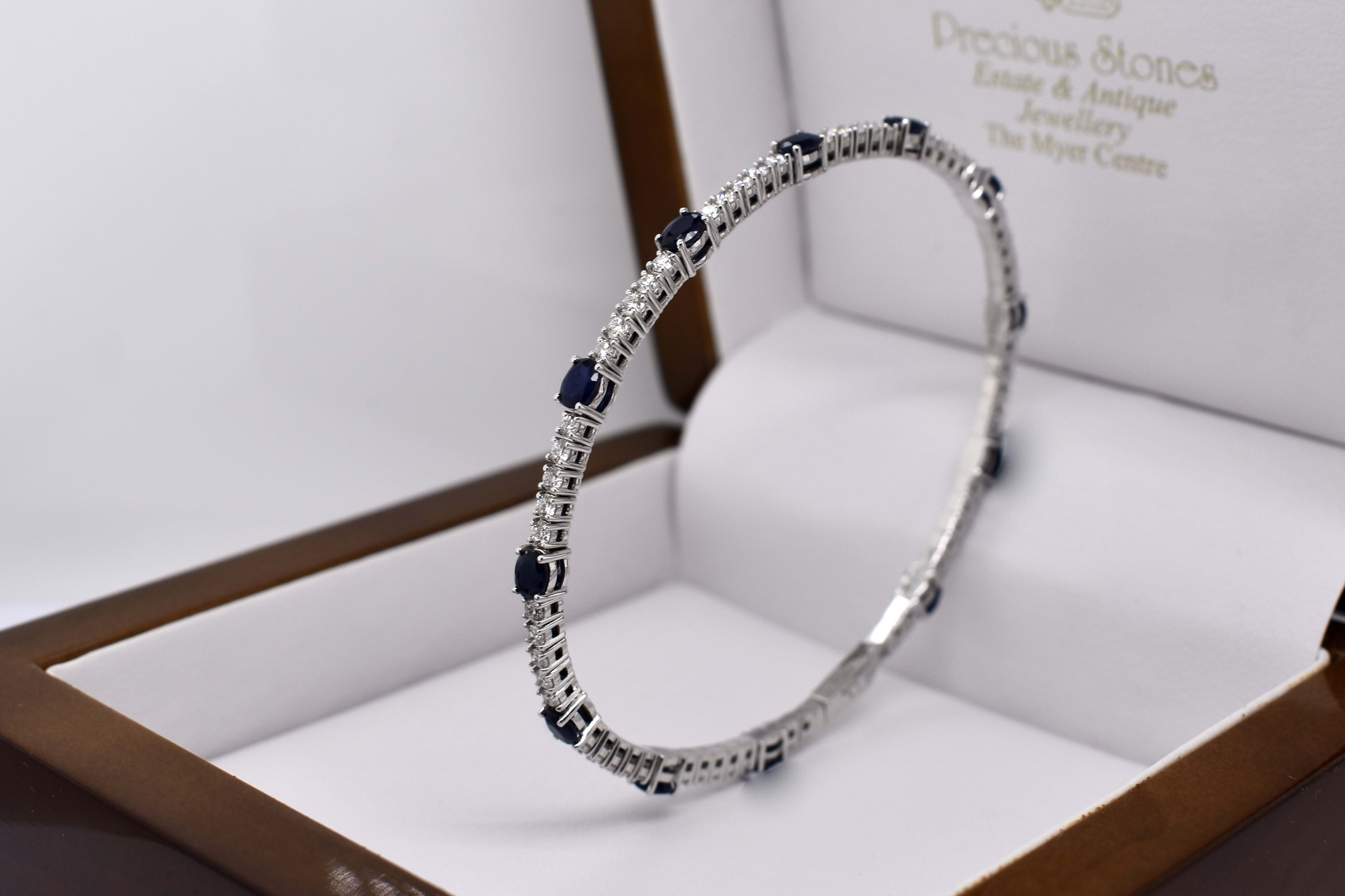 This lovely bangle is crafted in 18ct white gold and features 59 round brilliant cut diamonds set four claw set in rows of five, totalling 1.60ct G SI1. With an oval dark blue sapphire stationed around the bangle, four claw set, alternating with the five diamonds. With a total sapphire weight of 3.17ct. Bangle is slightly flexible allowing it to fit well on the wrist and has a hand size of 60mm. Completed with a box clasp. Independent Valuation available upon purchase.