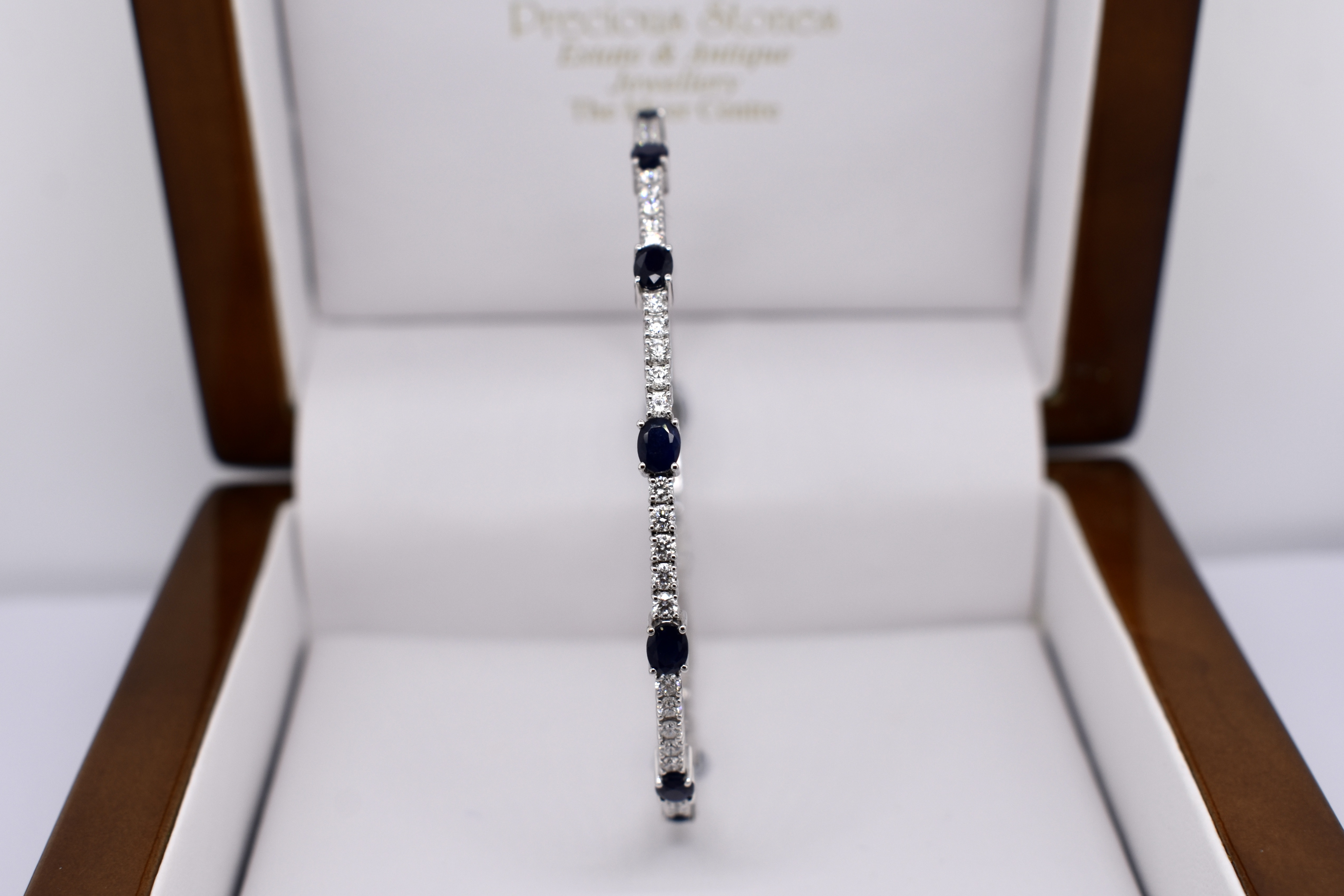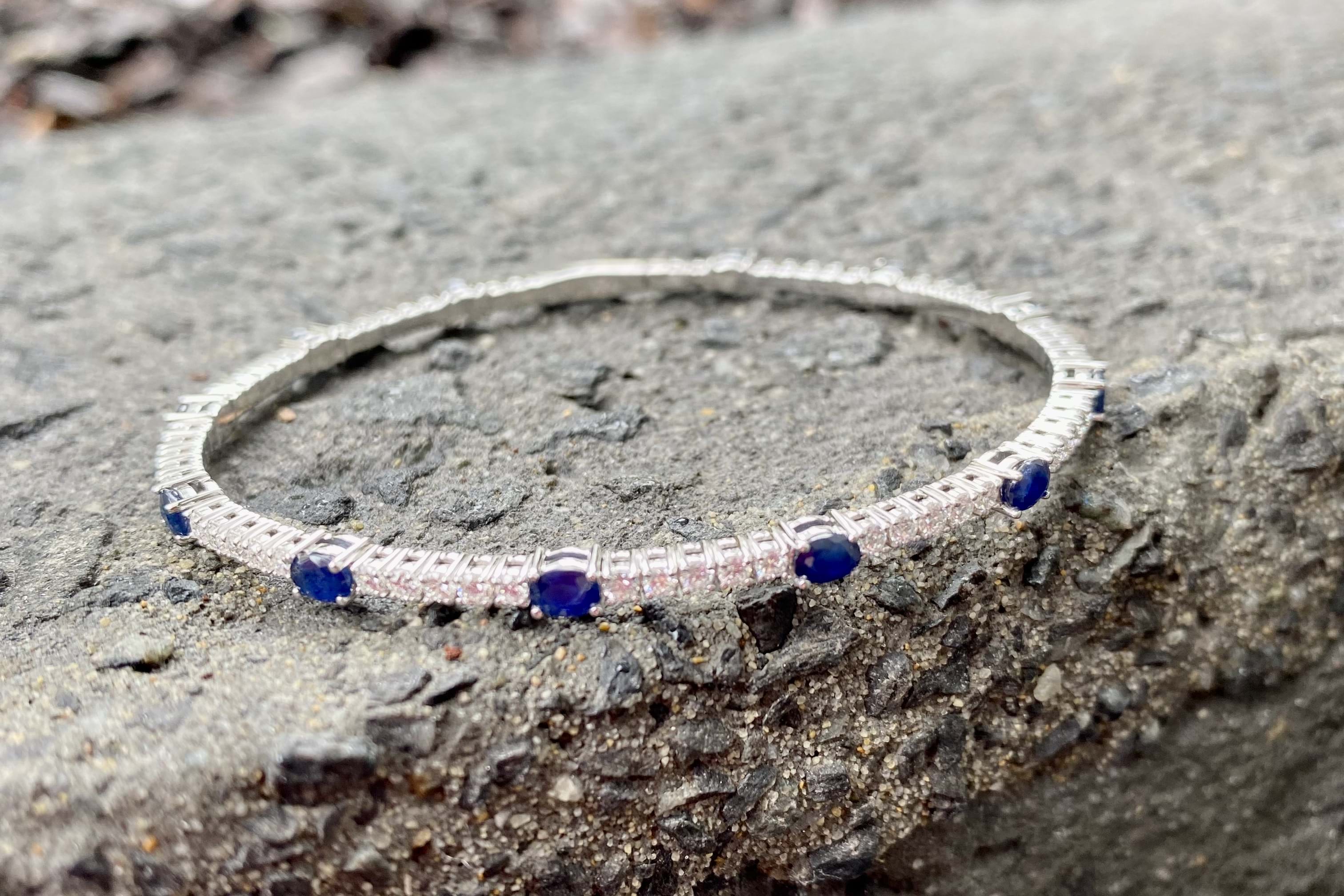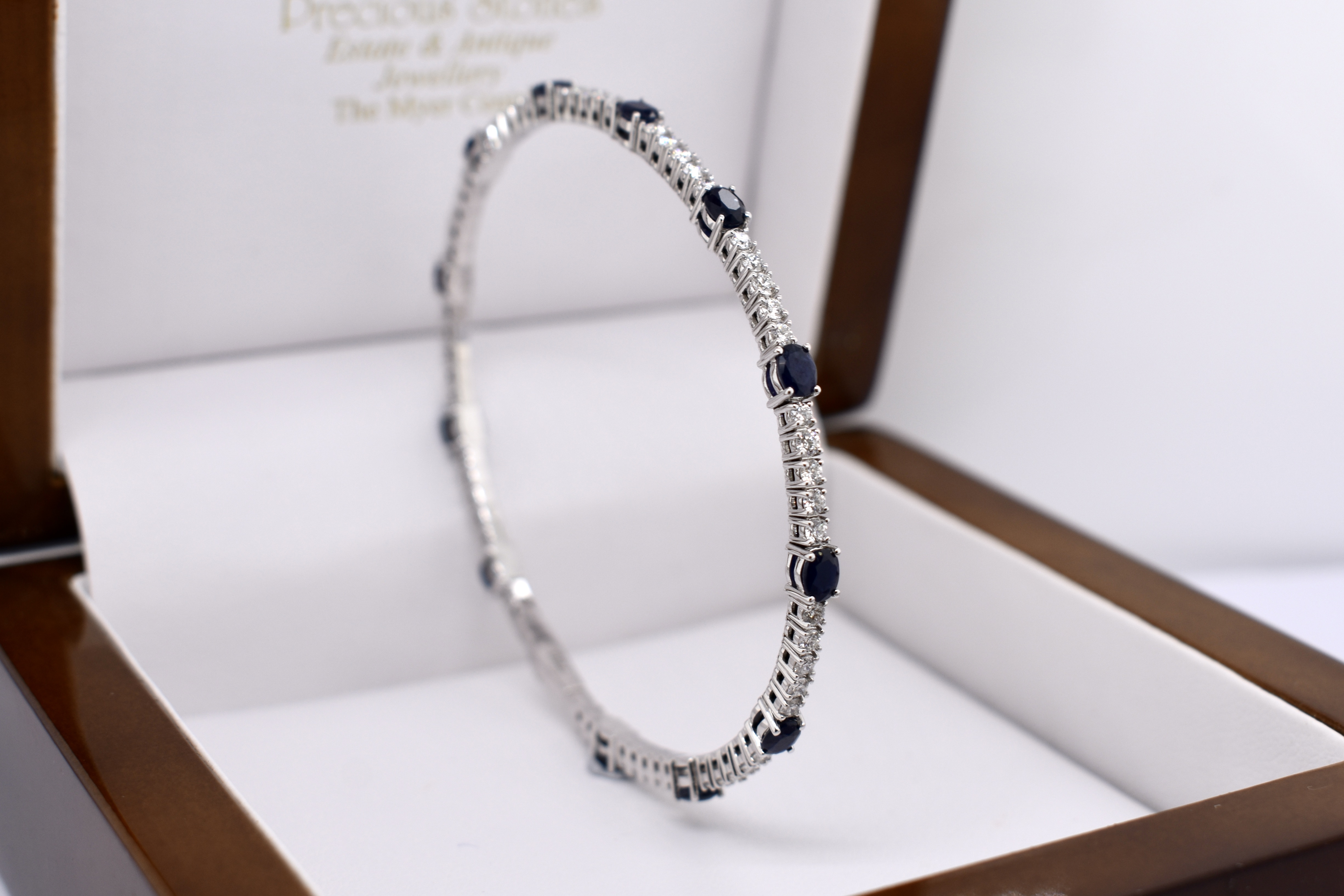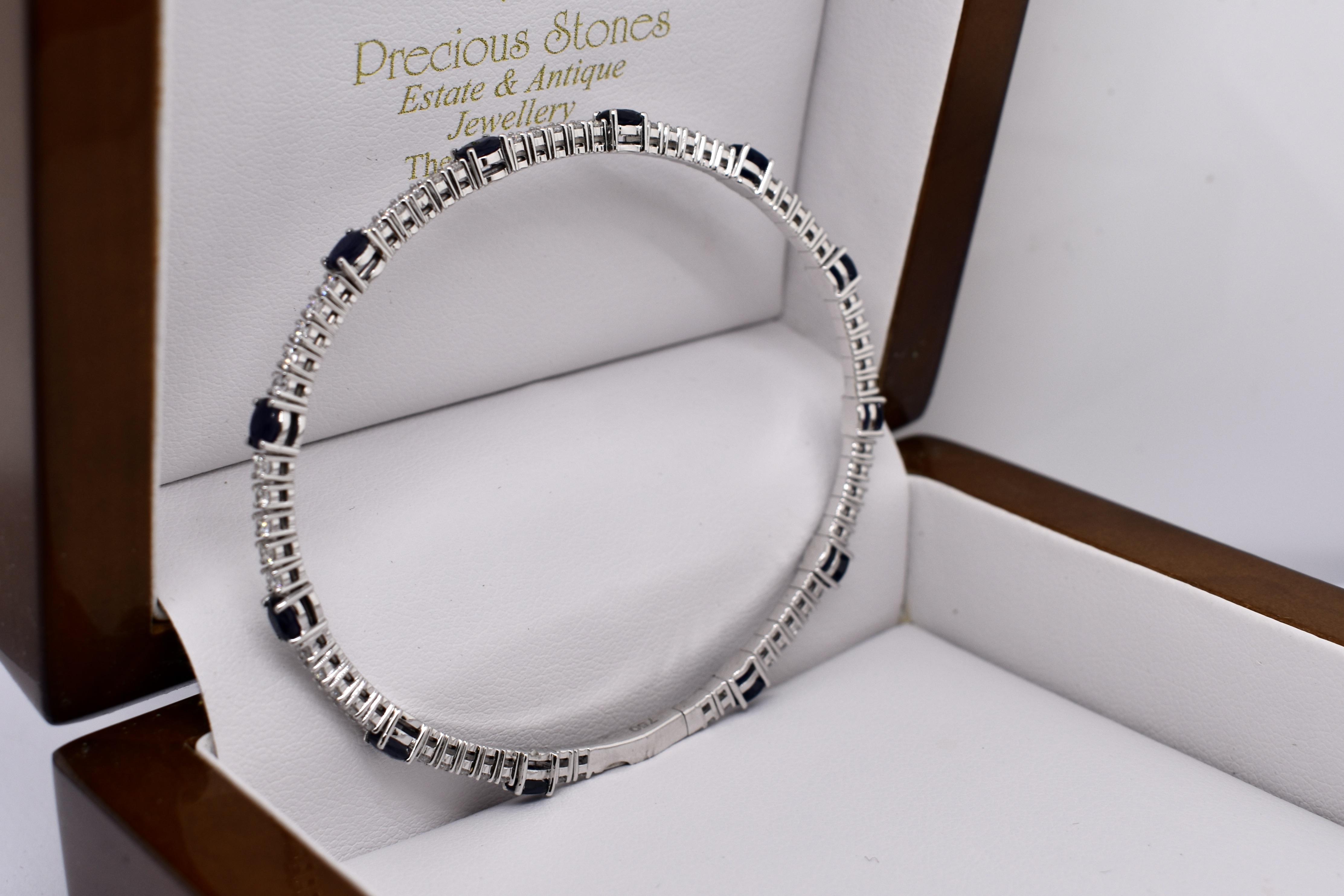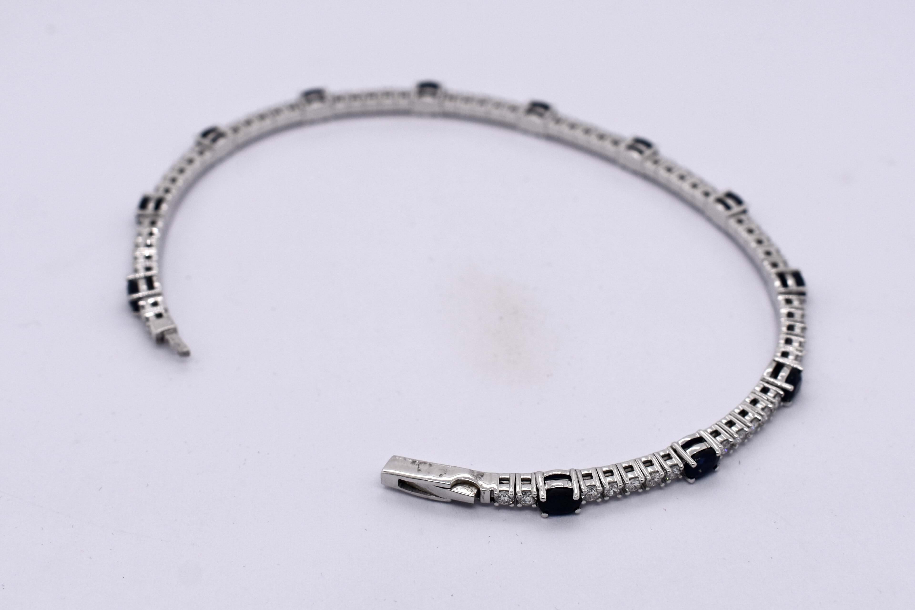 This lovely bangle is crafted in 18ct white gold and features 59 round brilliant cut diamonds set four claw set in rows of five, totalling 1.60ct G SI1. With an oval dark blue sapphire stationed around the bangle, four claw set, alternating with the five diamonds. With a total sapphire weight of 3.17ct. Bangle is slightly flexible allowing it to fit well on the wrist and has a hand size of 60mm. Completed with a box clasp. Independent Valuation available upon purchase.