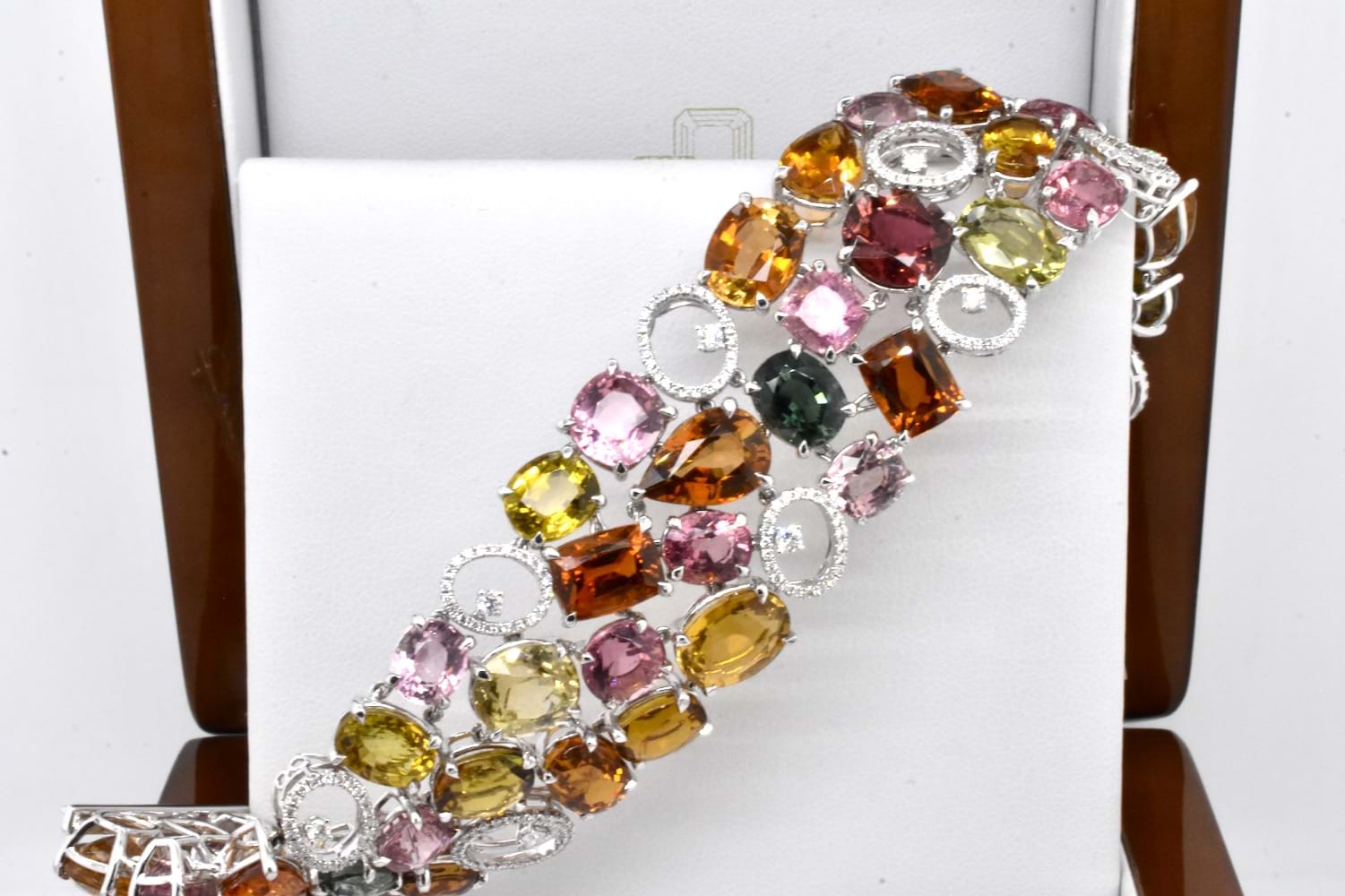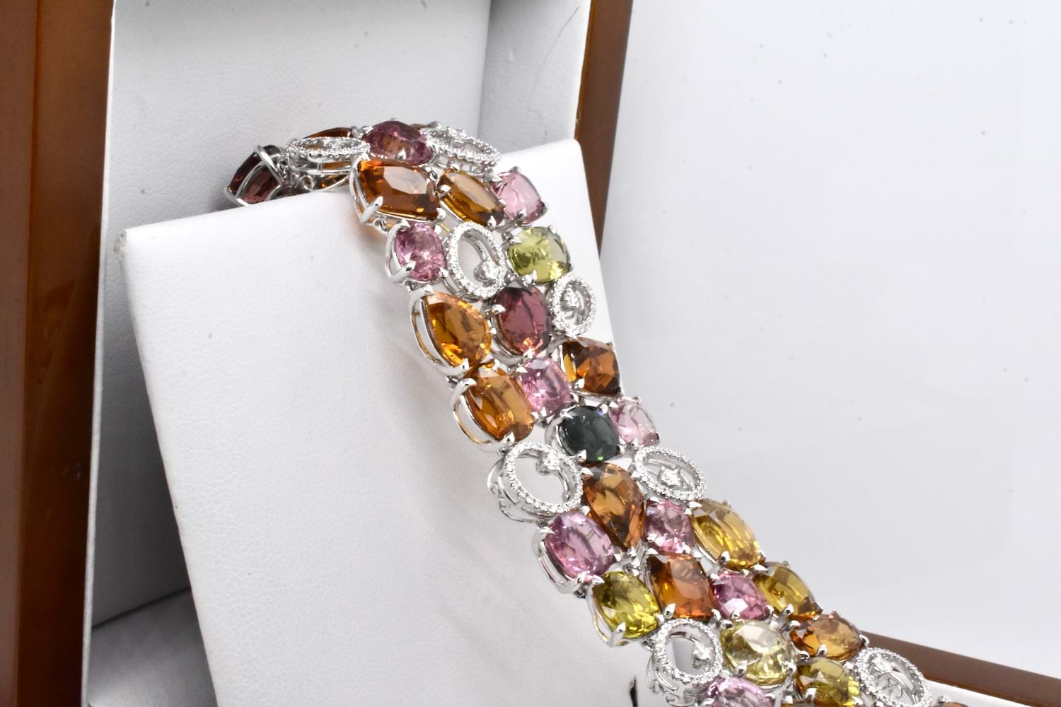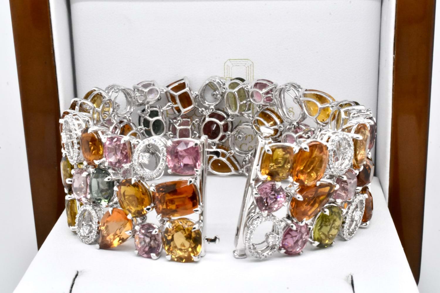 This stunning multicoloured bracelet is crafted in 18ct white gold and has over 100 carats of tourmalines in tones of pink, green, orange, yellow and green in oval, pear, square cushion and rectangular cushion cuts, claw set and complemented by shimmering oval halos of diamonds at irregular intervals. Total of 54 tourmalines equalling 111.34ct and 340 diamonds equalling 1.69ct G/VS-SI, bracelet is approx. 25mm wide and is 18cm long