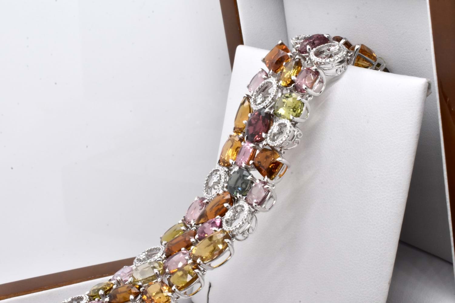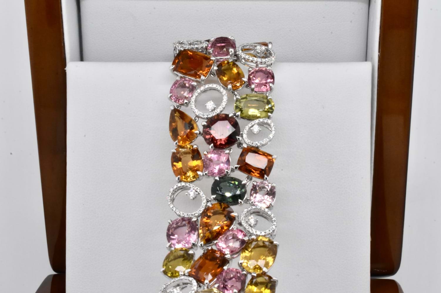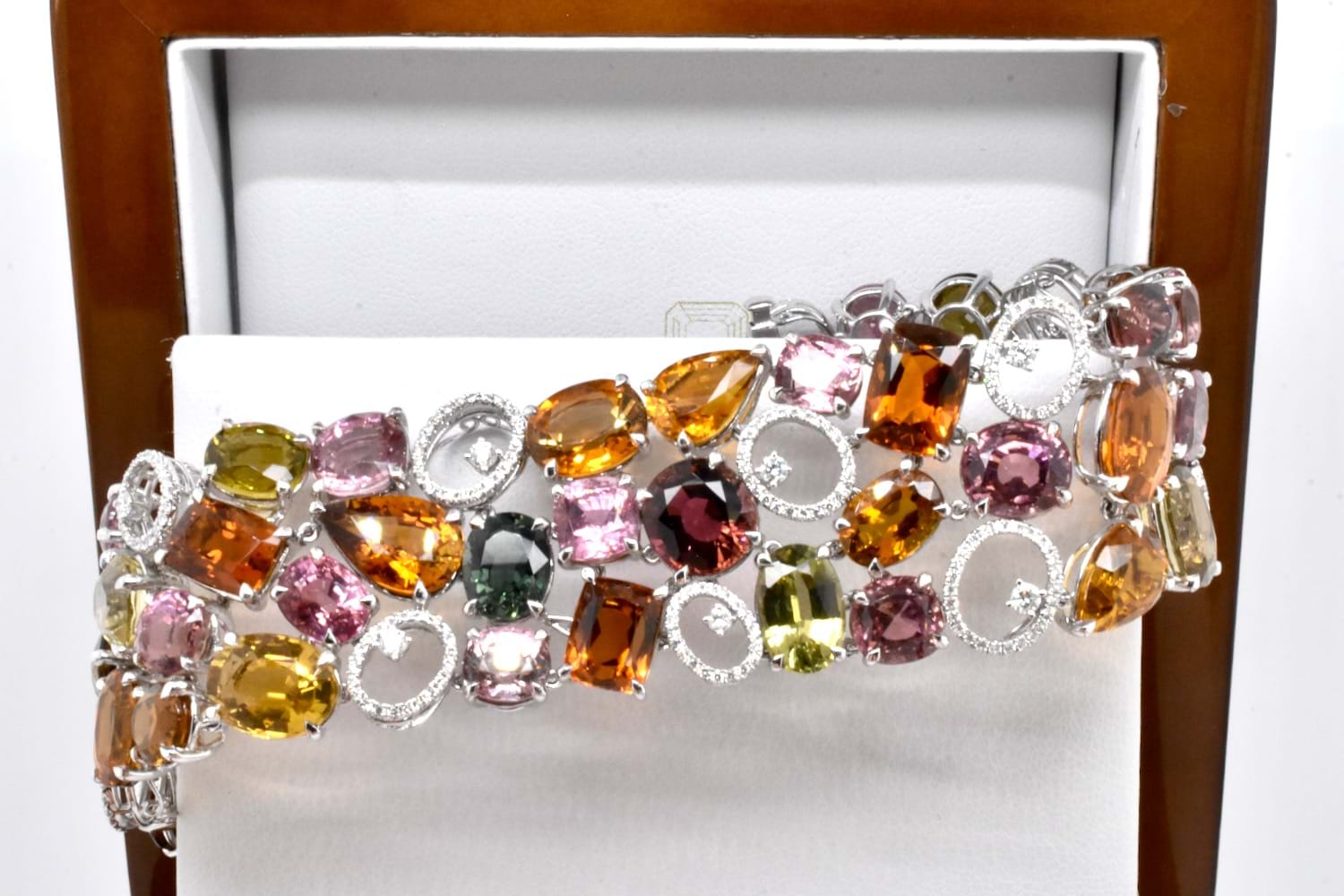 This stunning multicoloured bracelet is crafted in 18ct white gold and has over 100 carats of tourmalines in tones of pink, green, orange, yellow and green in oval, pear, square cushion and rectangular cushion cuts, claw set and complemented by shimmering oval halos of diamonds at irregular intervals. Total of 54 tourmalines equalling 111.34ct and 340 diamonds equalling 1.69ct G/VS-SI, bracelet is approx. 25mm wide and is 18cm long
