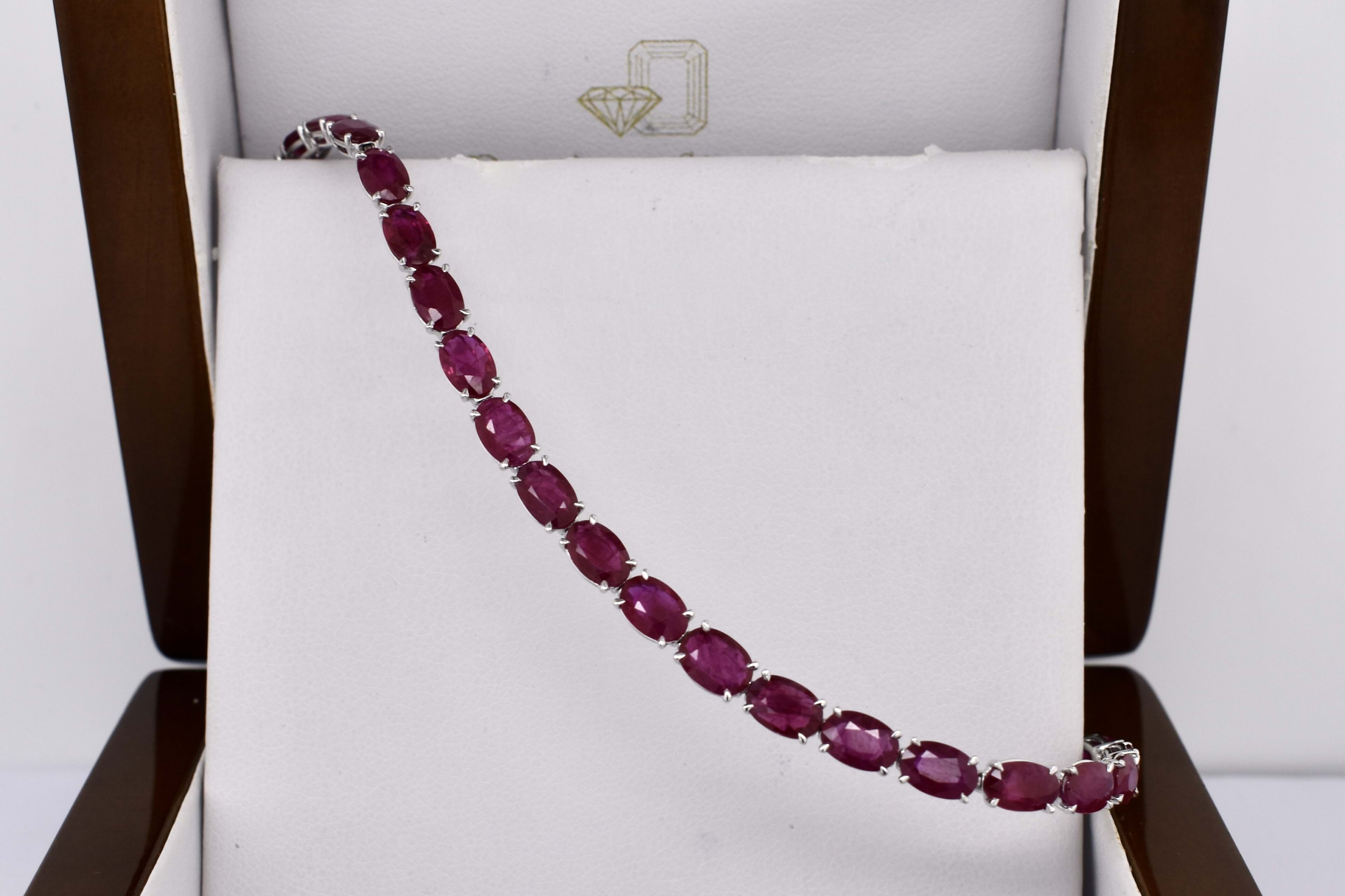 This beautiful bracelet is crafted in 18ct white gold, featuring twenty eight oval mid-dark slightly pinkish rubies, measuring 6.15x4.30-6.05x3.95mm and totalling 13.24ct. Each ruby is four claw set in a line, with a concealed box clasp and two figure of eight safety catches. Bracelet measures 18cm long and weighs 9.54 grams. Perfect worn alone or in an epic stack. Independent Valuation Supplied.
