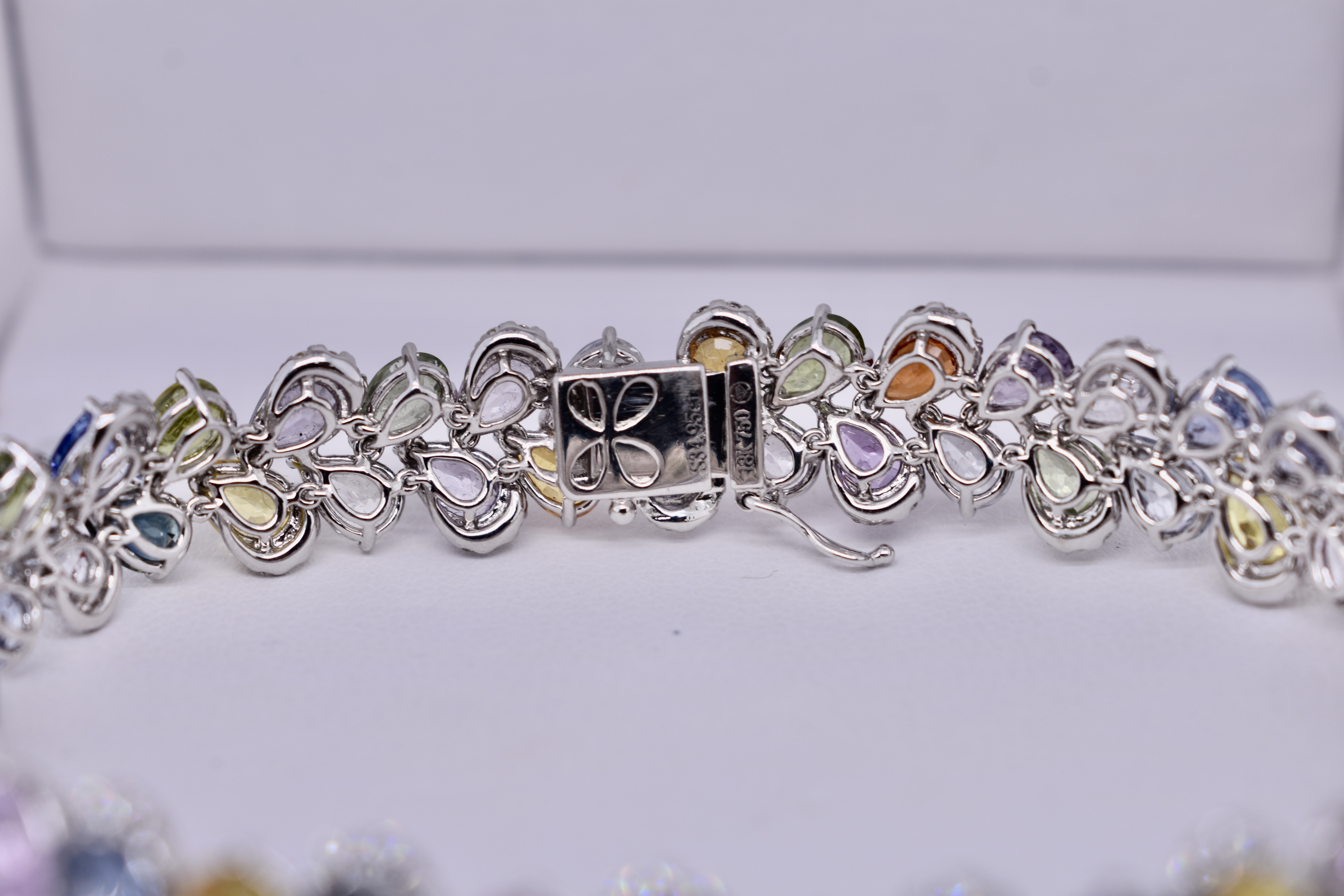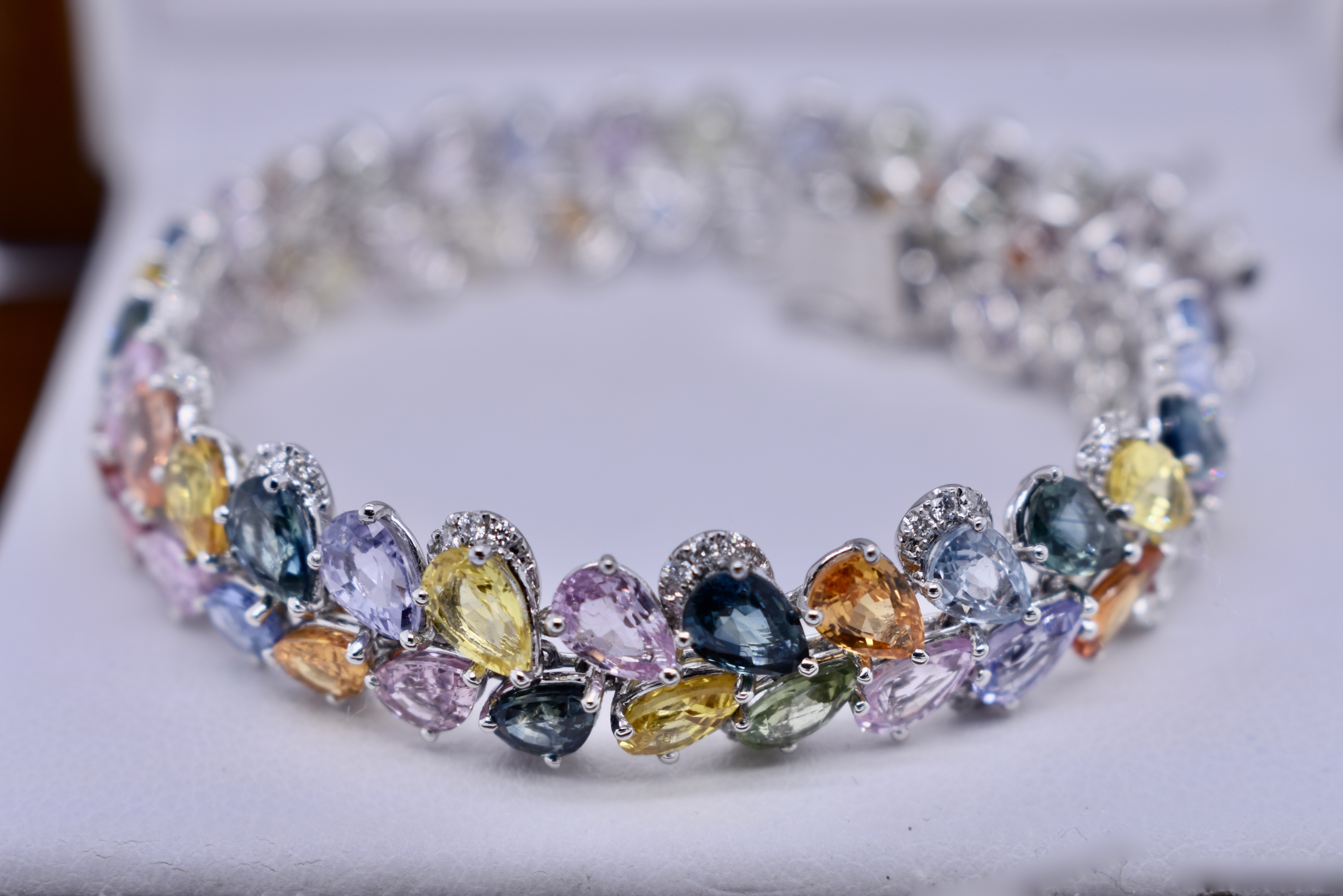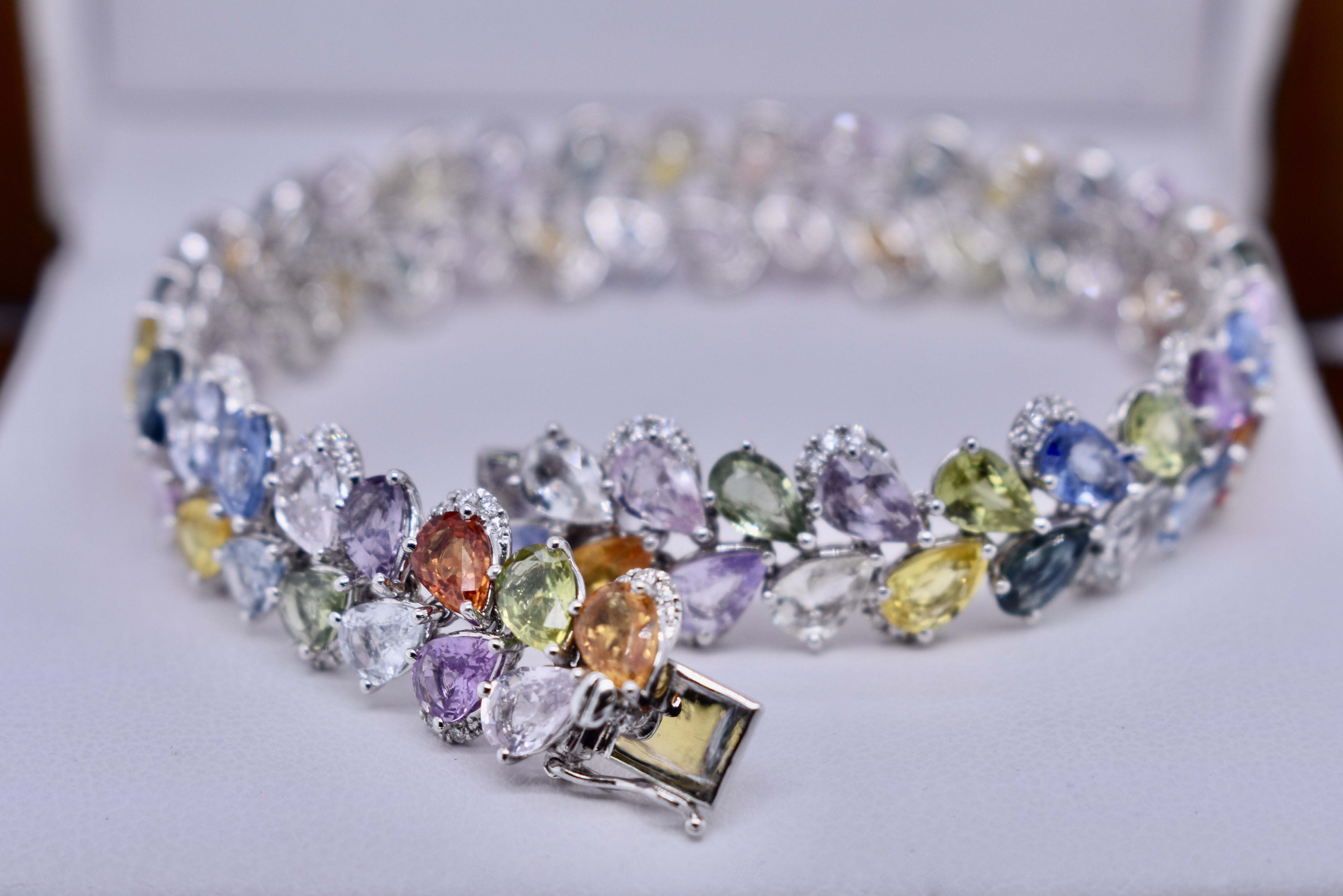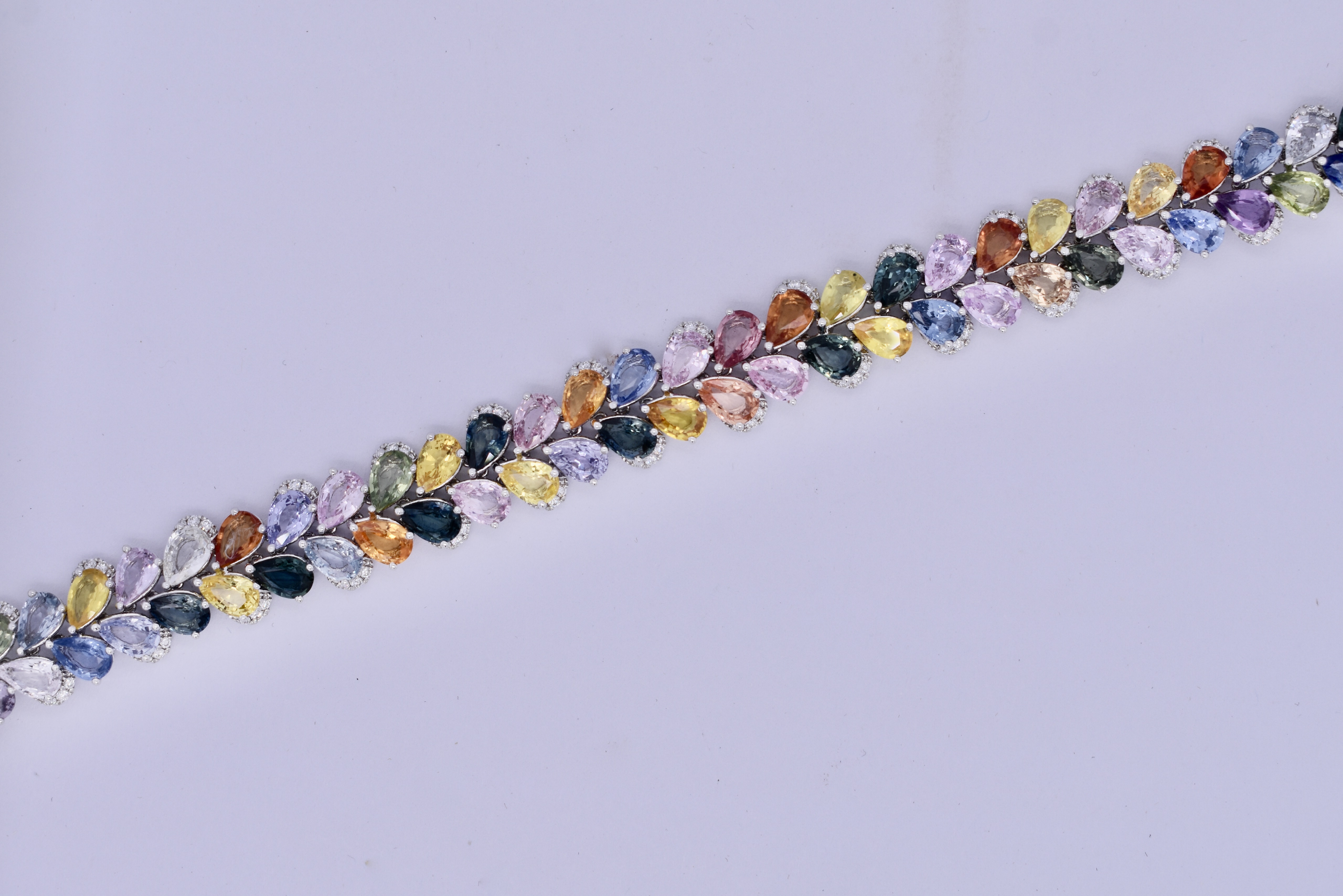This wonderfully colourful 18ct white gold articulated bracelet, contains an array of different coloured pear shaped sapphires, including blue, yellow, purple, pink, teal and orange. With complements of shimmering diamonds micro pave set throughout. The 72 sapphires measure an average of 6x4mm and total 34.95ct. Total of 108 round brilliant cut 1.1-1.2mm diamonds equalling 0.68ct G VS-SI. Finished with a concealed box clasp and a figure 8 catch for extra security. Bracelet is 18.0cm long. Independent Valuation Supplied