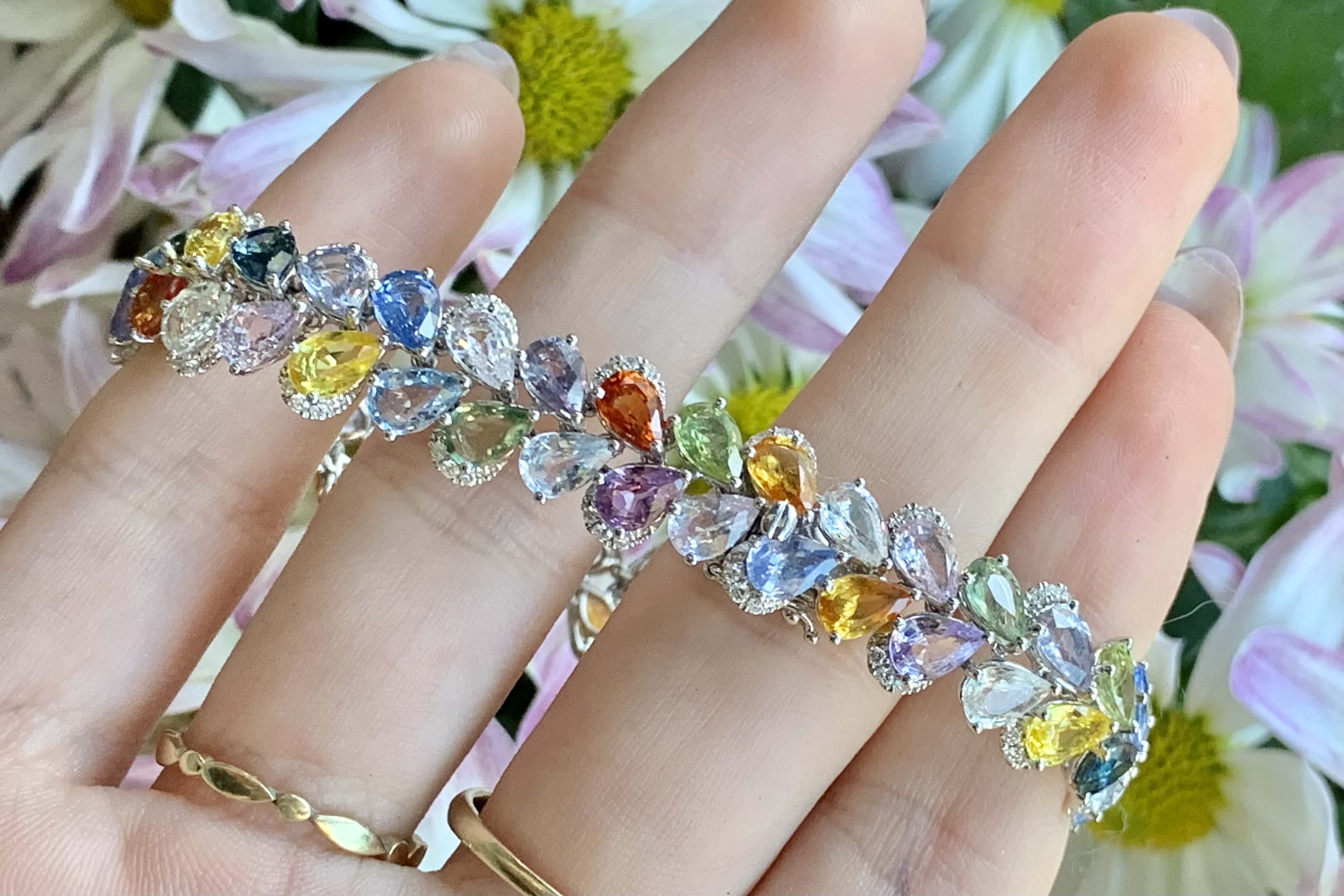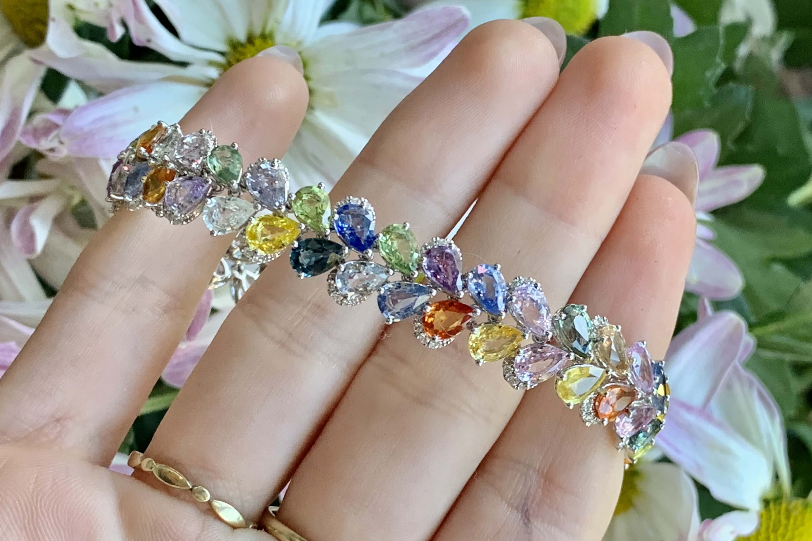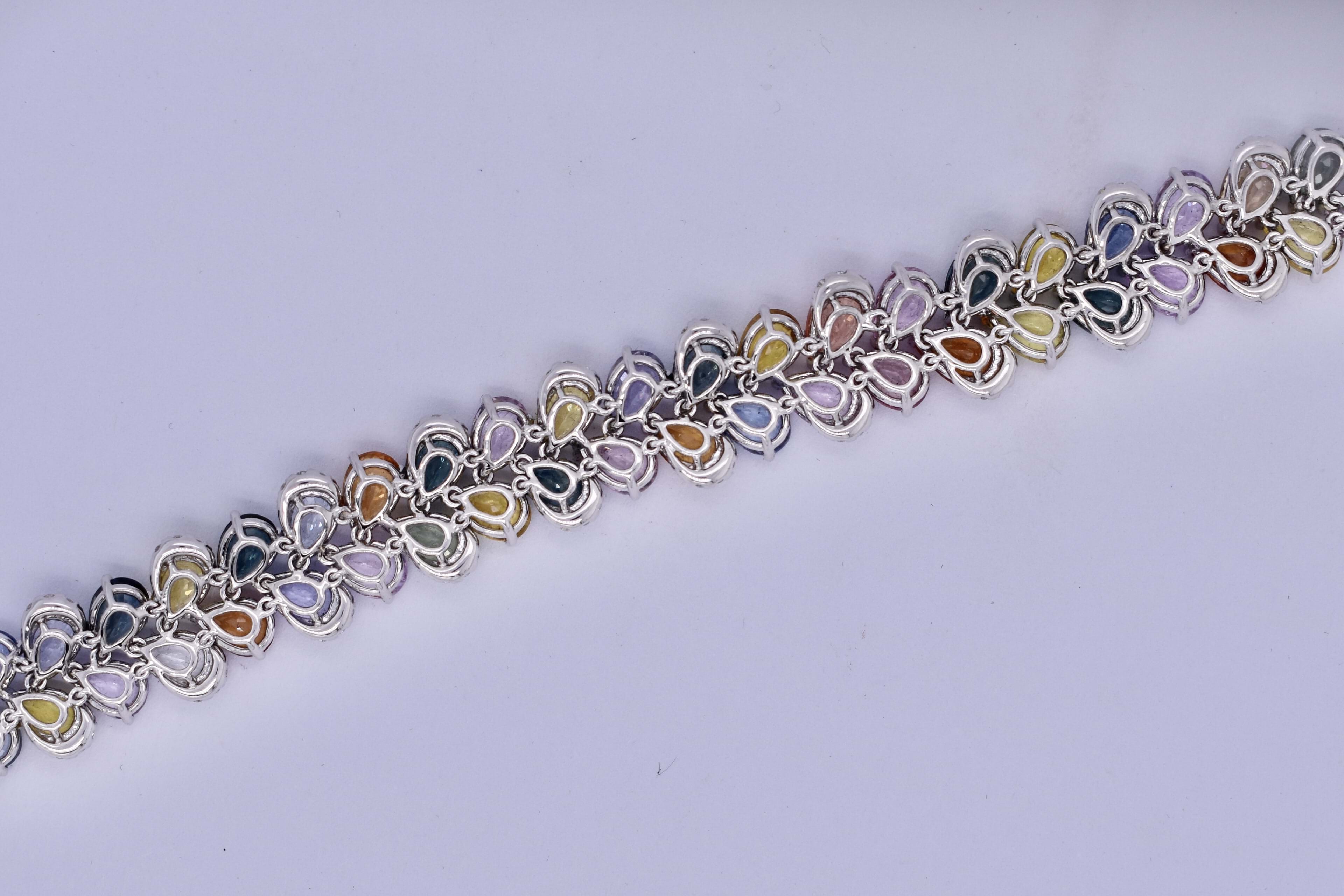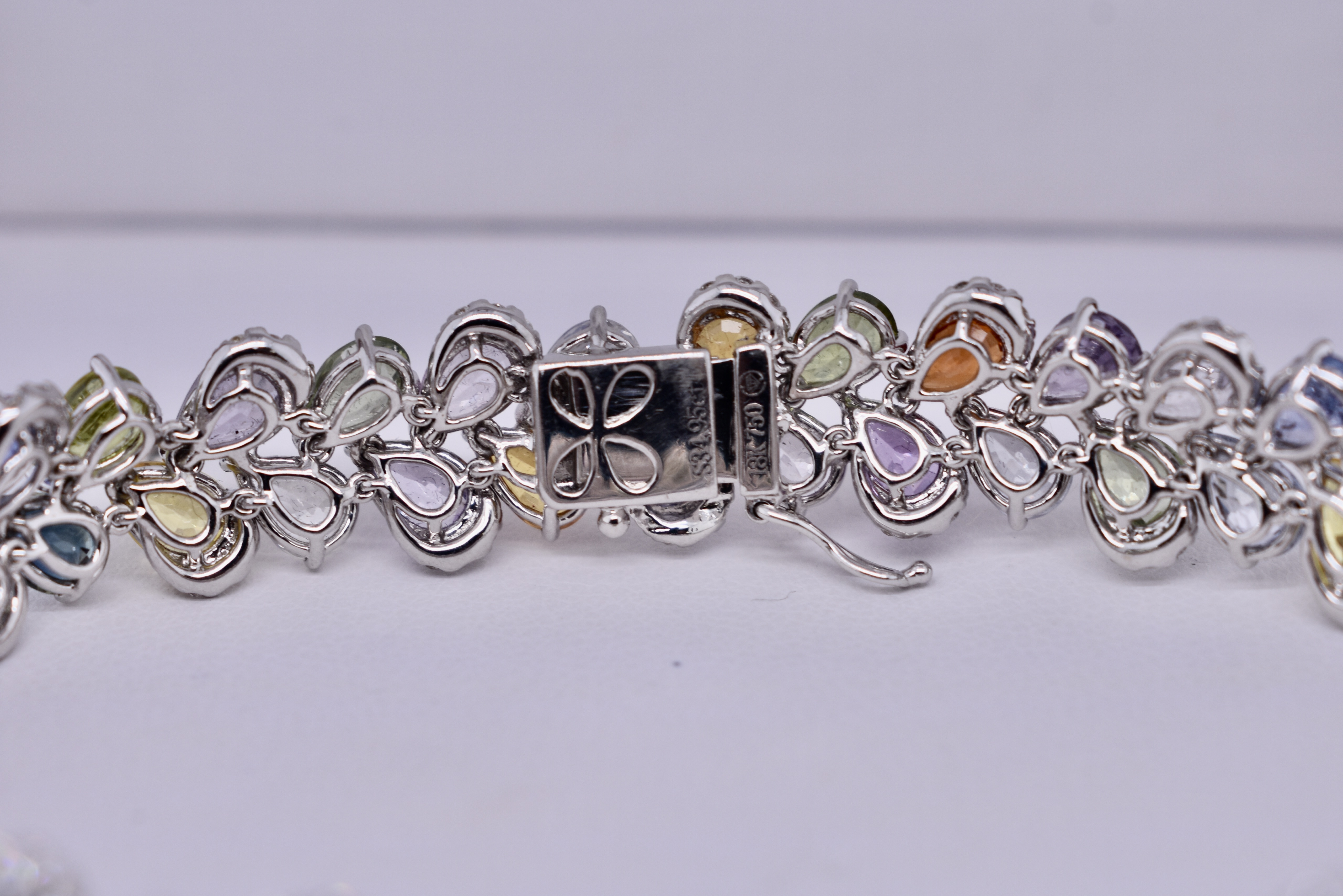 This wonderfully colourful 18ct white gold articulated bracelet, contains an array of different coloured pear shaped sapphires, including blue, yellow, purple, pink, teal and orange. With complements of shimmering diamonds micro pave set throughout. The 72 sapphires measure an average of 6x4mm and total 34.95ct. Total of 108 round brilliant cut 1.1-1.2mm diamonds equalling 0.68ct G VS-SI. Finished with a concealed box clasp and a figure 8 catch for extra security. Bracelet is 18.0cm long. Independent Valuation Supplied