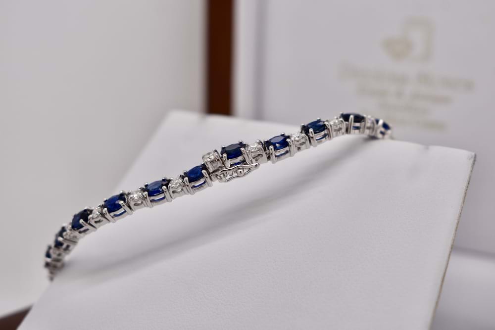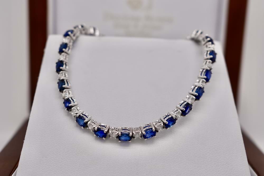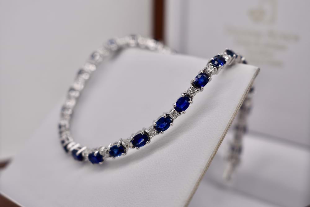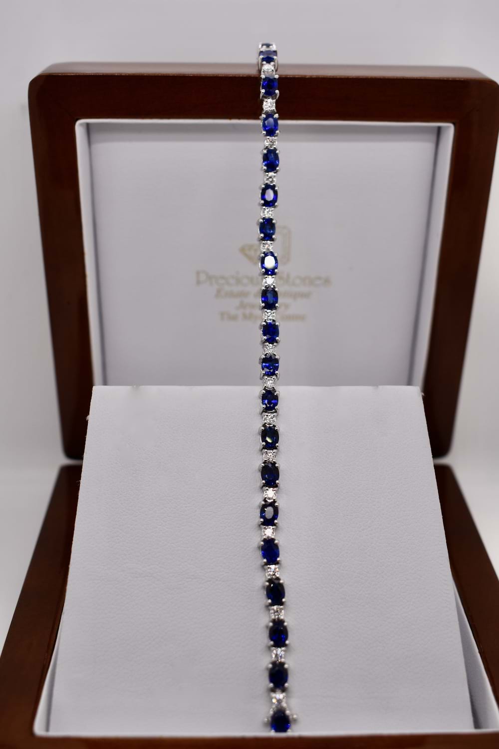 This elegant 18ct white gold bracelet has an alternating pattern of beautiful deep blue natural oval Sapphire followed by a round diamond. The braclet has 26 total Sapphires equalling 6.09ct and 26 Diamonds equalling 0.89ct. 17.5cm overall length with a concealed catch and two safety locks