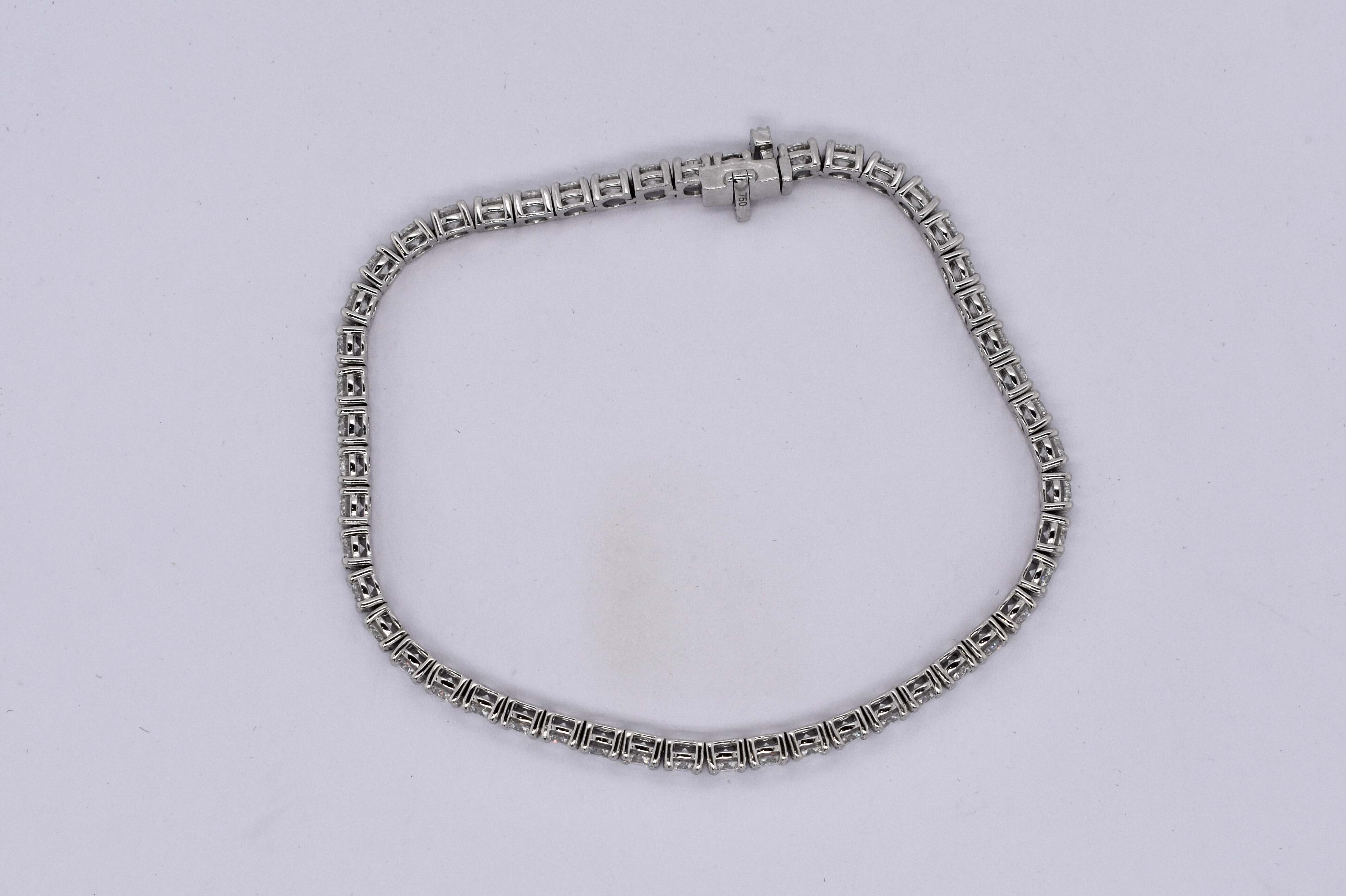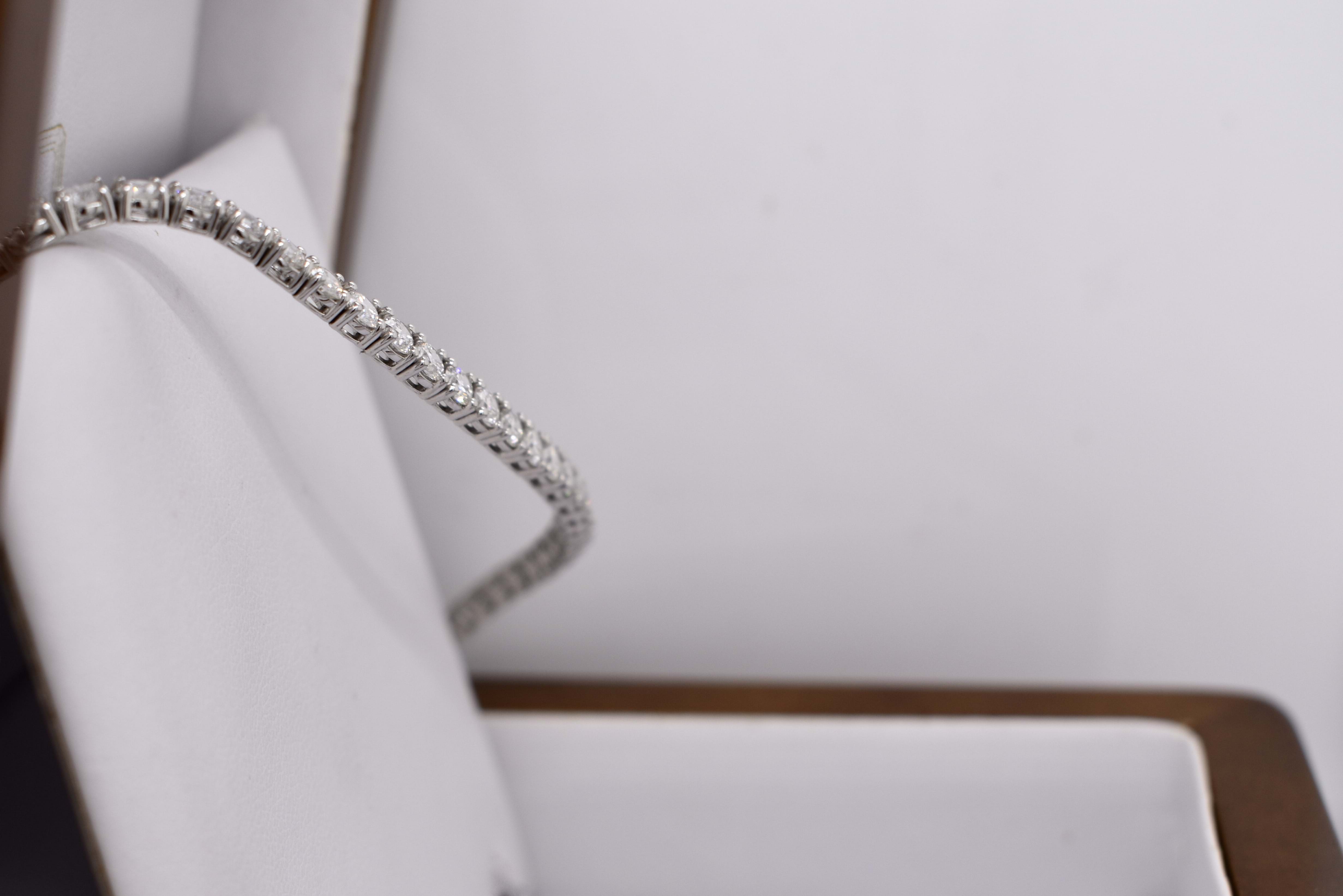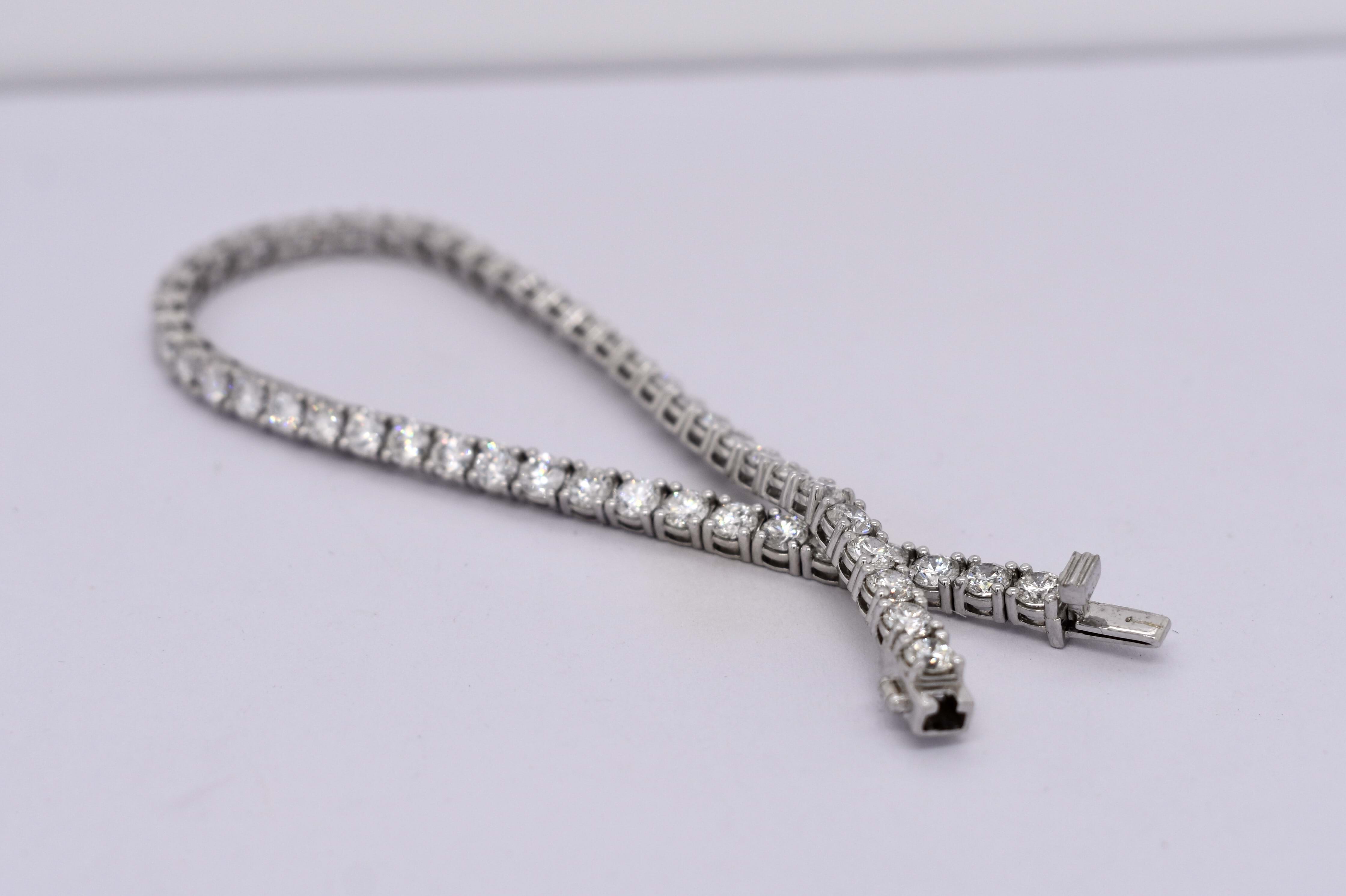 Stunning and sparkly 18ct white gold diamond tennis bracelet containing 50 round brilliant cut diamonds totalling 6.14cts (G SI) with box clasp and hidden safety. Length: 18cm Independent valuation available upon purchase.