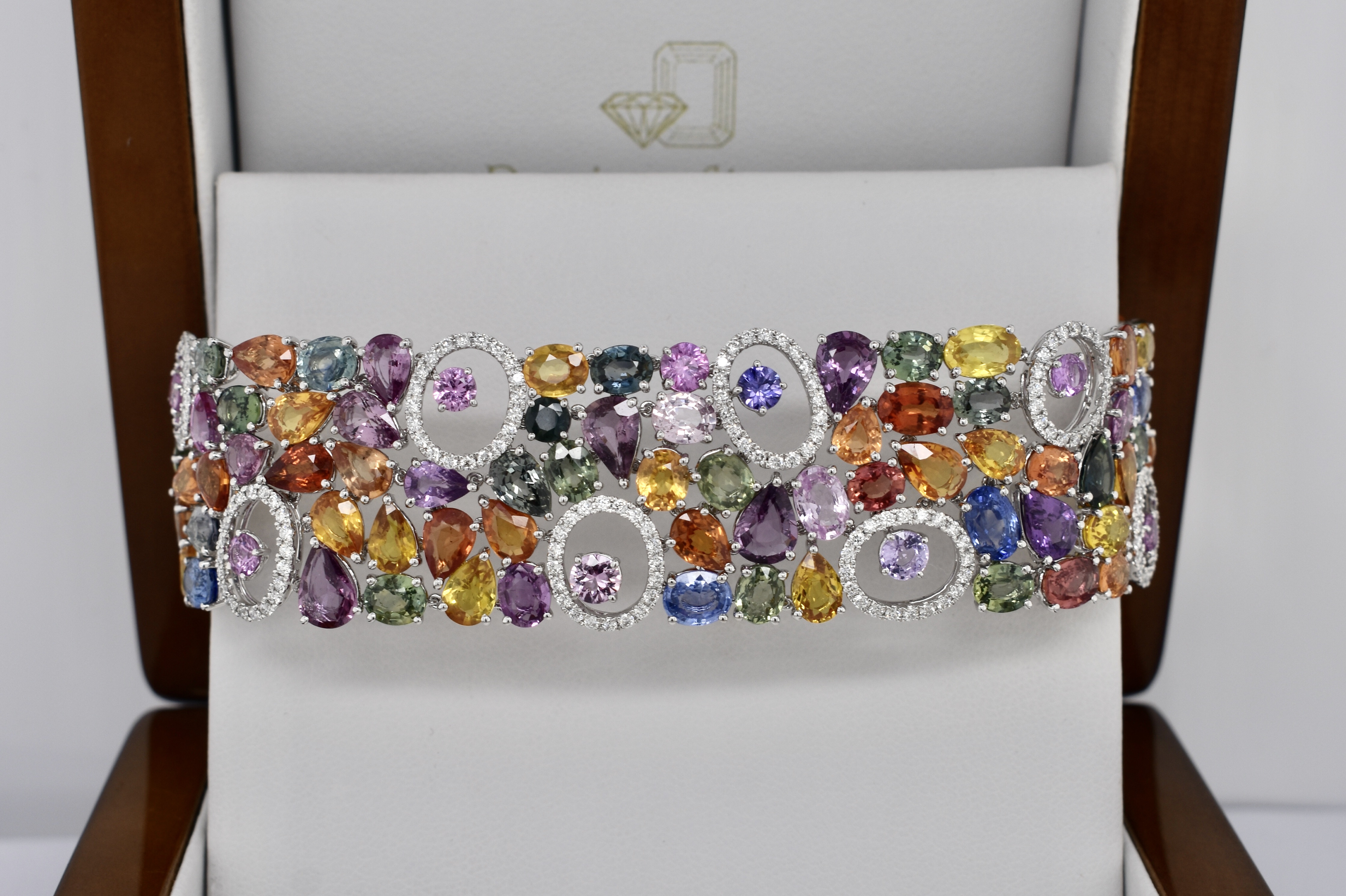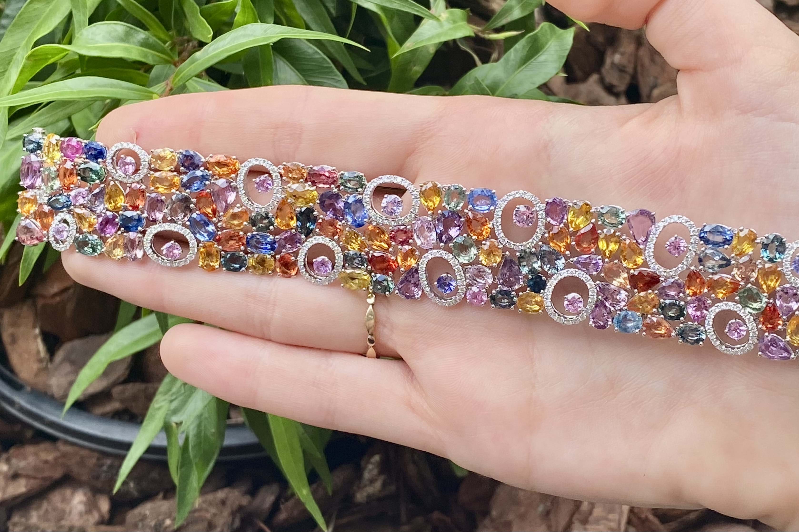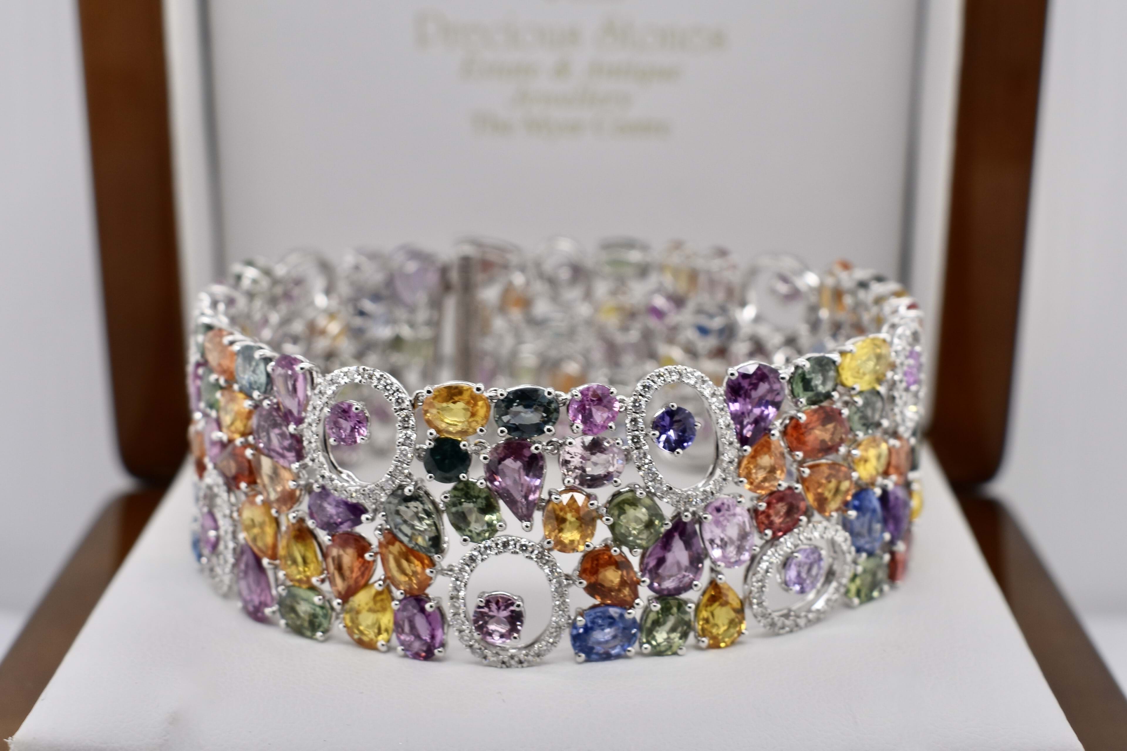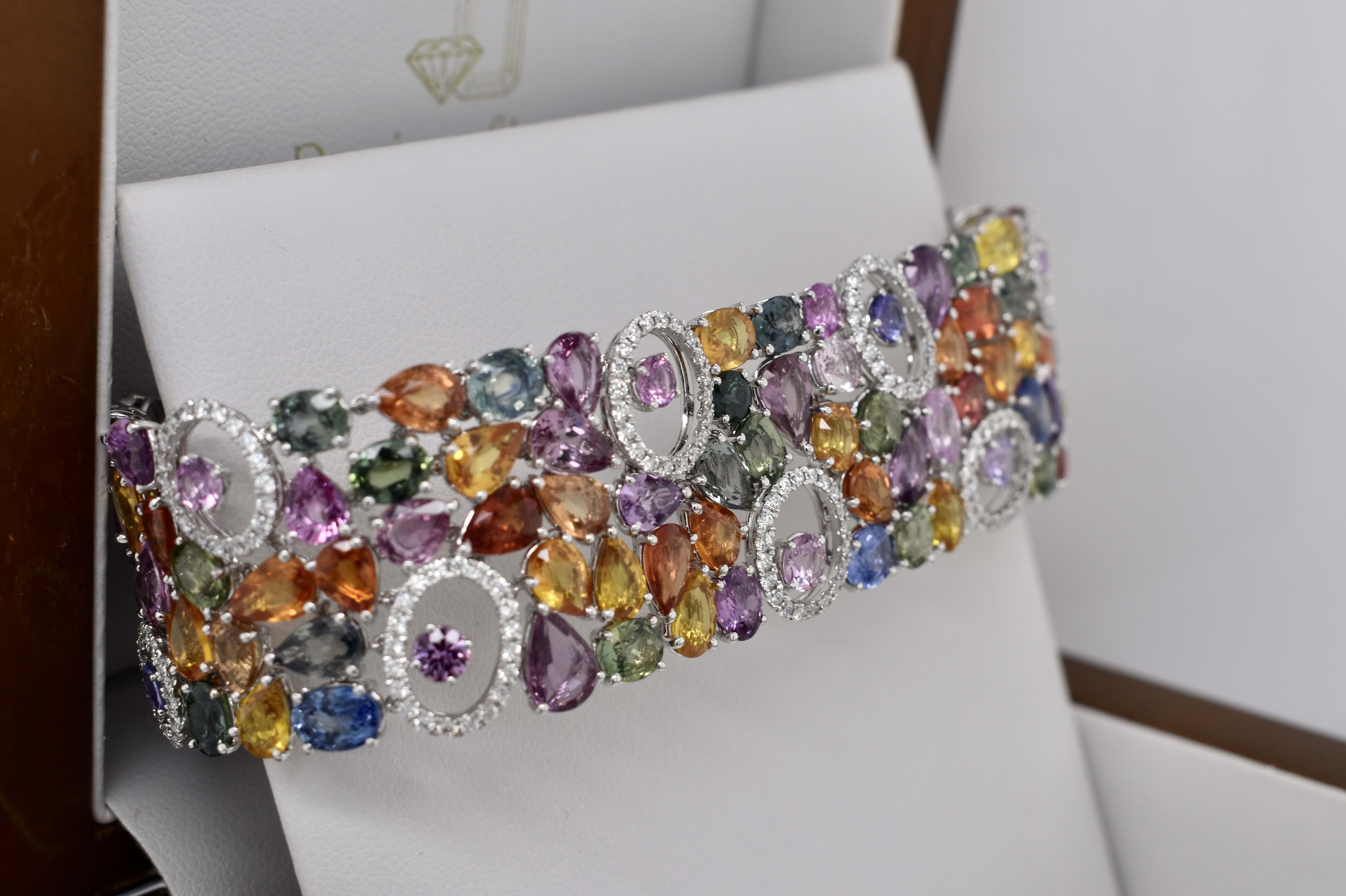 Fantastically crafted, this 18ct white gold articulated bracelet is set with multiple coloured sapphires including pink, blue, orange, green and yellow, totalling 64.28ct and with a grand total of 140 sapphires. The bracelet also features rings of diamonds with cut out centres, with 264 diamonds totalling 1.83ct. Bracelet measures 17.5cm long and 22mm wide and is completed has concealed box clasp.