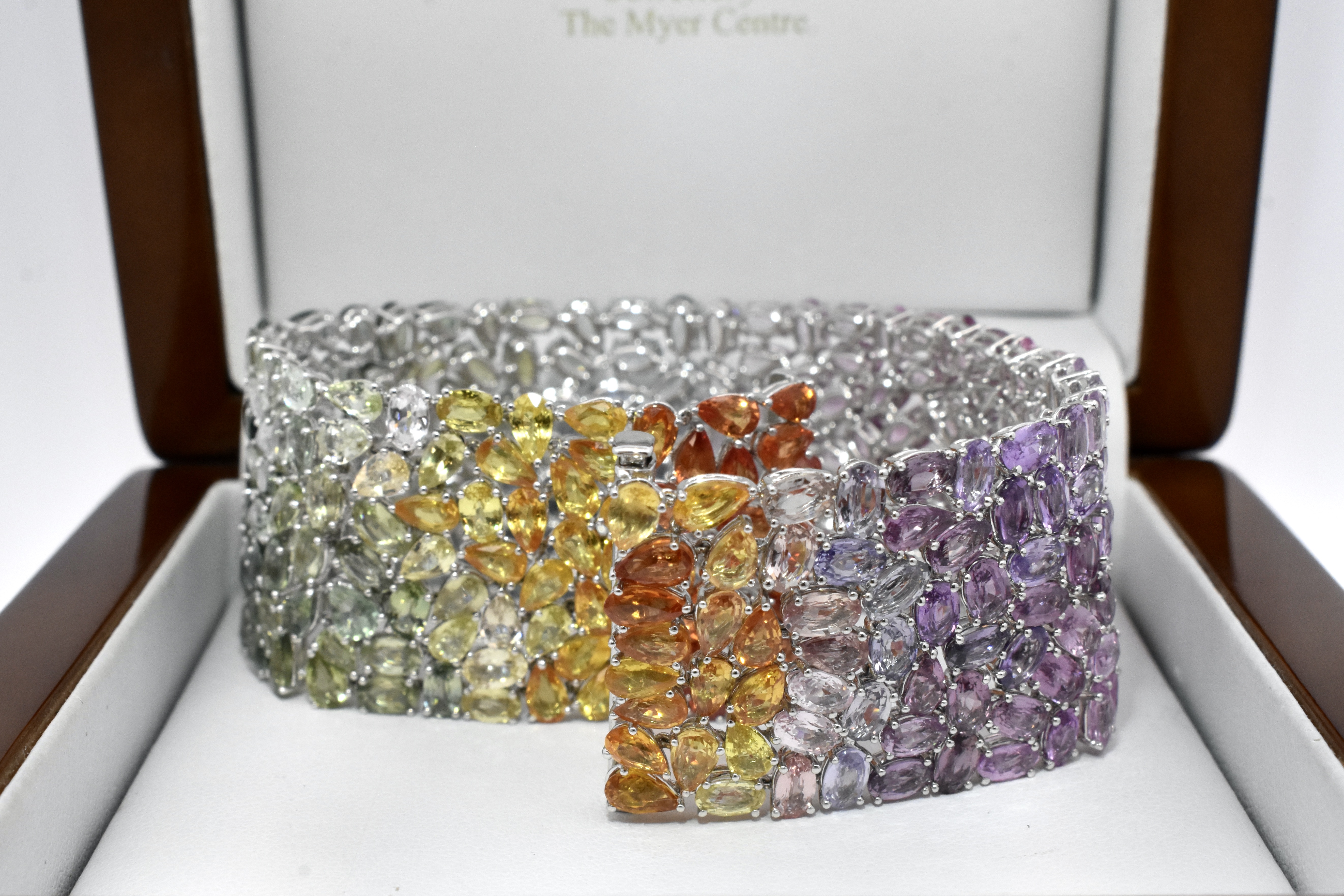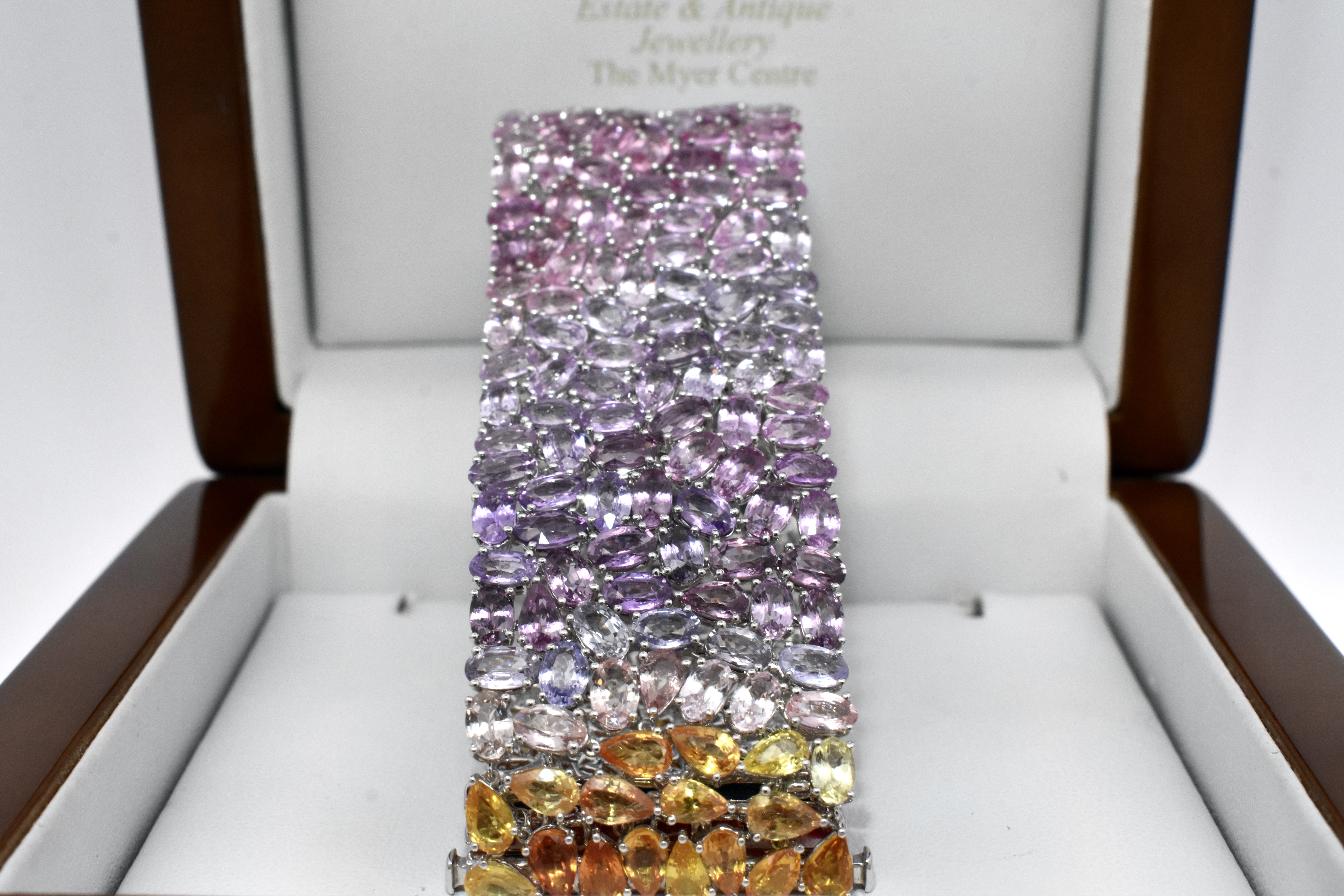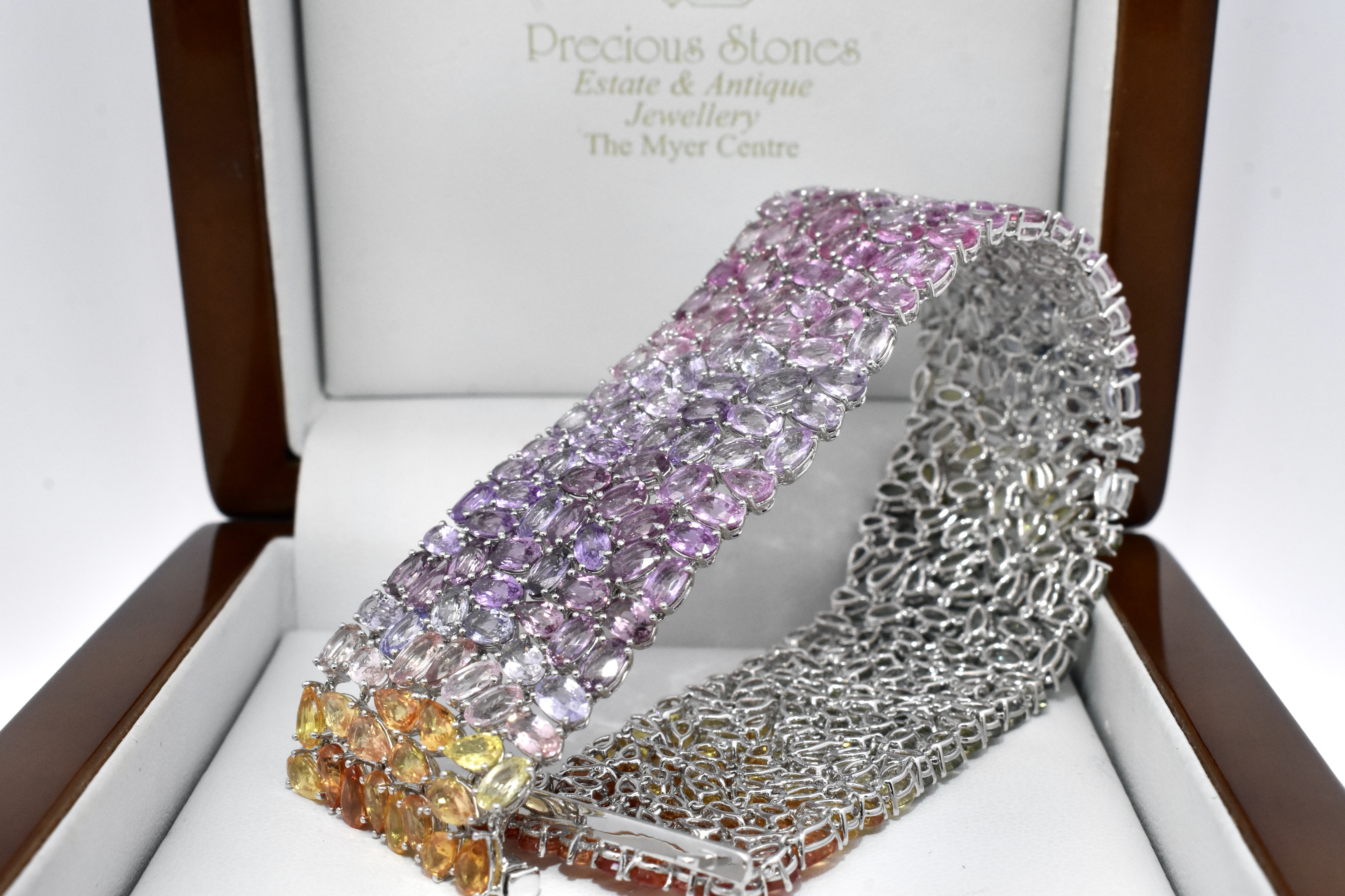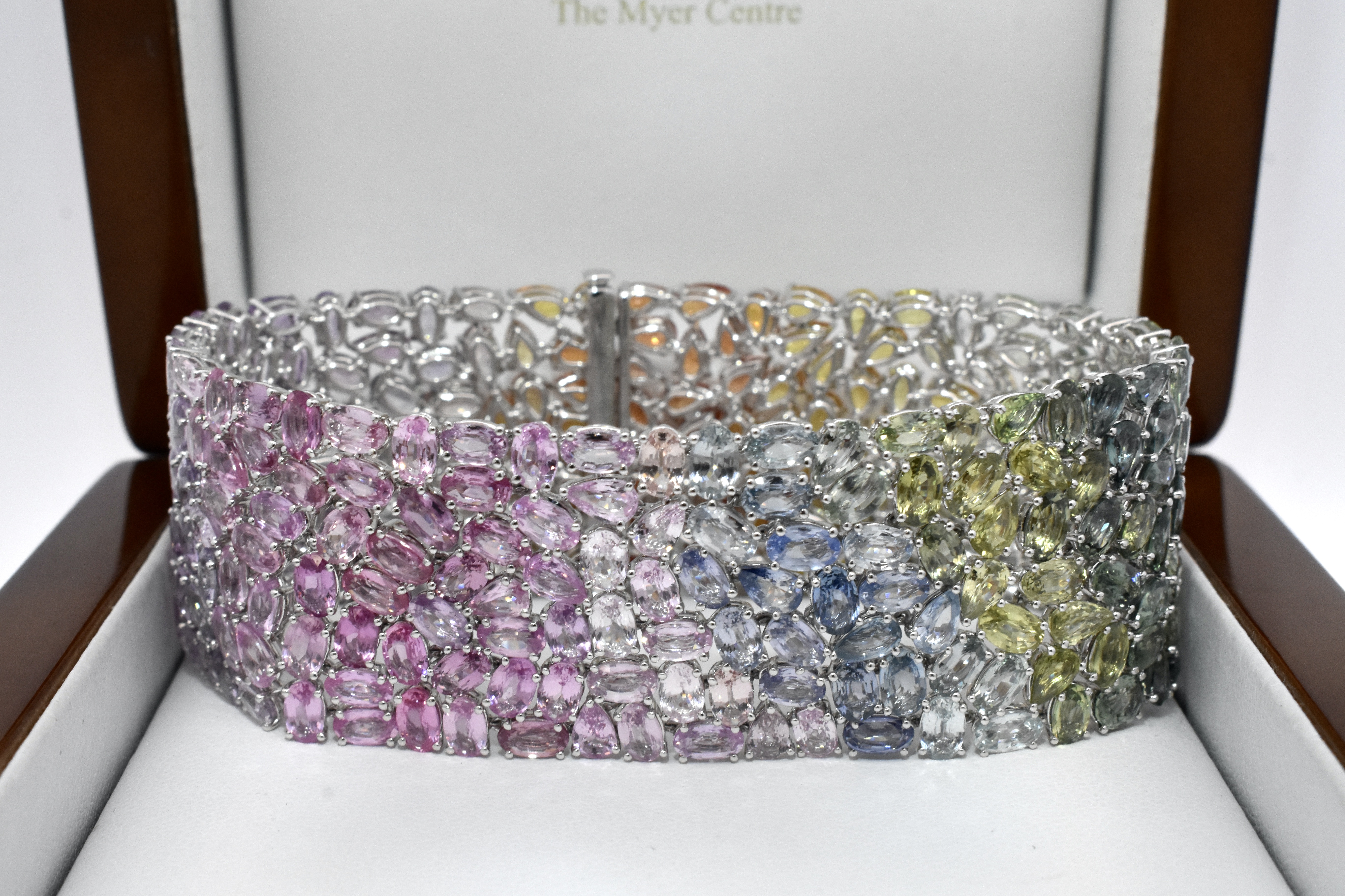 This bracelet is a beautiful rainbow spectrum of sapphires in pear and oval shapes, all individually claw set with a stunning graduation of colour across 296 total sapphires equalling 78.97ct. The bracelet is 25mm wide and finished with a concealed clasp, 17.8cm long