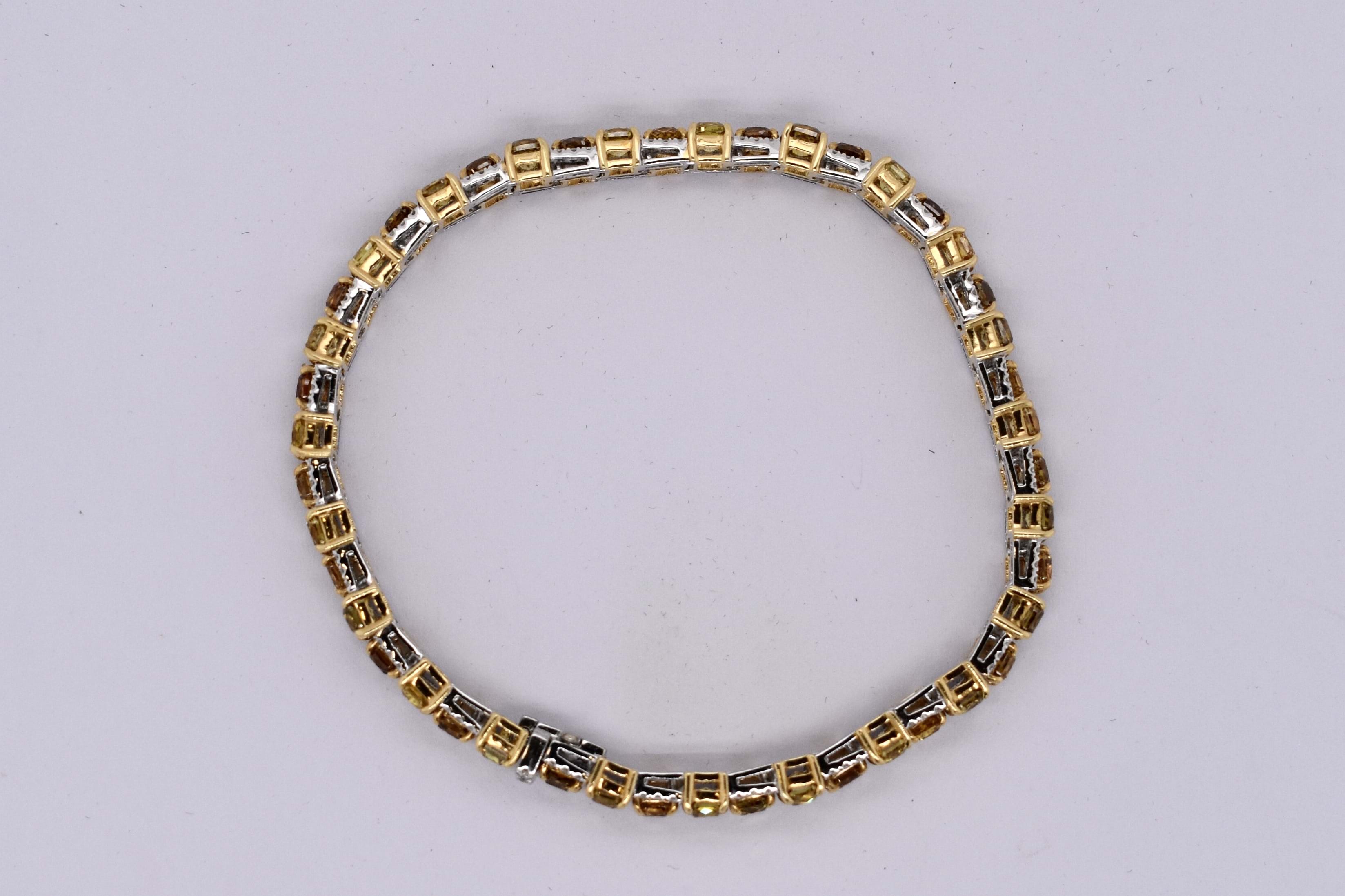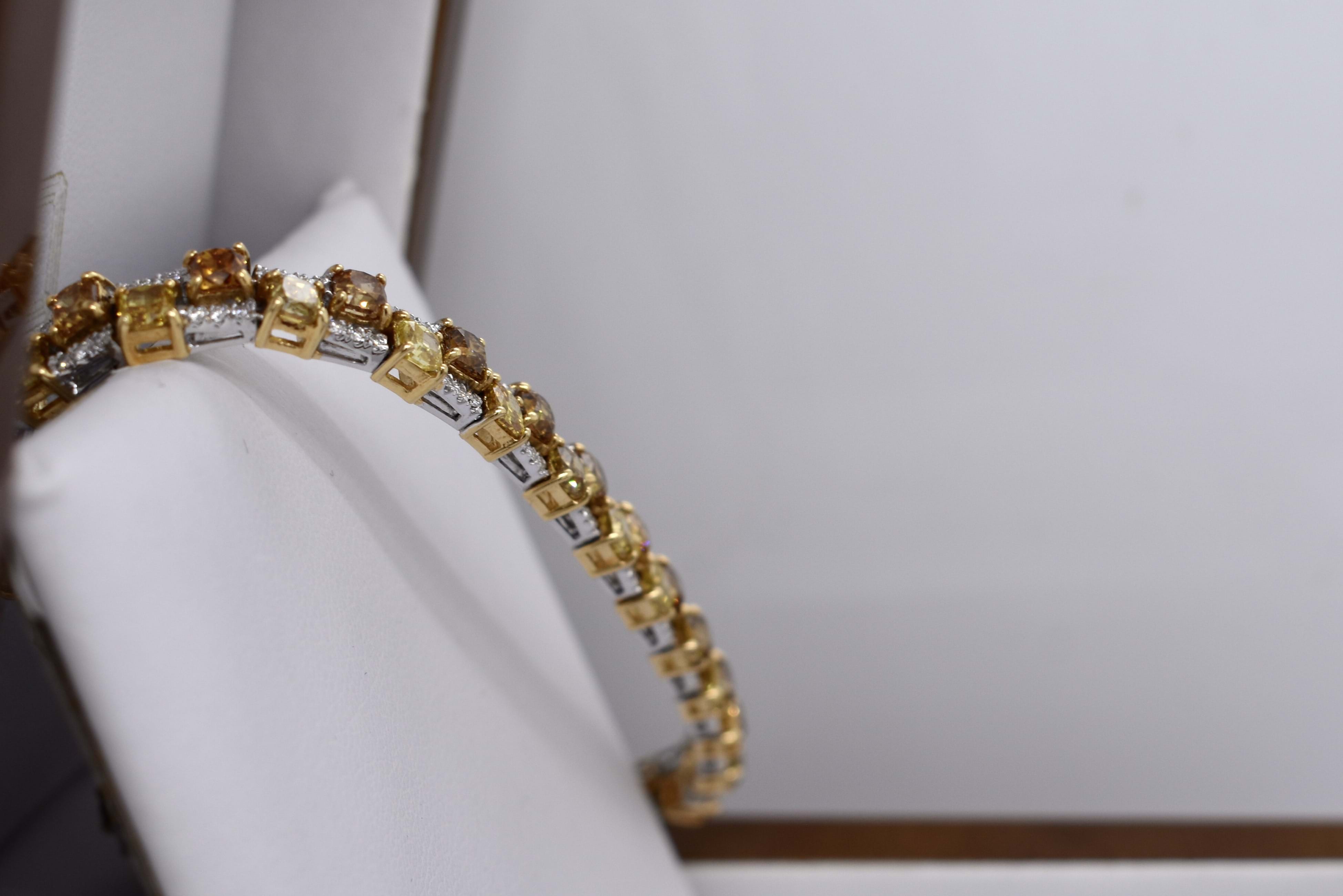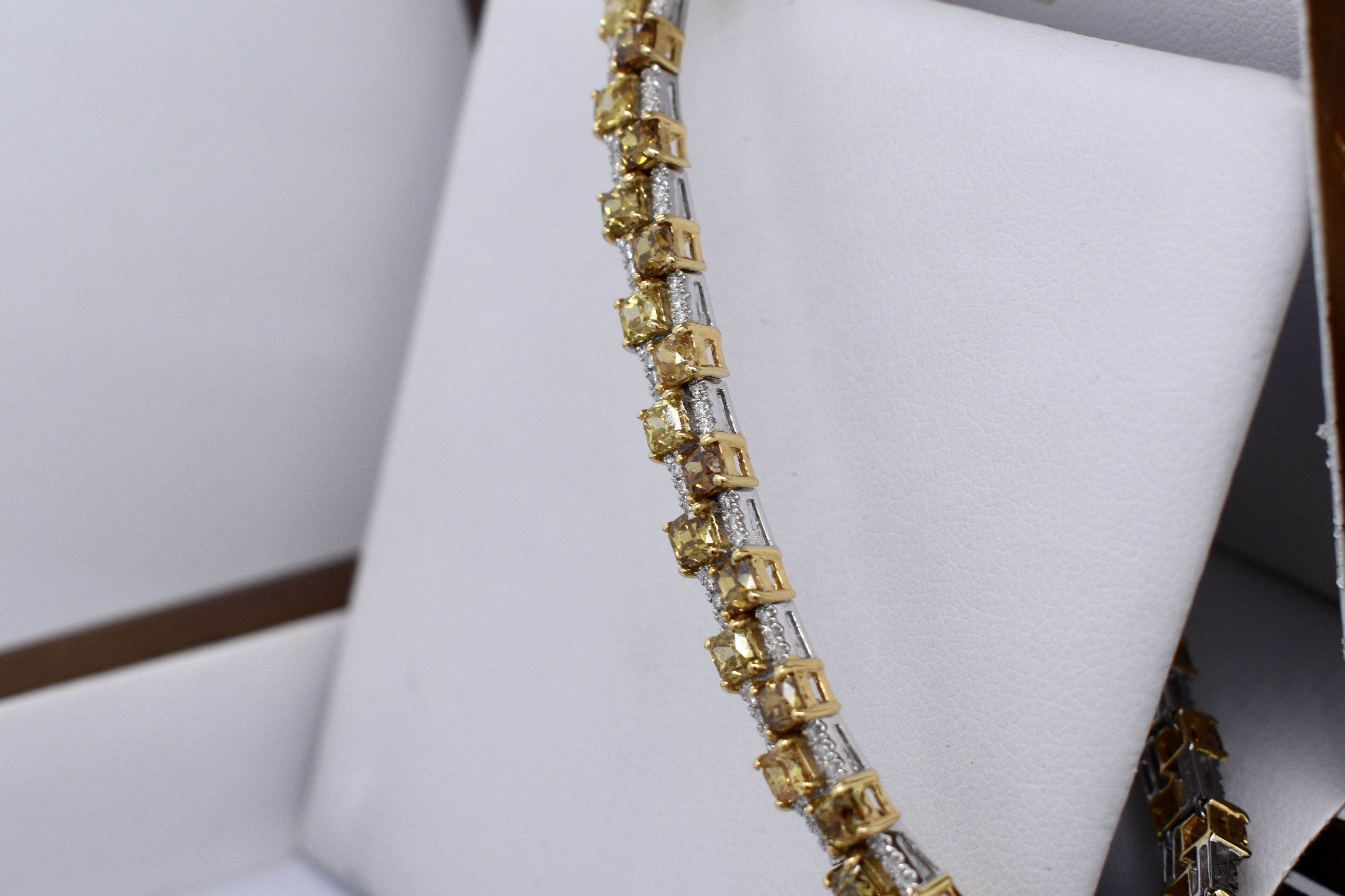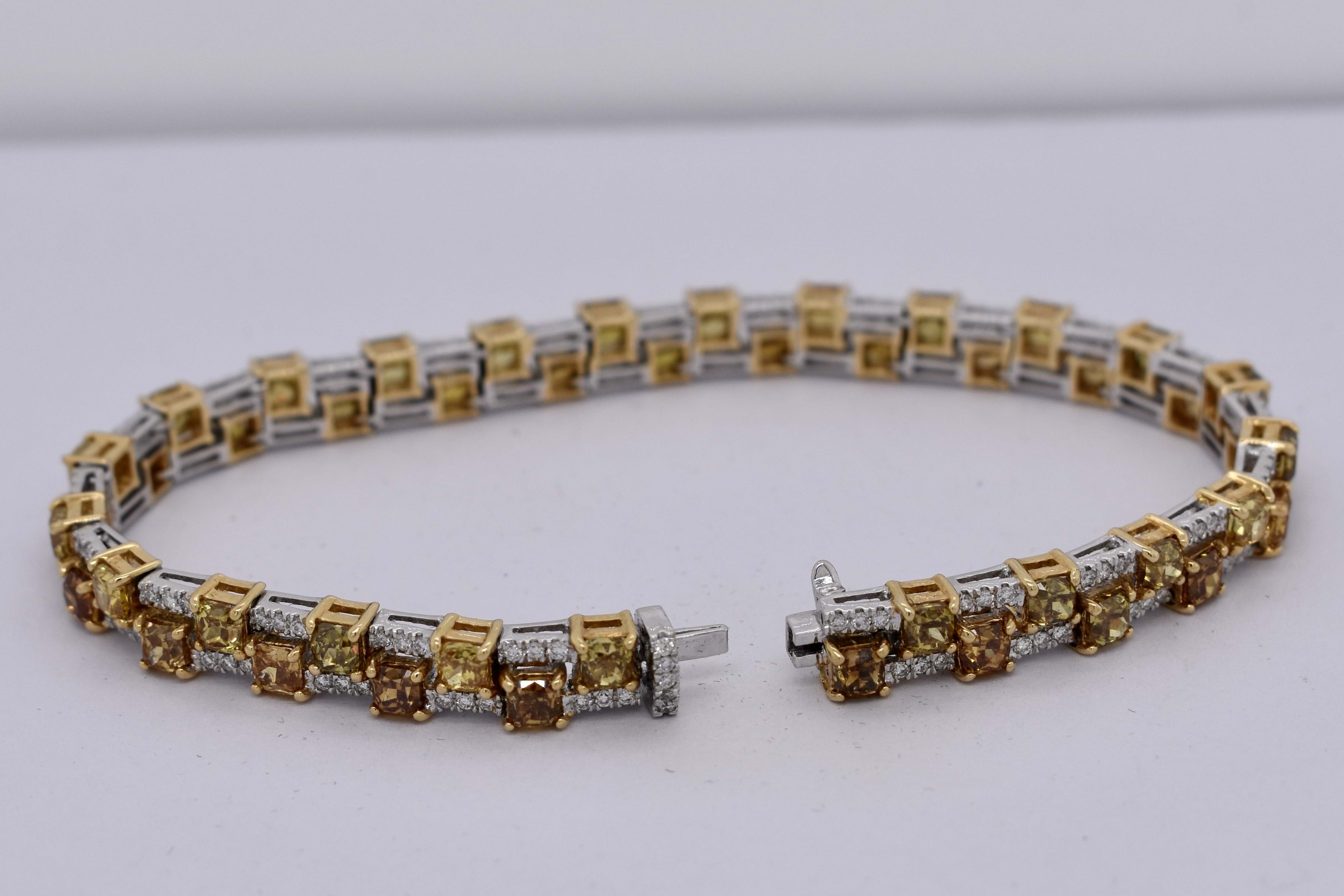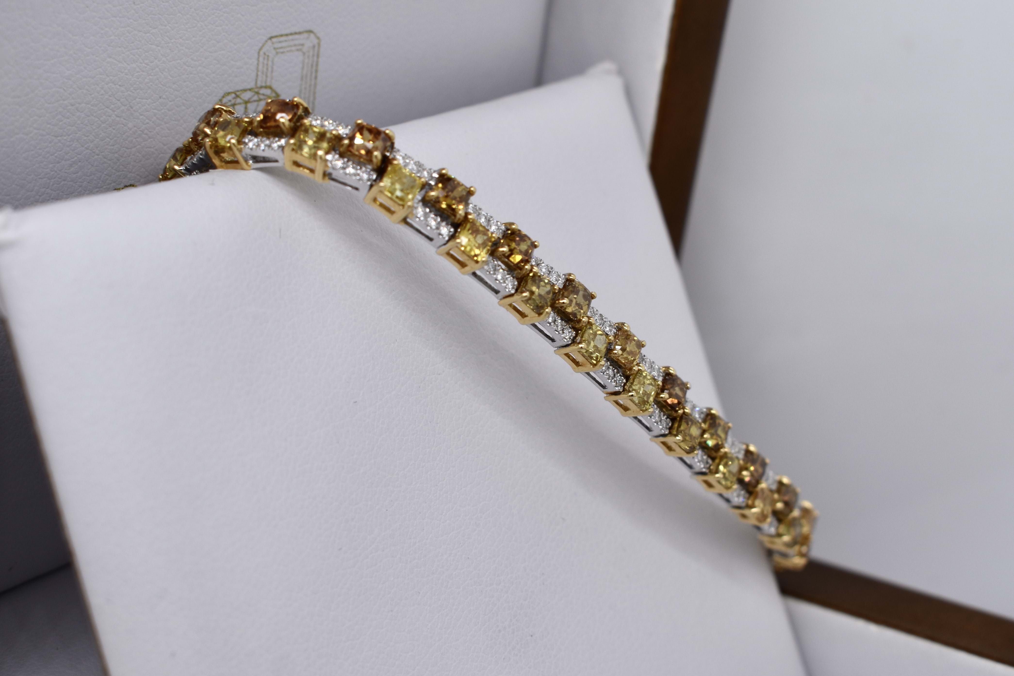 Fabulous and unique, this alternating checkerboard pattern bracelet is crafted in 18ct white and yellow gold, featuring two rows of alternating diamonds which are bead set. Containing 46 radiant cut fancy intense orange to fancy intense yellow coloured 3.0-3.2mm diamonds totalling 9.04ct VS-SI and 143 ro9und brilliant cut white 1.00mm diamonds, totalling 0.70ct. Bracelet is fitted with an integrated box clasp and hidden safety latch. Length of 17.5cm. 17.06 grams. Independent valuation supplied.
