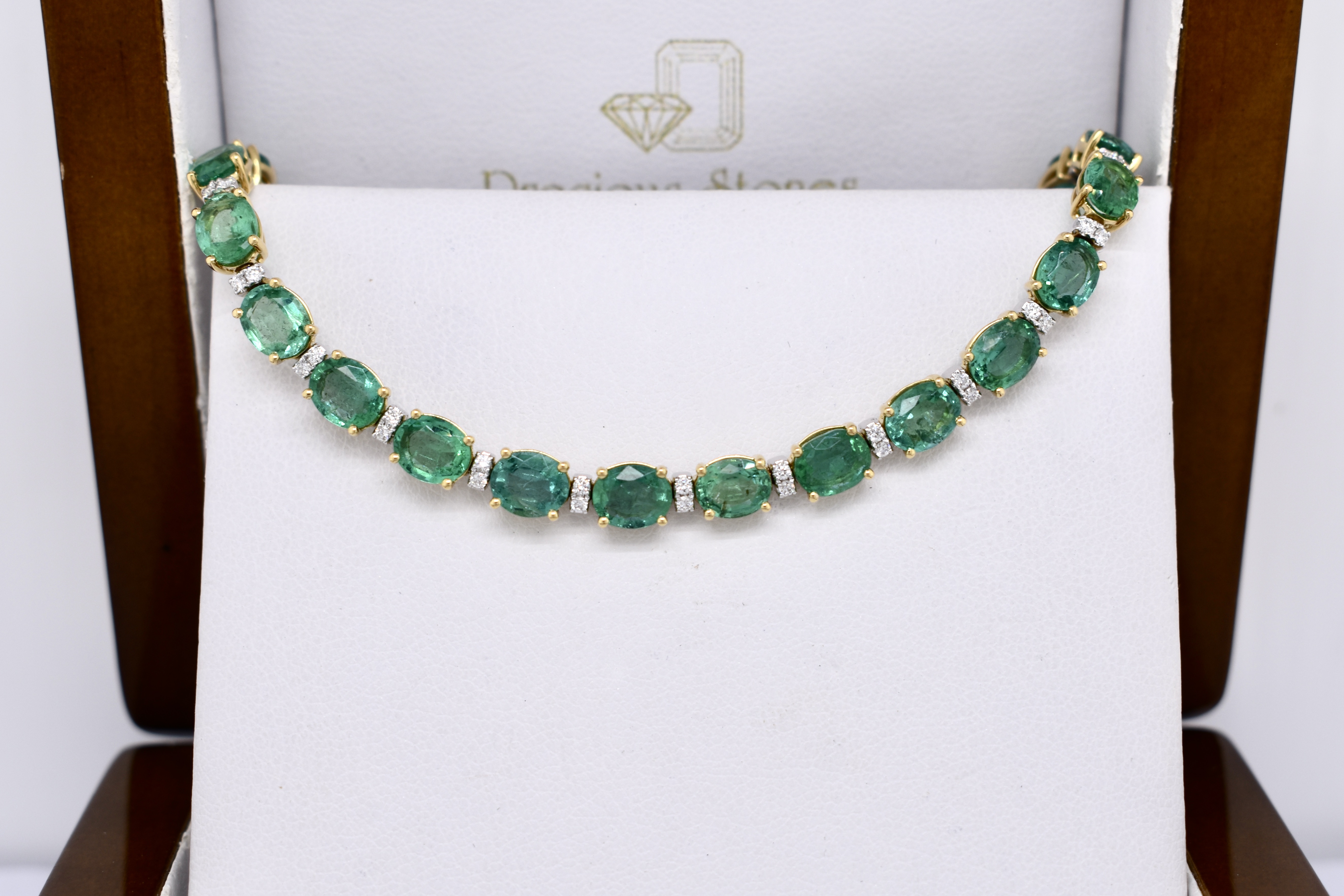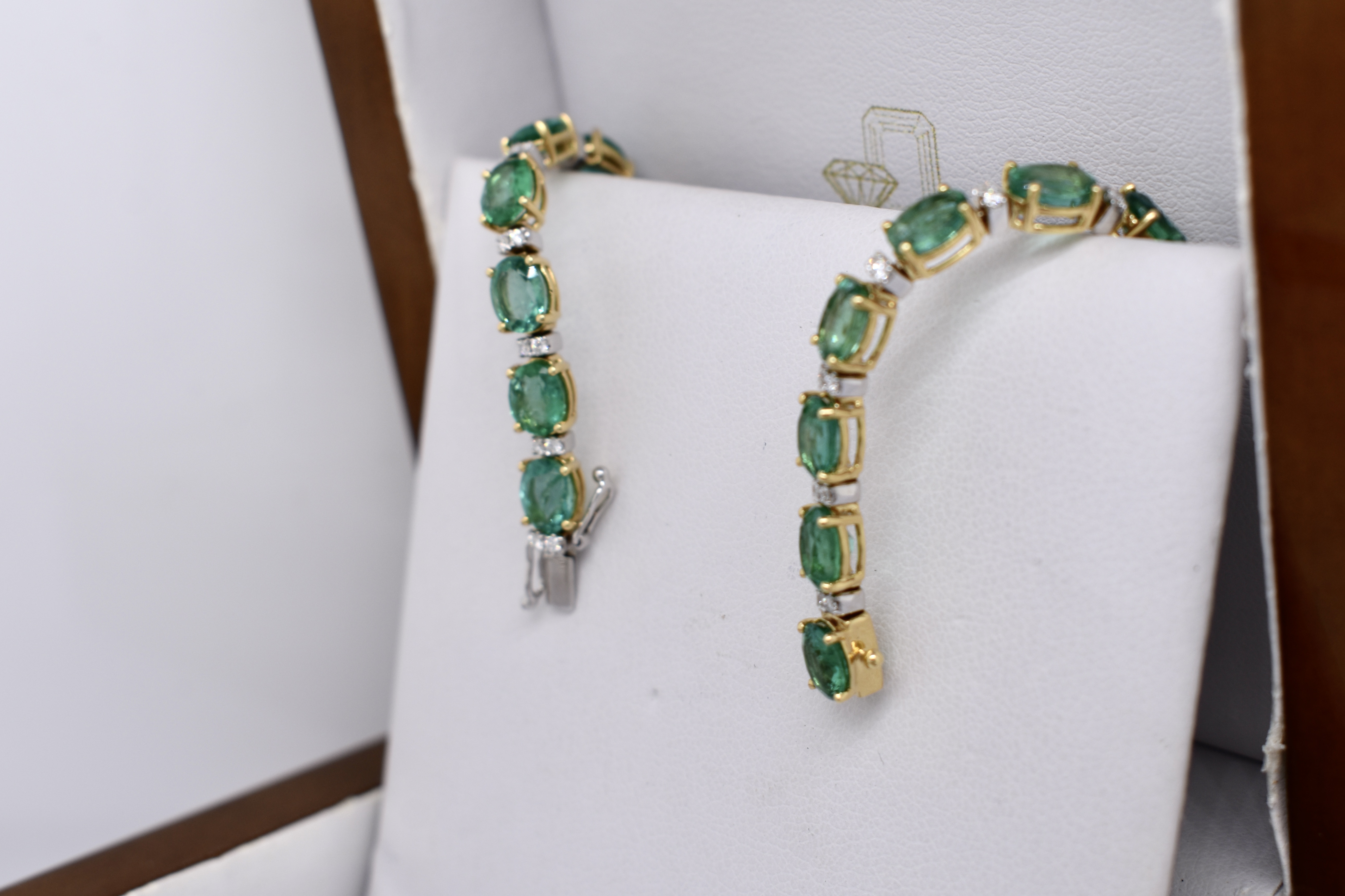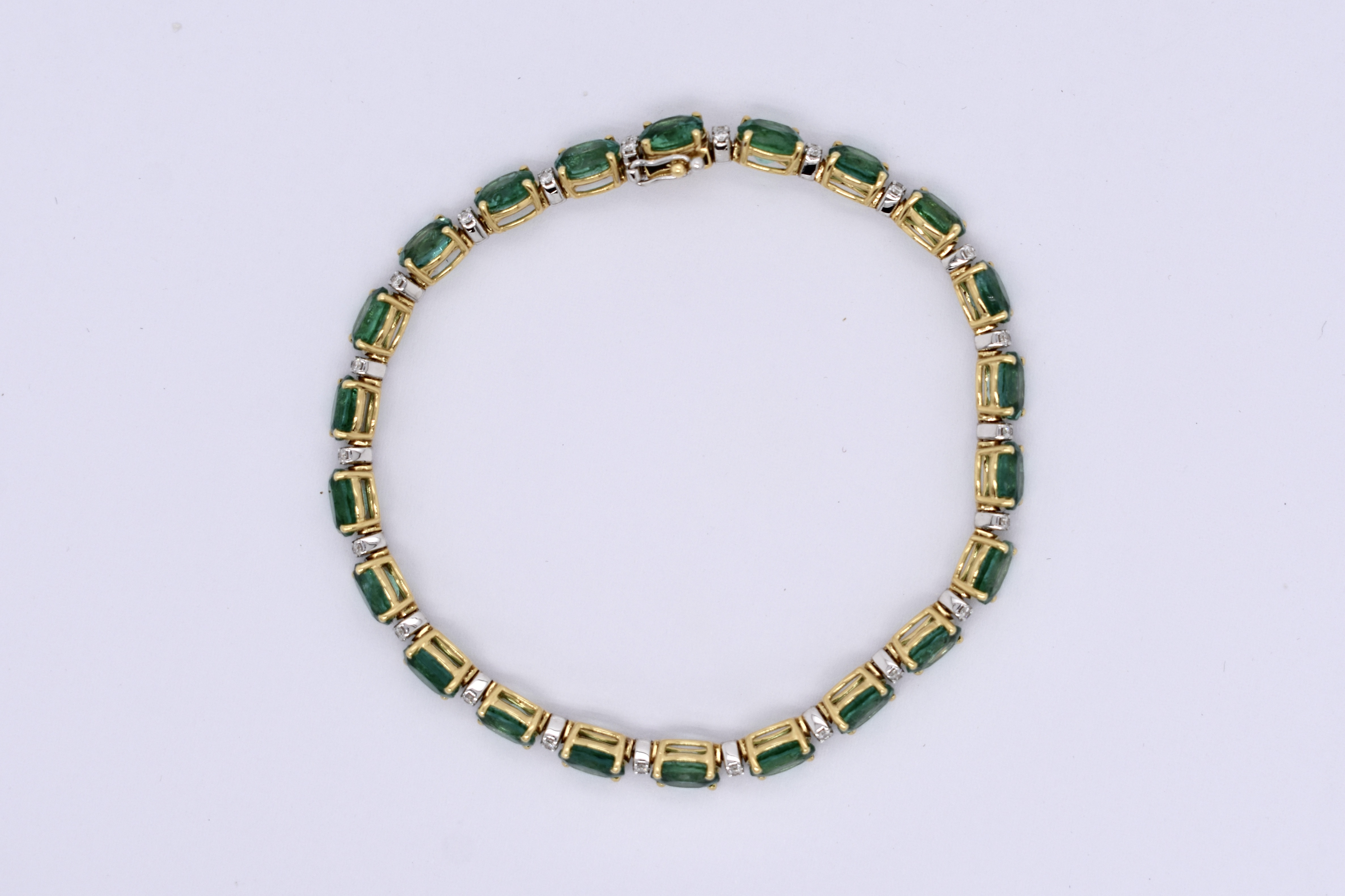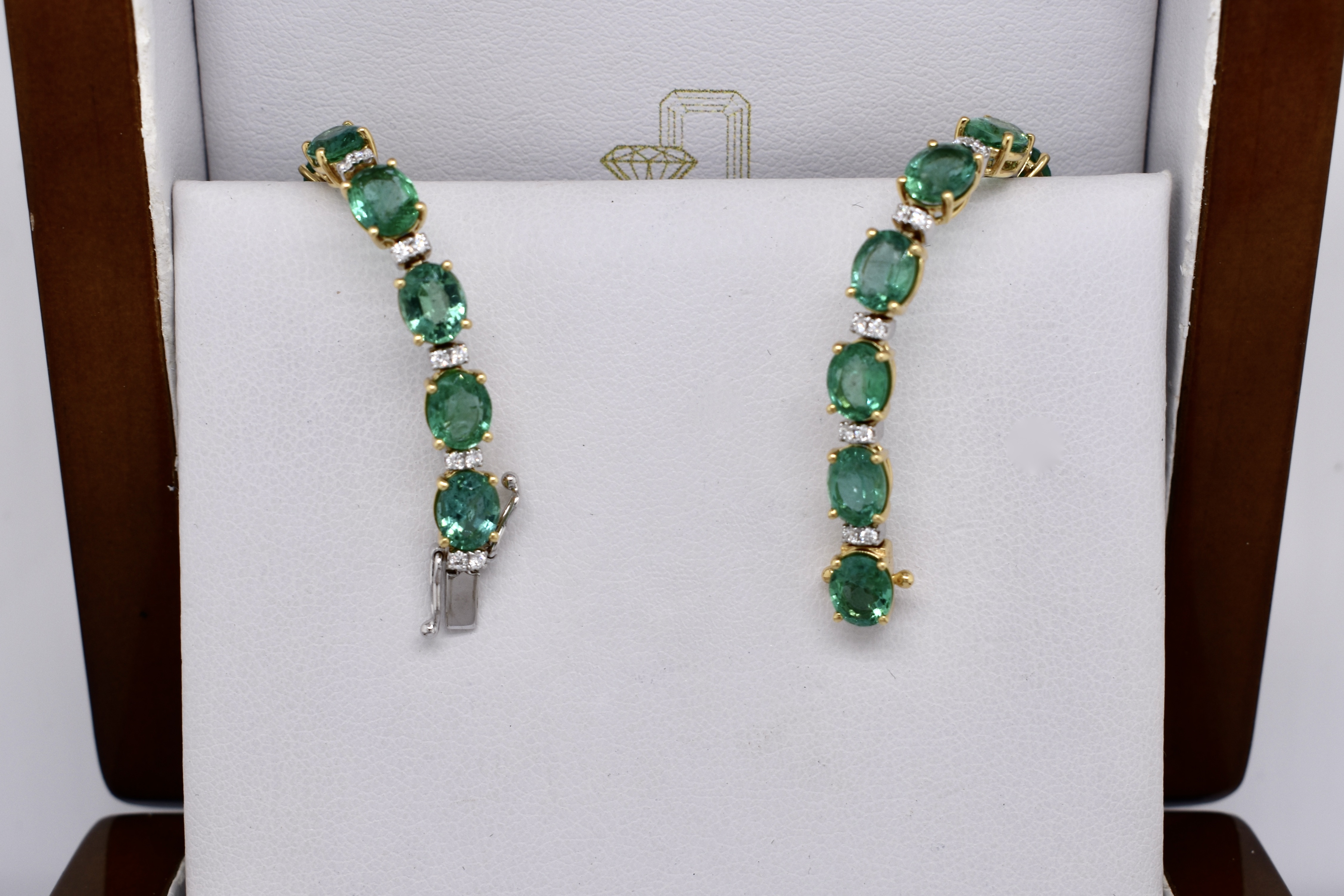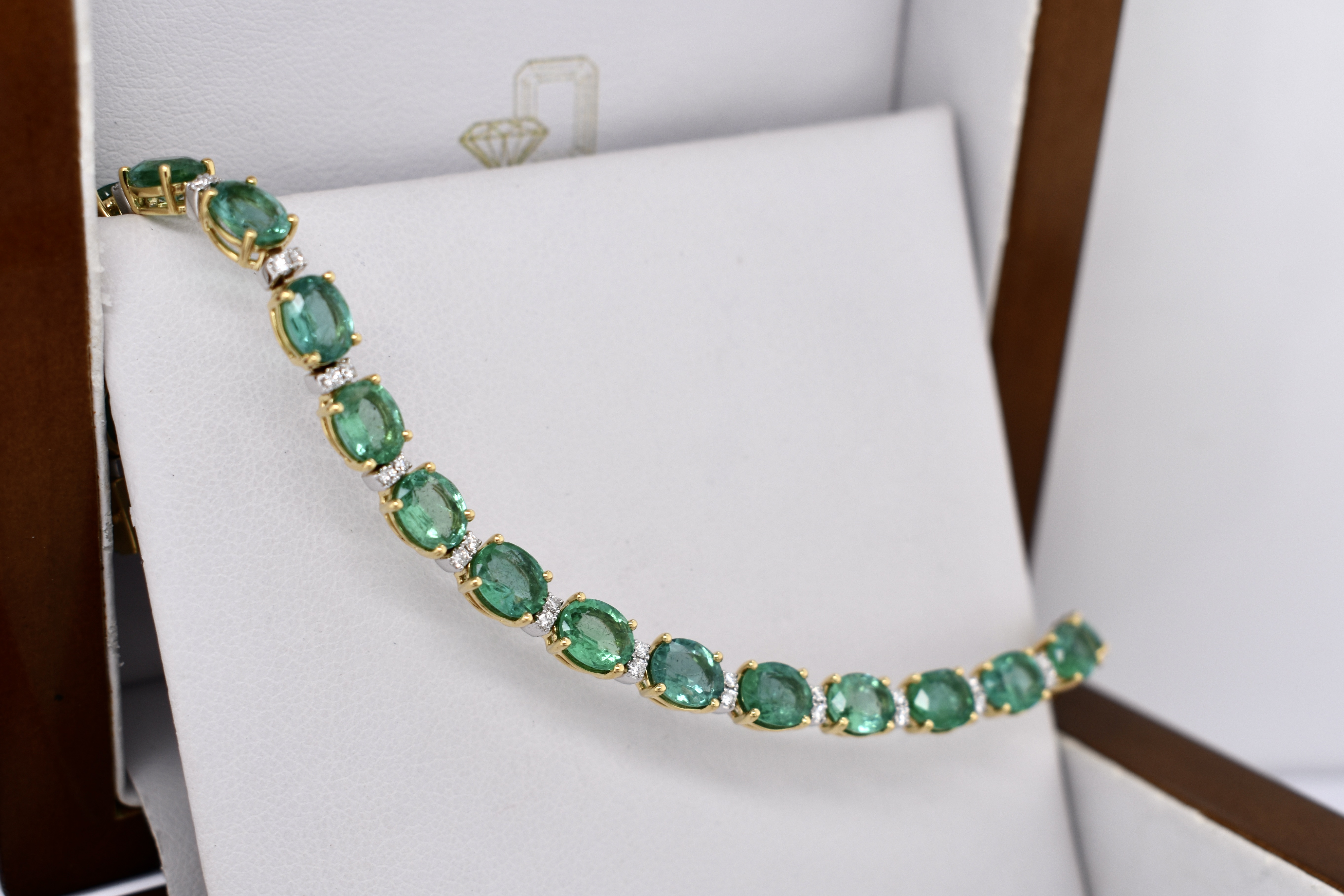 Green and gorgeous, this bracelet is crafted in 18ct yellow gold and is set with 22 oval emeralds, measuring 6x5mm and totalling 12.24ct. It also features 44 round brilliant cut 1.5mm diamonds, set between, alternating with the emeralds. Bracelet length is 18.5cm long with two figure of 8 safety catches. Independent Valuation available upon purchase.
