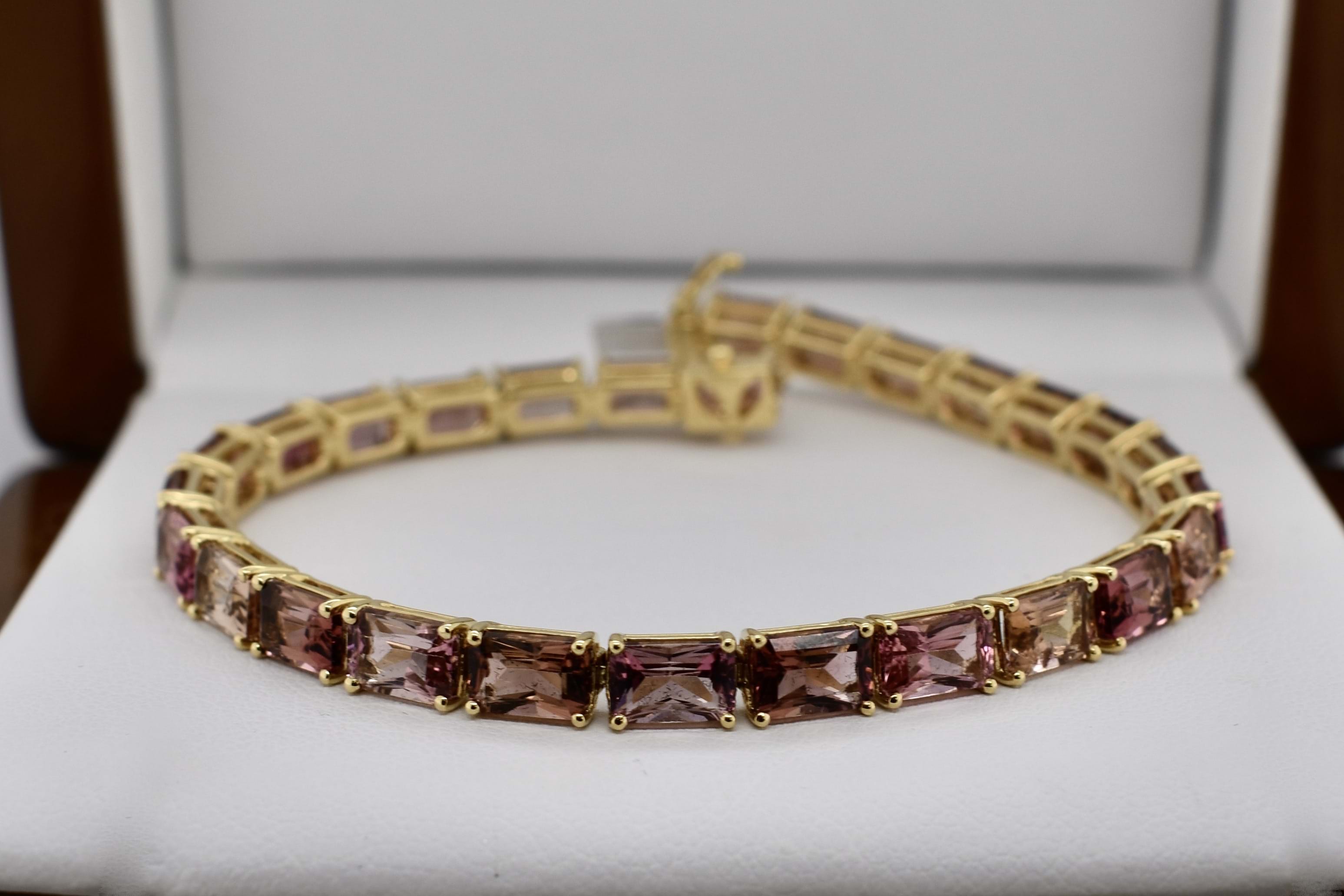 Crafted in 18ct yellow gold, this pretty pink tourmaline bracelet, featuring twenty seven radiant cut tourmalines, totalling 15.27ct, including light pinks, mid pinks and brownish orangey pinks. These tourmaline stones are four claw set in an articulated line style bracelet with a concealed box clasp and two figure of 8 safety catches. Bracelet measures 17cm long. Independent Valuation Supplied.
