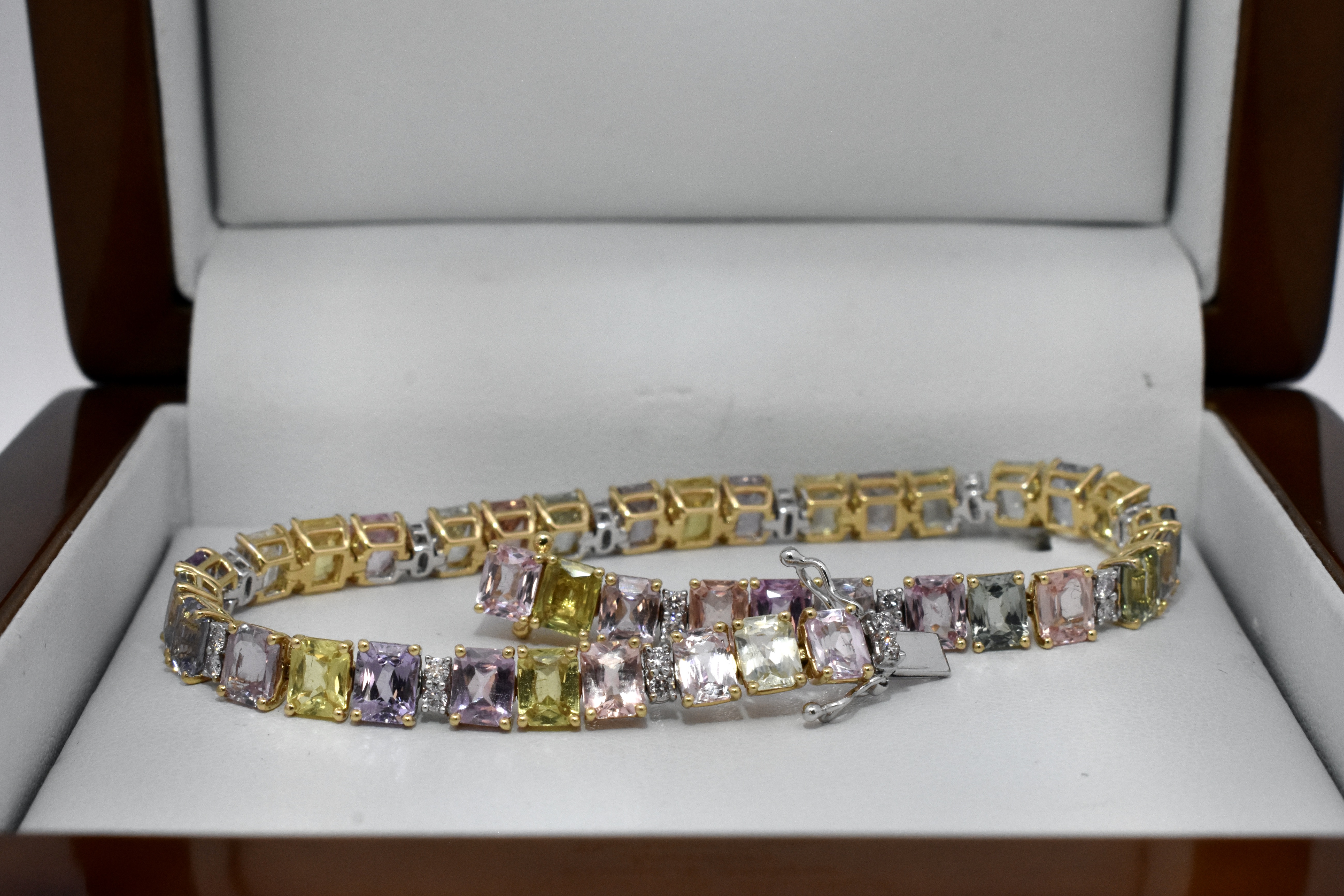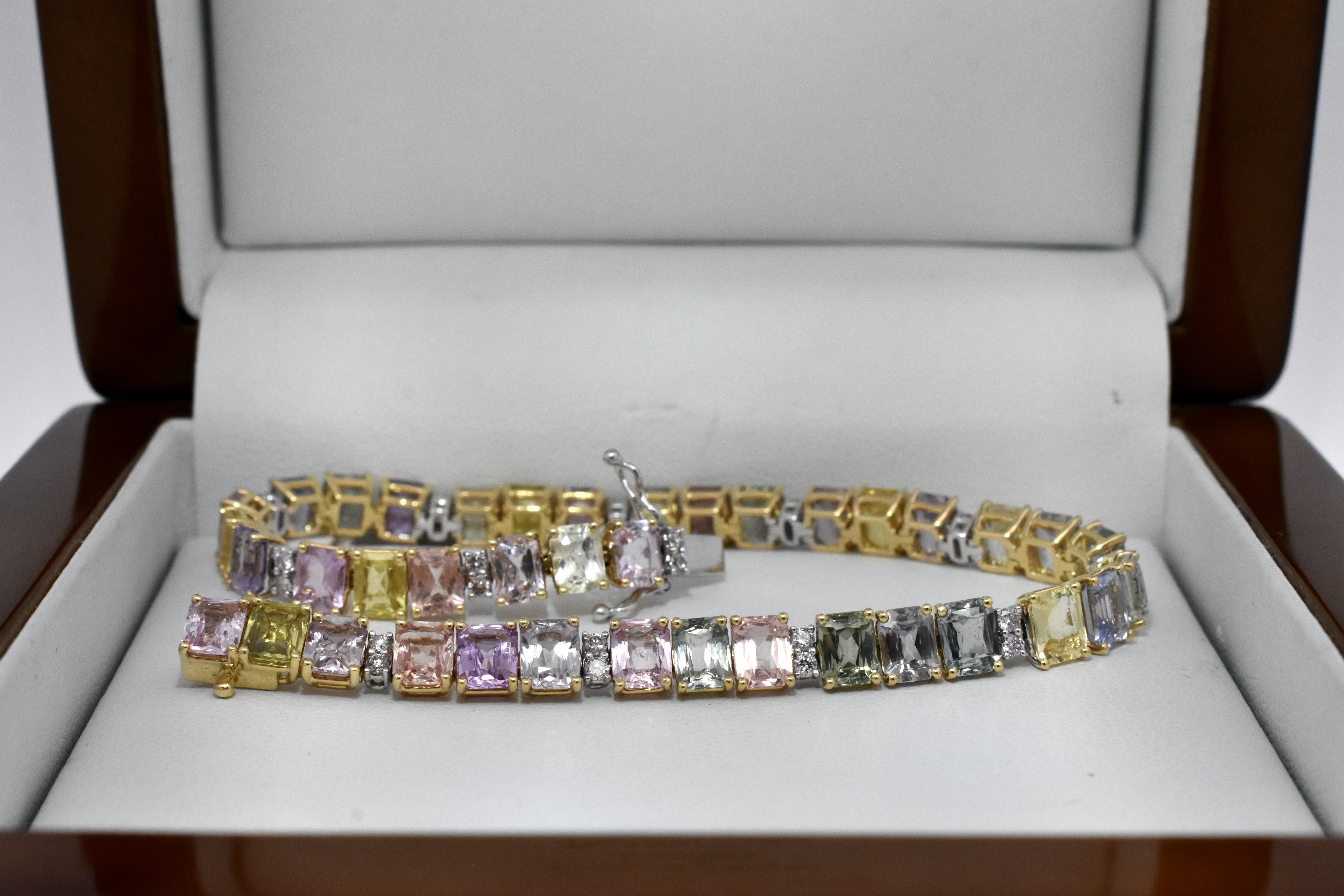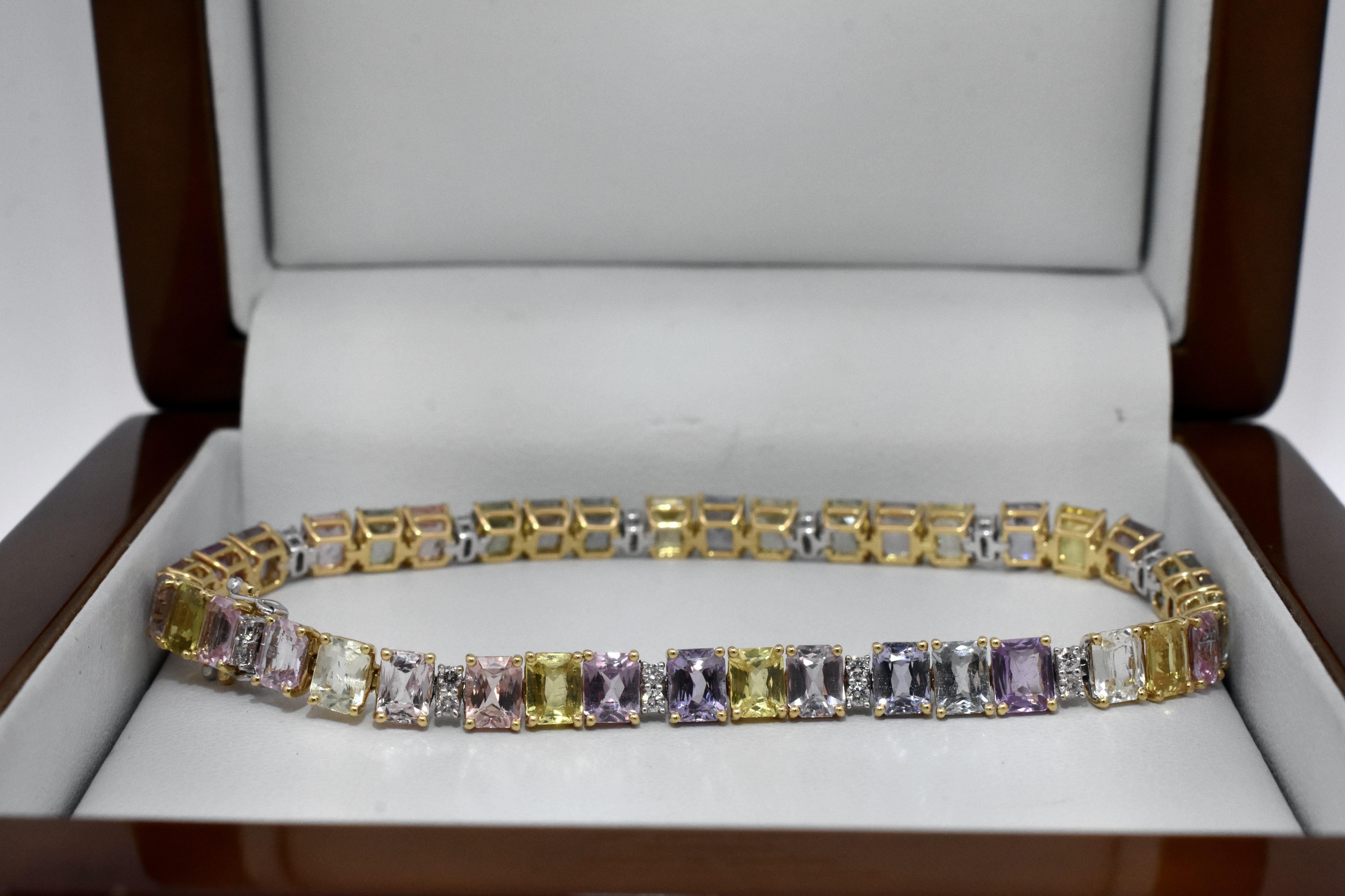 A simple yet gorgeous multicoloured display of sapphires and sparkling white diamonds, claw set in a single row of 18ct yellow gold in cushion cuts with colours including pink, yellow, blue and green with accents of round brilliant cut G/VS-SI diamonds. Total of thirty nine sapphires equalling 13.08ct and twenty six diamonds equalling 0.42ct. Bracelet length is 18cm with concealed catch and two figure of 8 safety clasps