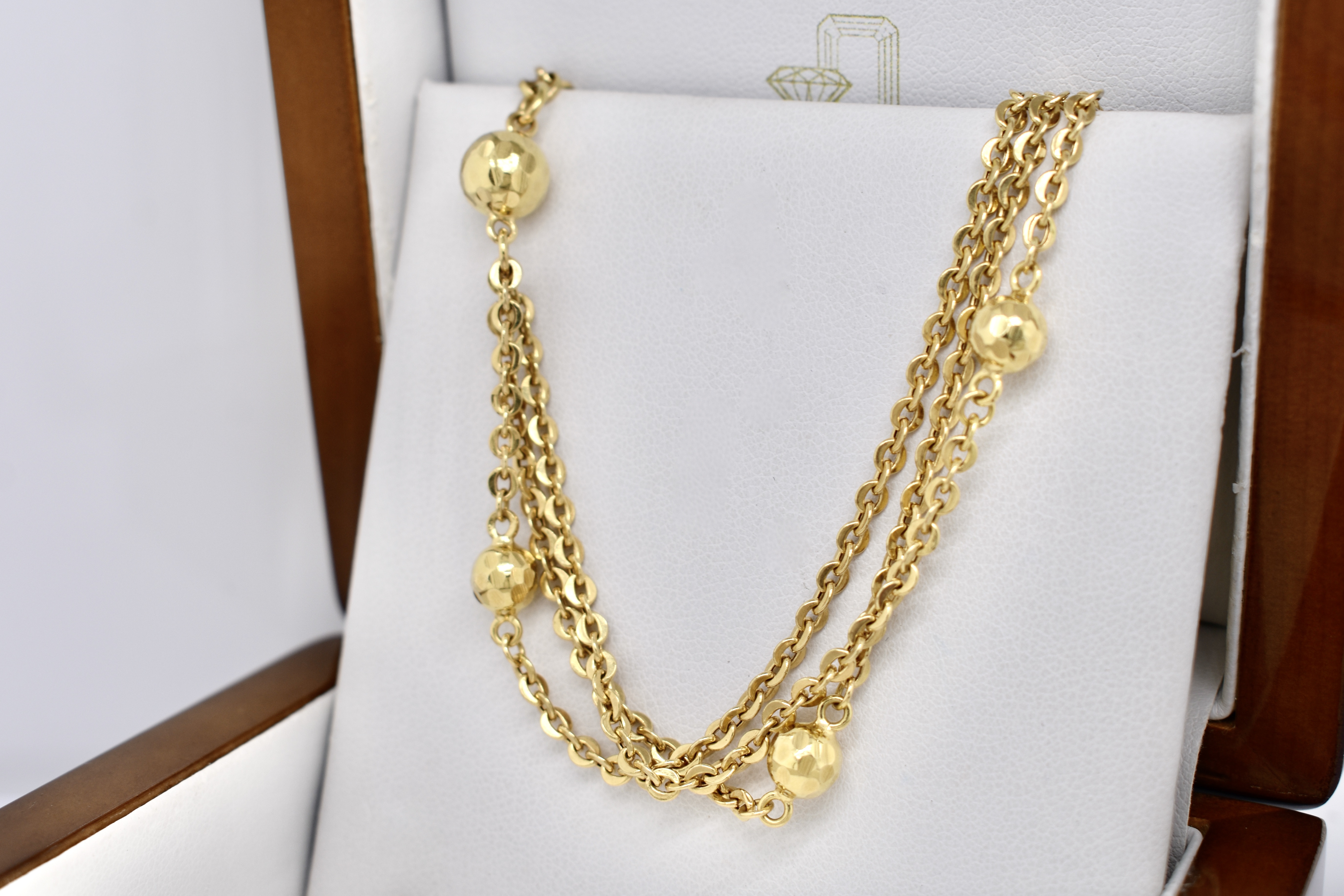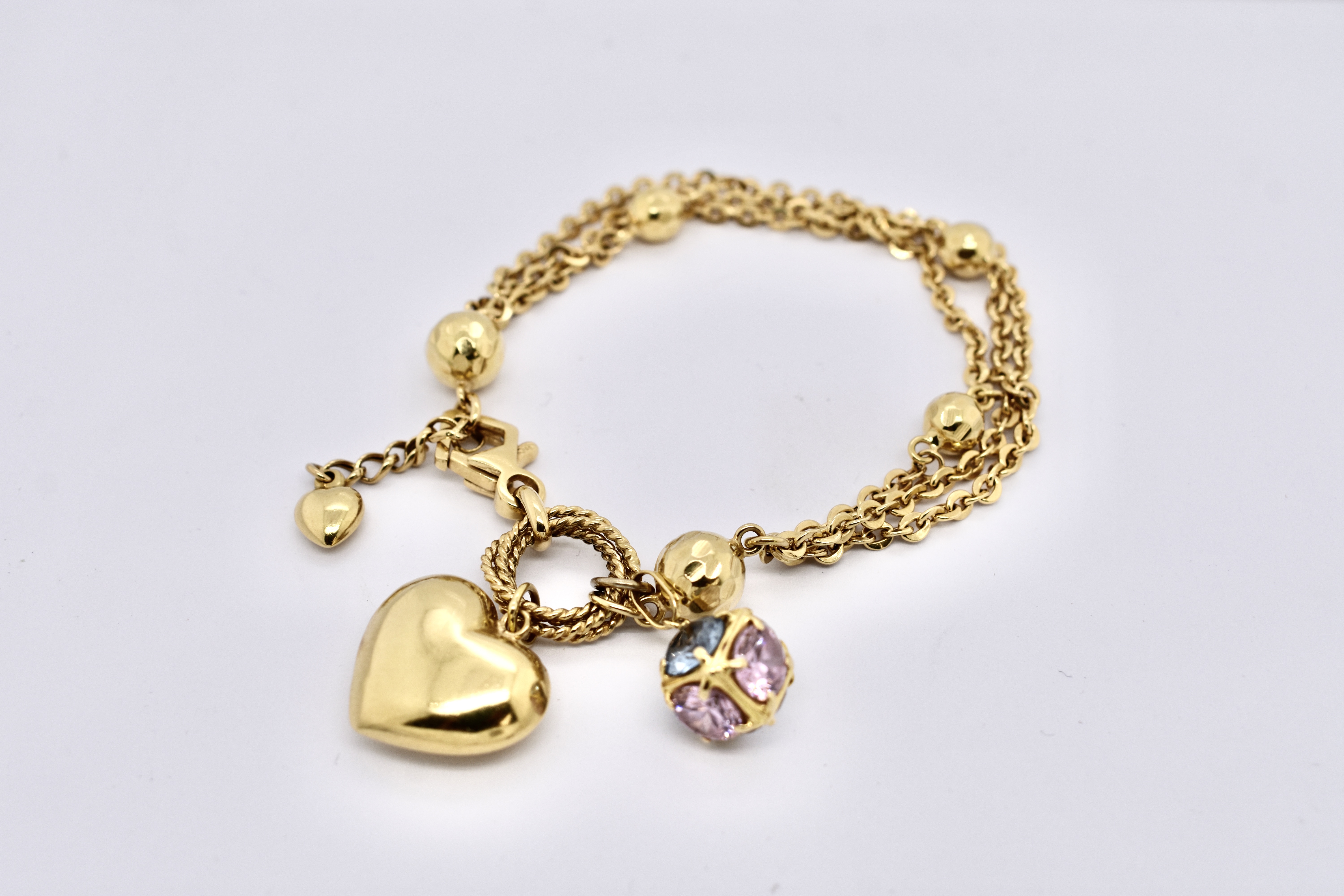 The prettiest vintage 18ct yellow gold charm bracelet, featuring a triple row 2.80mm oval trace and ball link. Bracelet measures 19cm long with a cube charm set with 6 different coloured 5.90mm cubic zirconias, including colourless, light blue and light pink. Also featuring a 18.50mm puffed hollow heart charm. Finished with a parrot clasp. Independent Valuation Supplied