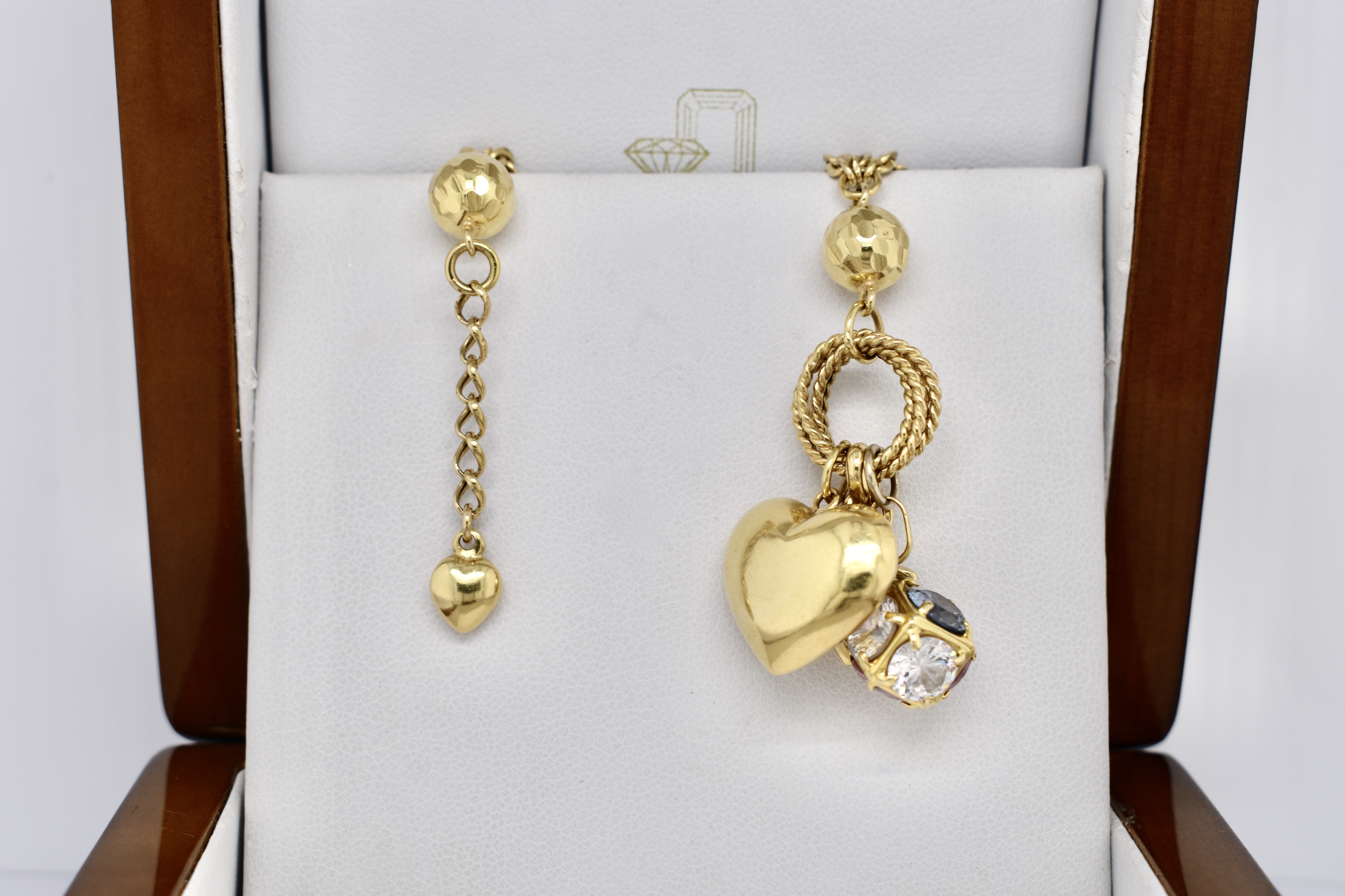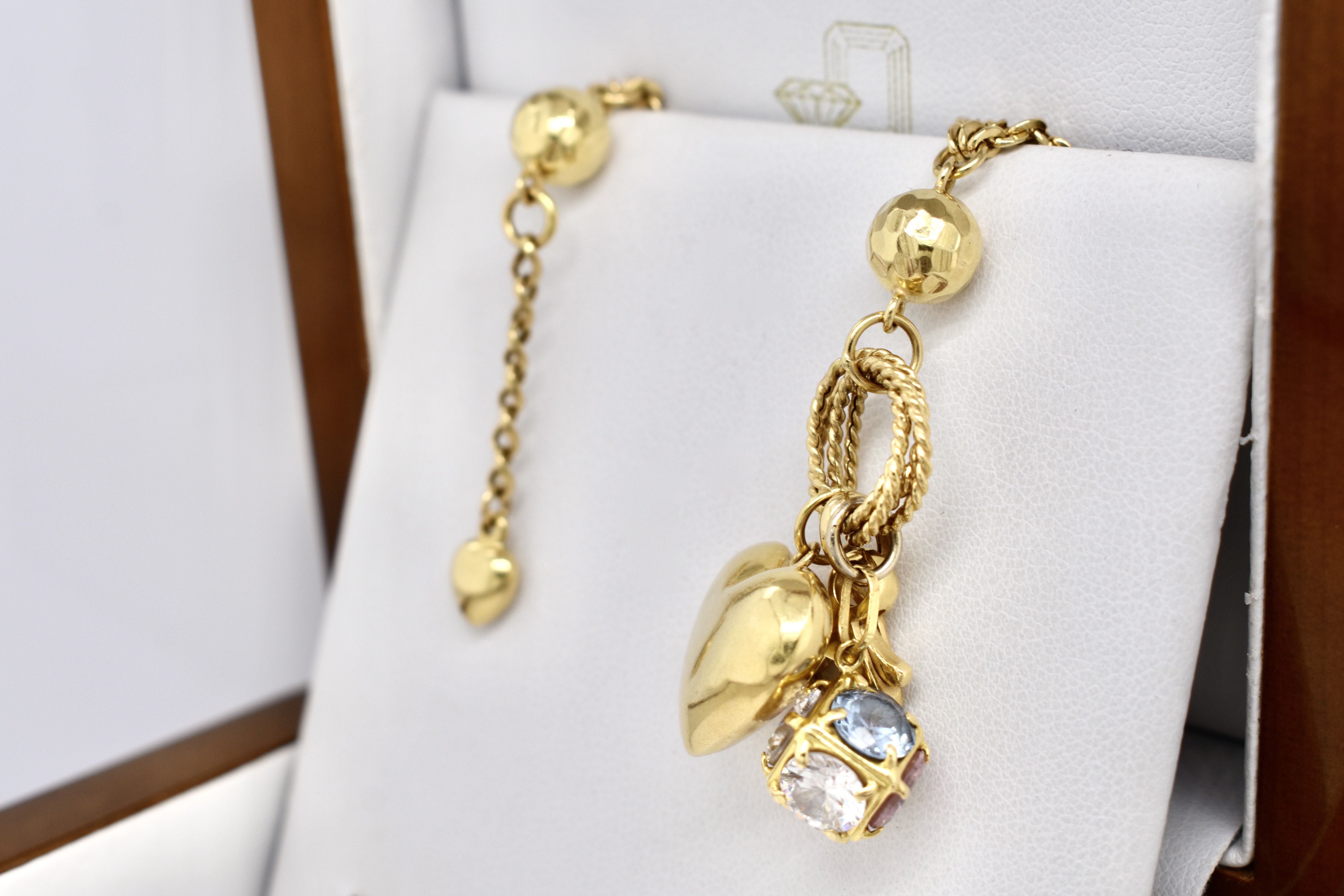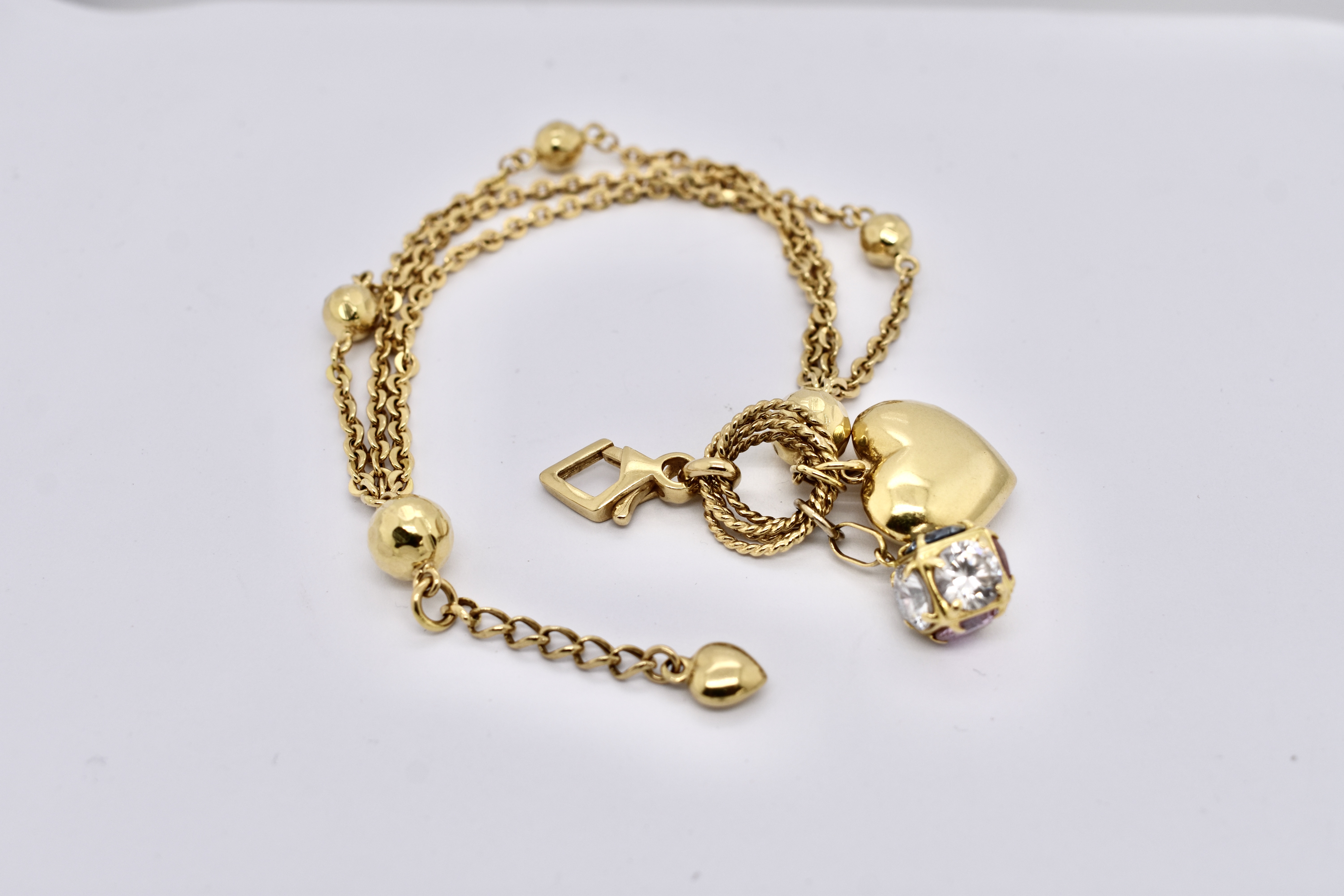 SOLD 18ct Yellow Gold Charm 19cm Bracelet with CZ Cube and Puff Heart Charm