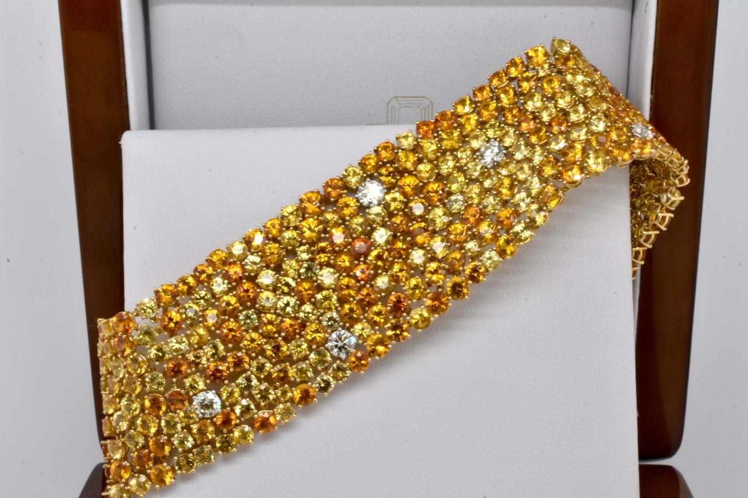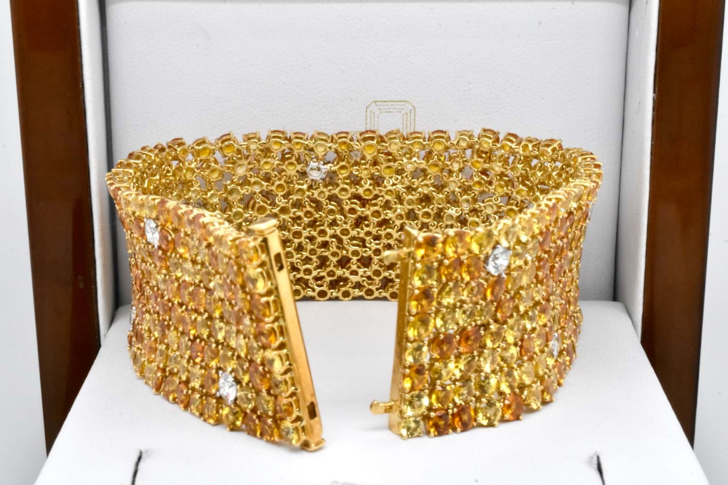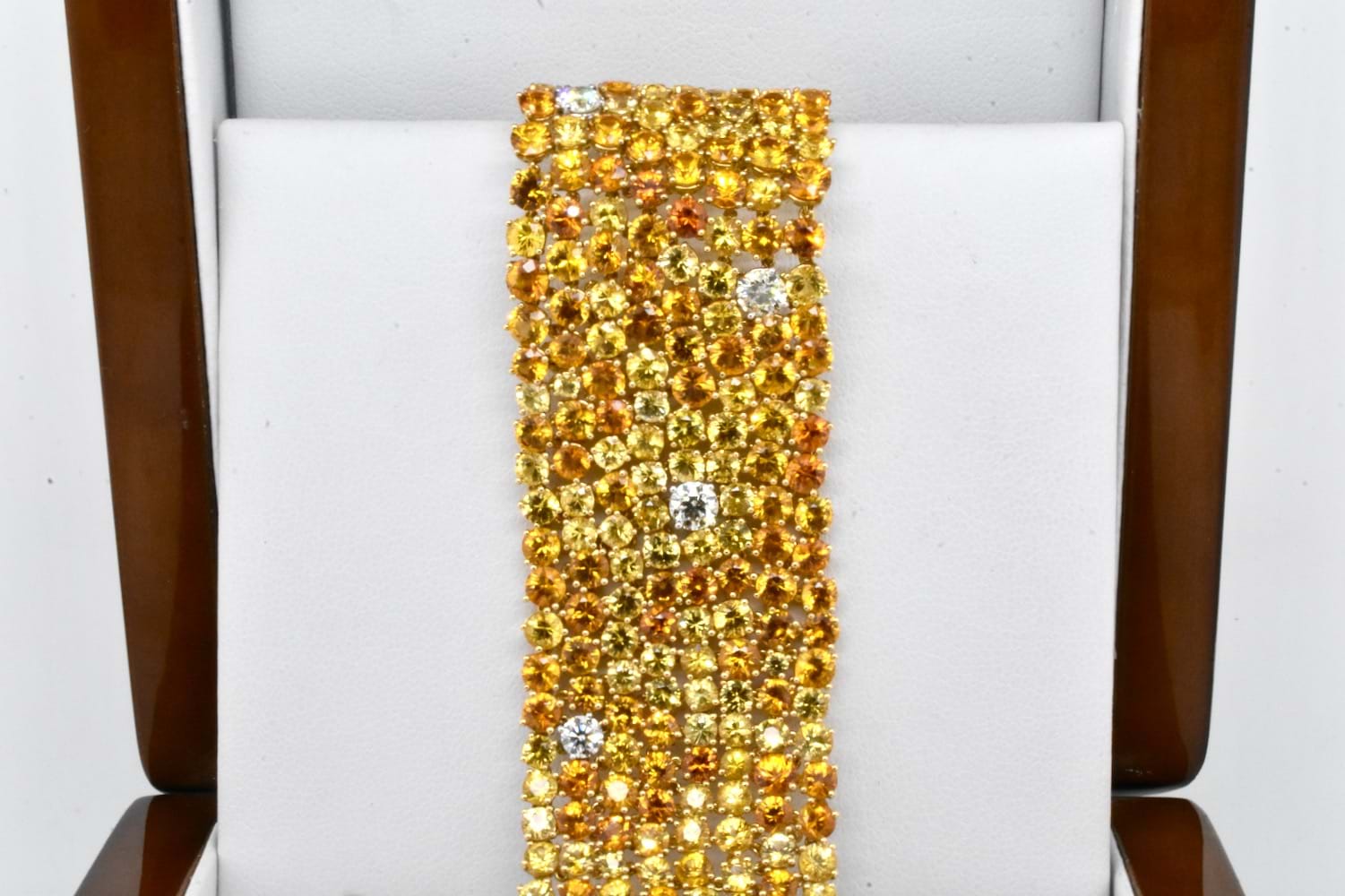 A sea of glittering gold, this 18ct yellow gold bracelet features 425 round sapphires totalling 63.10ct in varying shades of yellow and orange with a tasteful scattering of 10 sparkling, very slightly yellow tinted IJ/VS diamonds equalling 2.09ct which compliment the yellow tones perfectly, all claw set and with a secure concealed clasp. Bracelet is approx. 26mm wide and 18cm long