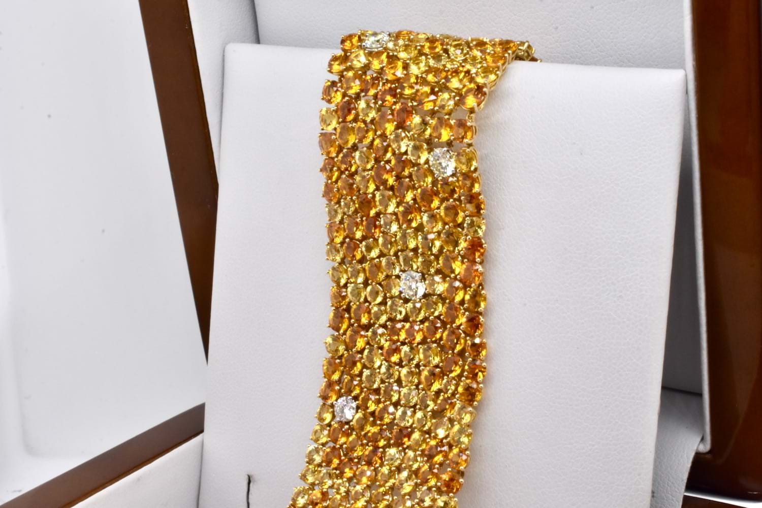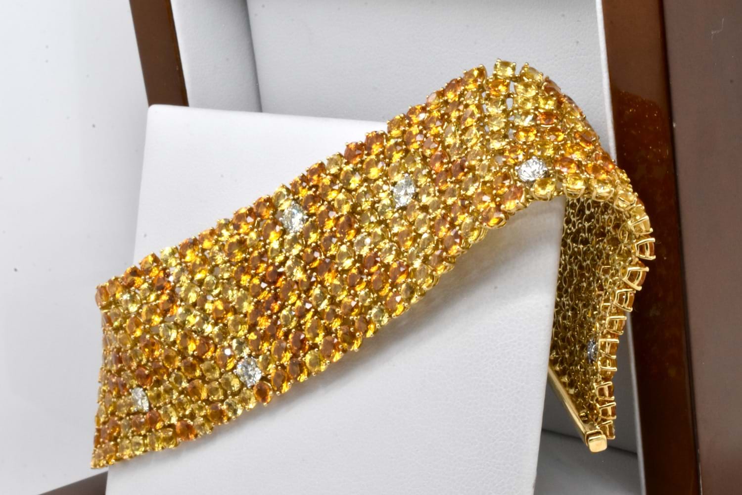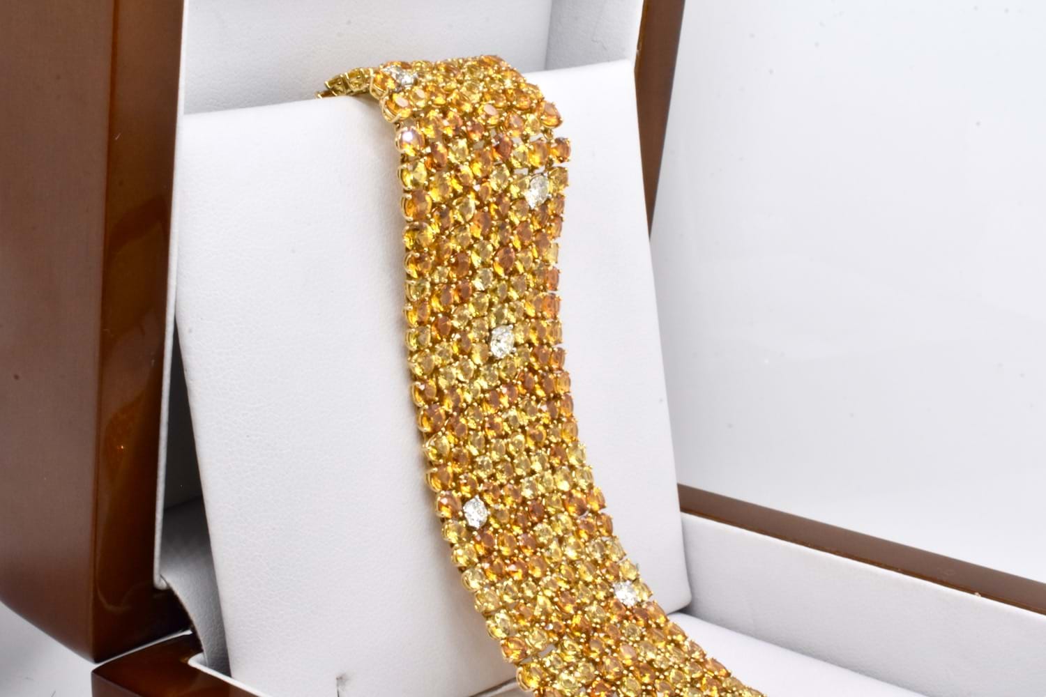 A sea of glittering gold, this 18ct yellow gold bracelet features 425 round sapphires totalling 63.10ct in varying shades of yellow and orange with a tasteful scattering of 10 sparkling, very slightly yellow tinted IJ/VS diamonds equalling 2.09ct which compliment the yellow tones perfectly, all claw set and with a secure concealed clasp. Bracelet is approx. 26mm wide and 18cm long