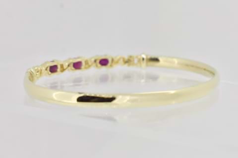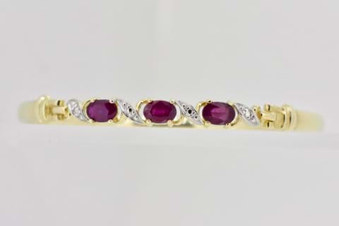 9ct yellow gold hinged Ruby Bangle. 3 Oval, Natural Rubies total an impressive 2.25ct. Independent Valuation Supplied