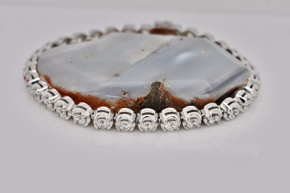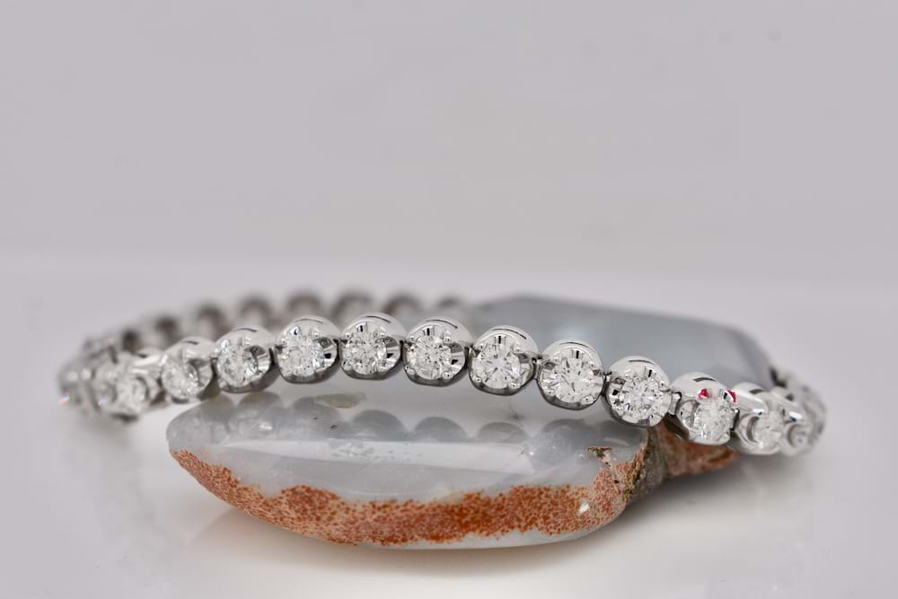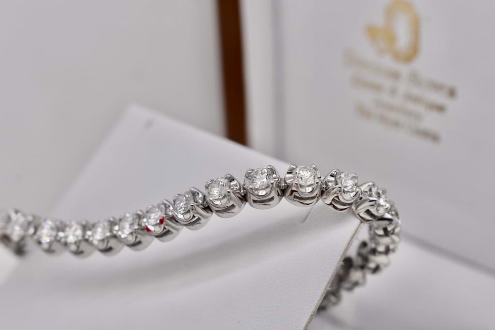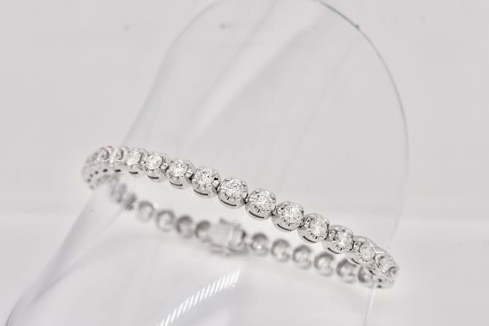 Set in 9ct white gold this striking tennis bracelet features 32 round brilliant cut diamonds totalling 6.00cts (GH/P1), each diamond is individually four claw set with concealed box clasp and two figure eight safety catches.