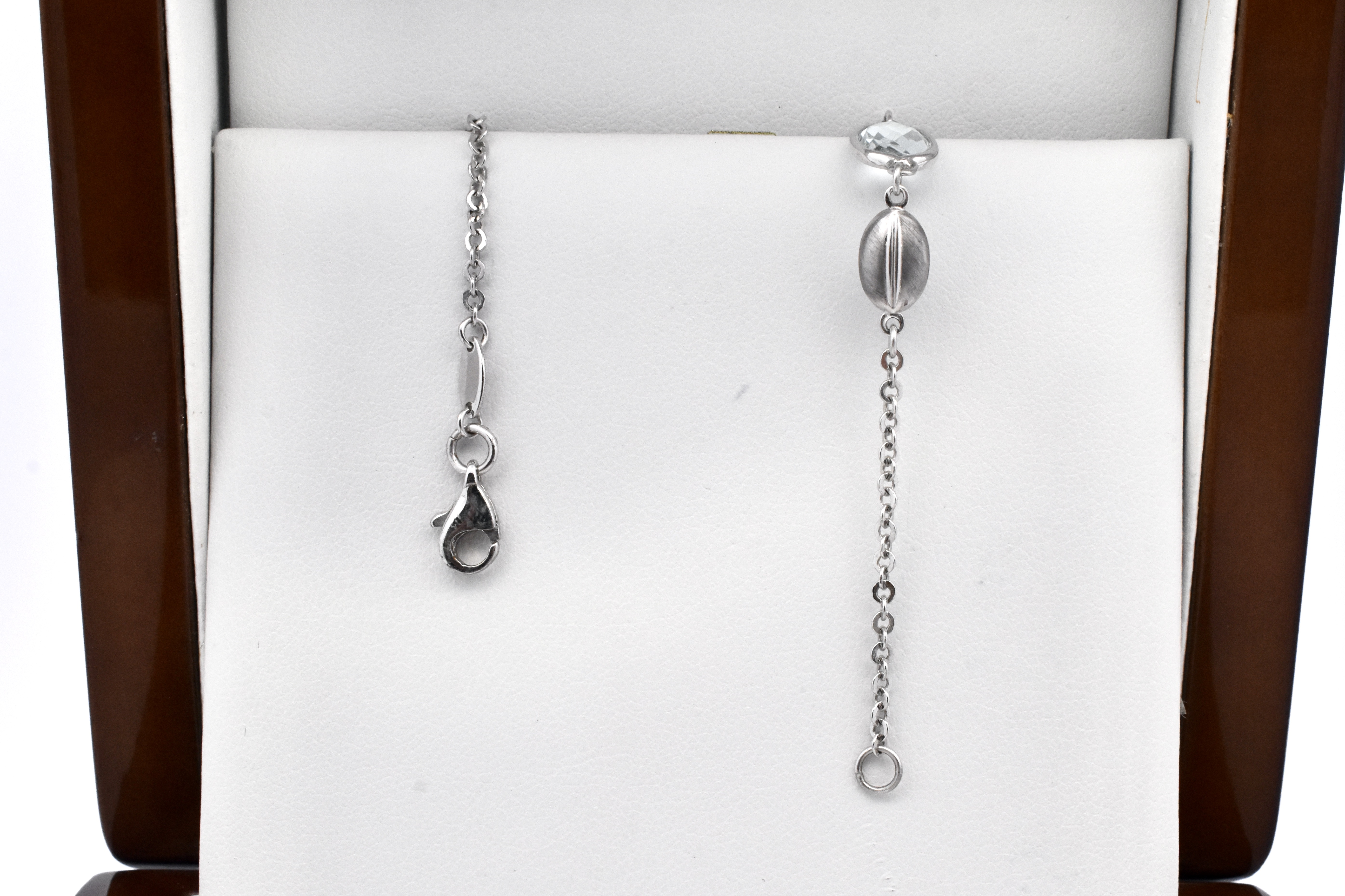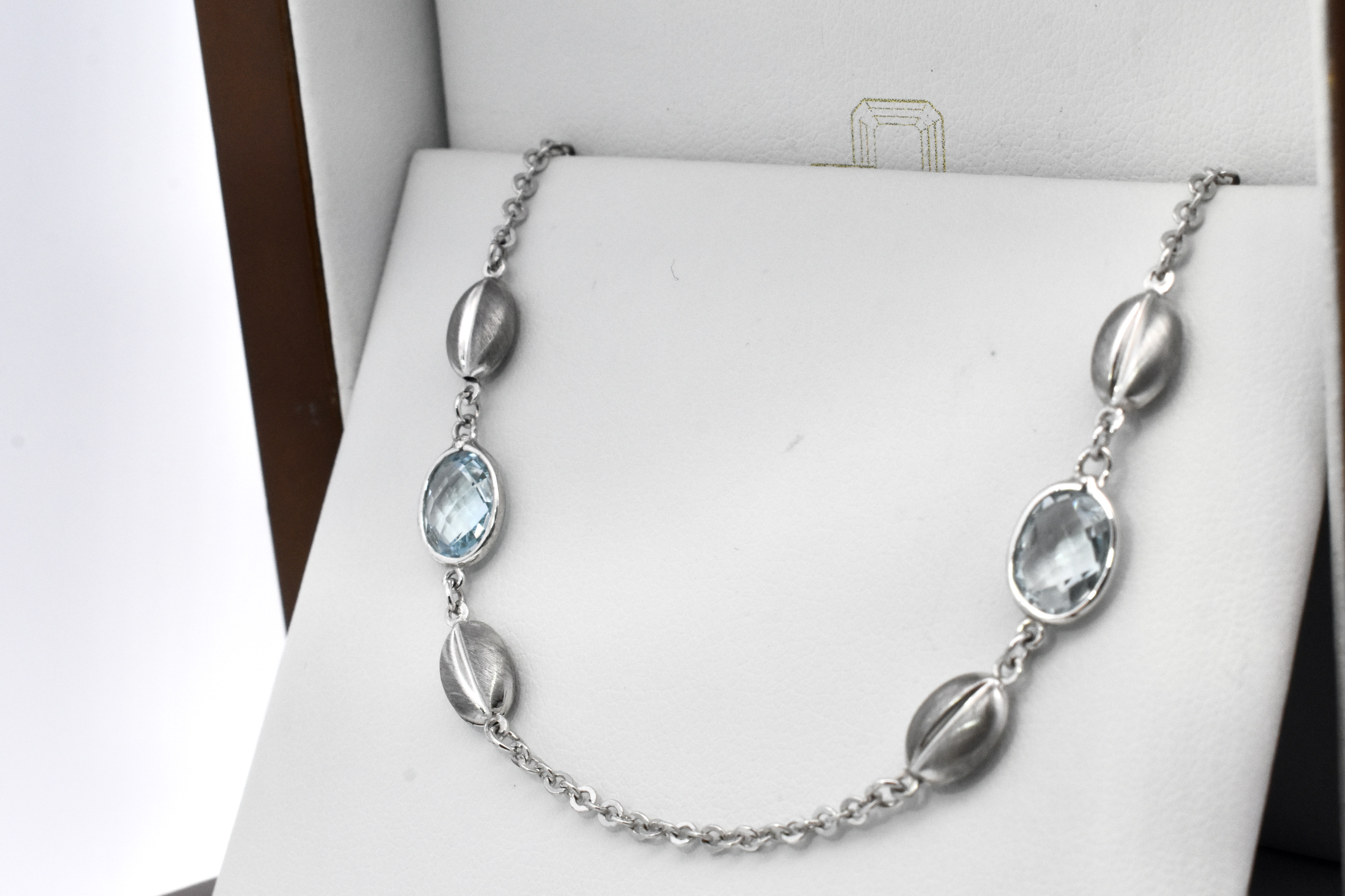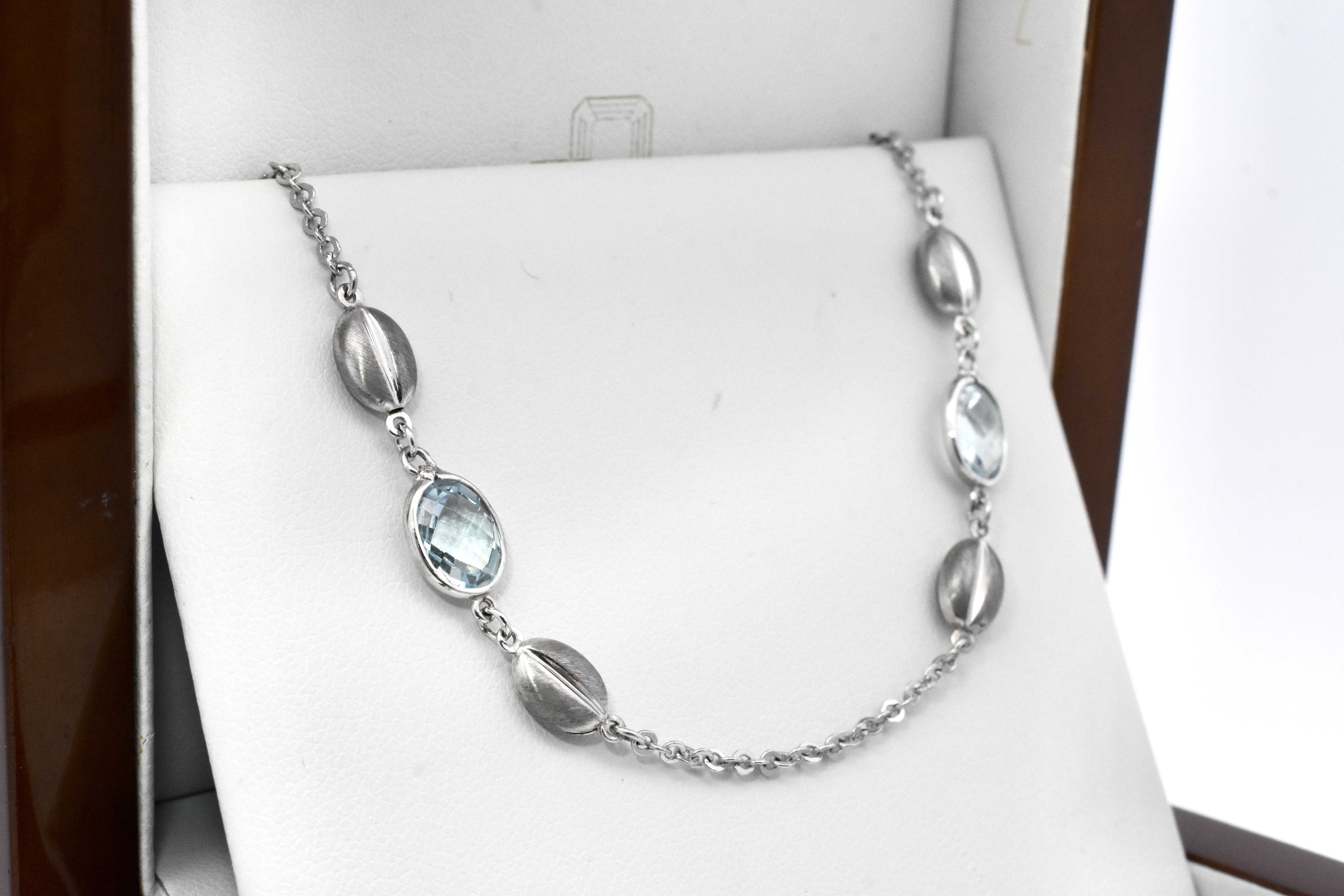 A fine 9ct white gold cable link bracelet set with two faceted blue topaz in a bezel setting, each flanked by a polished white gold peanut link. A beautiful dress bracelet