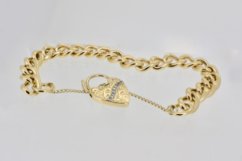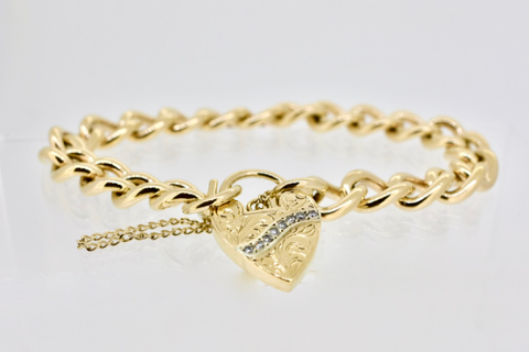 This beautifully handcrafted, 9ct yellow gold, curb link bracelet has been paired with an elegant, flat, engraved and diamond set heart padlock. The padlock features a white gold ribbon across the front set with eight round brilliant cut diamonds totaling 0.16cts. Total weight 44.13grams. Independent Valuation Supplied