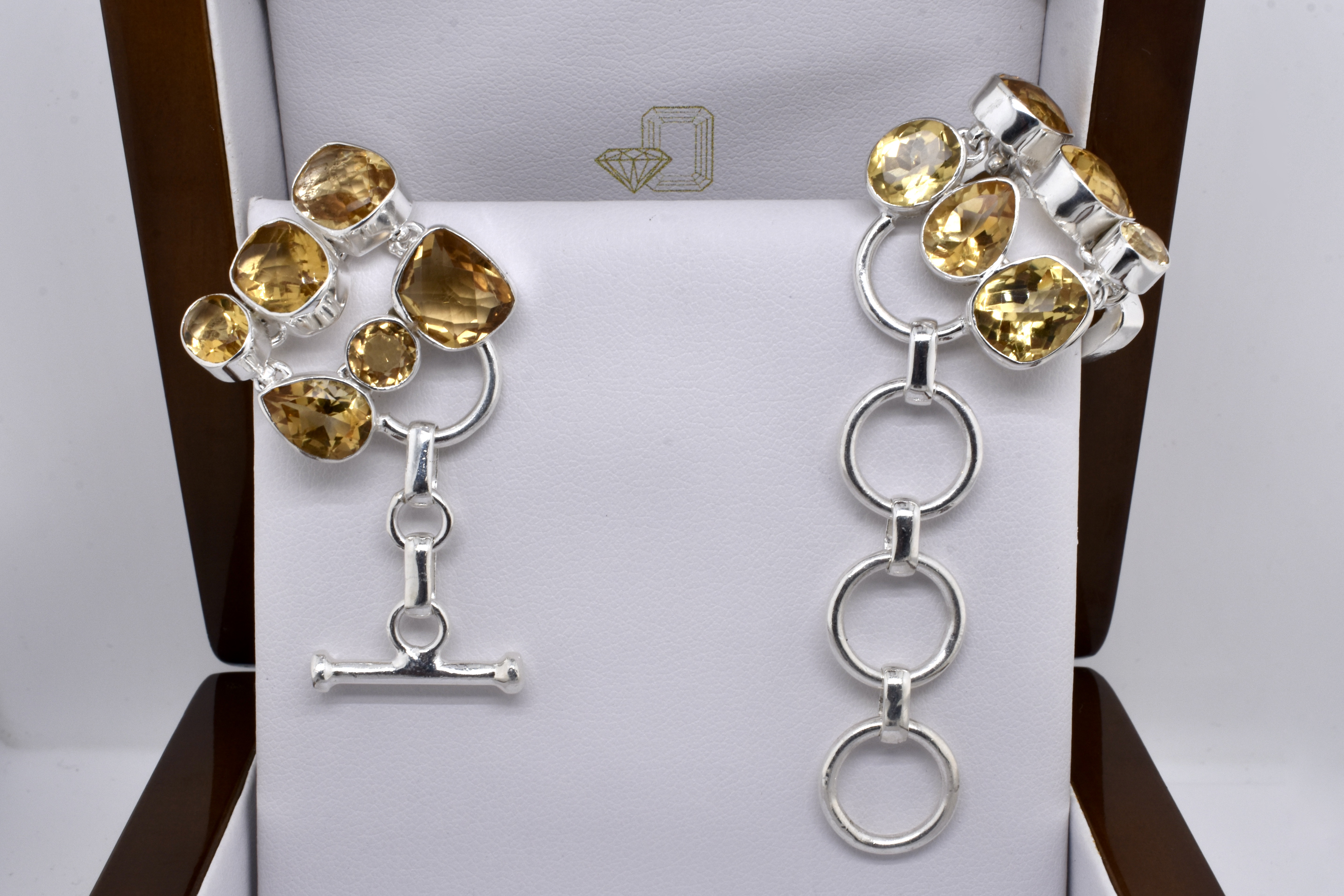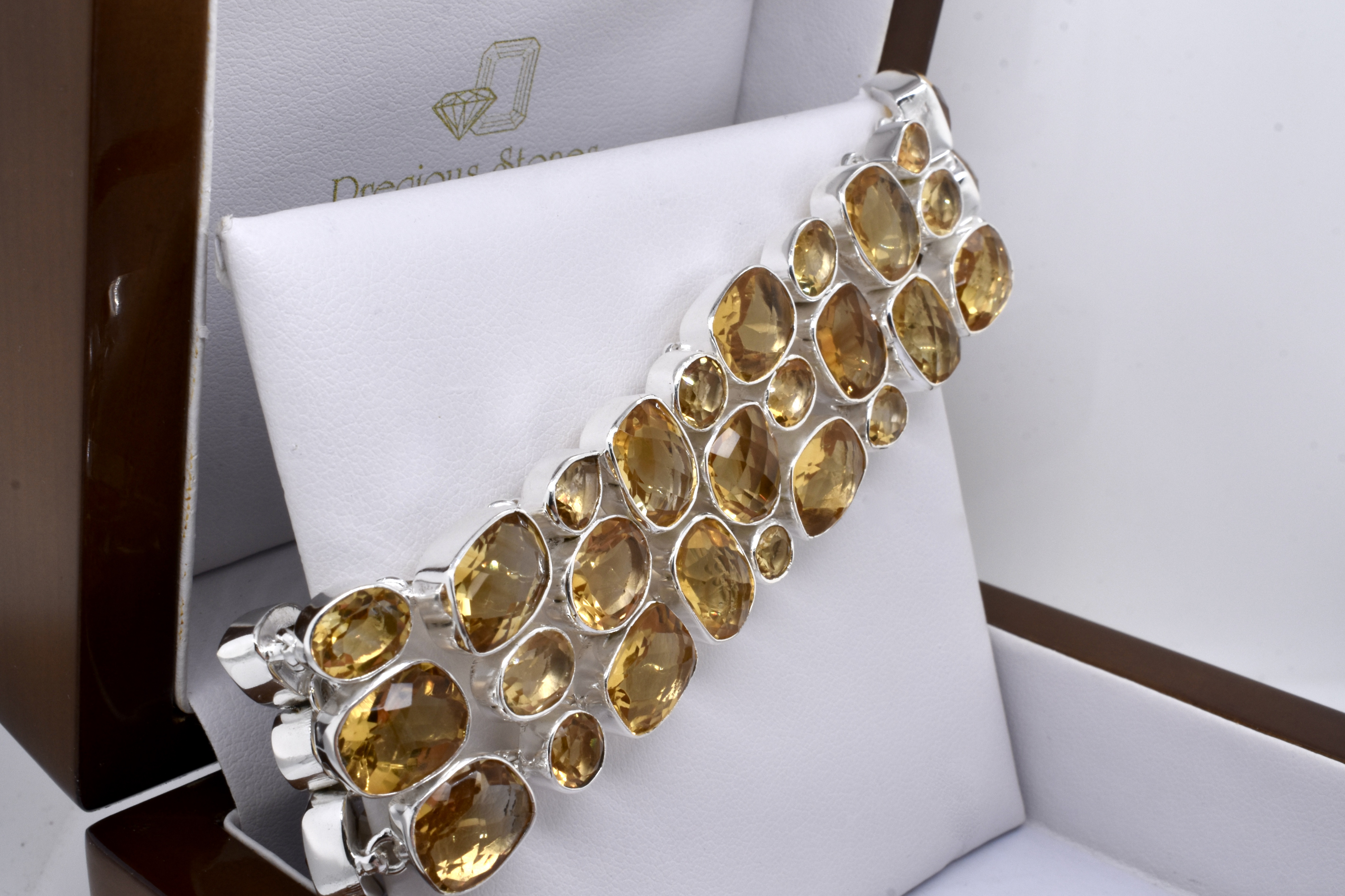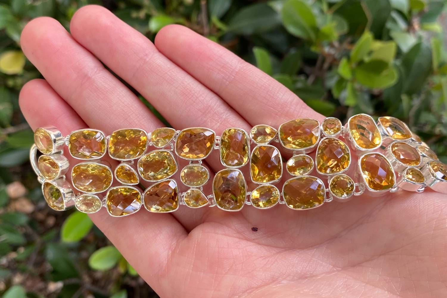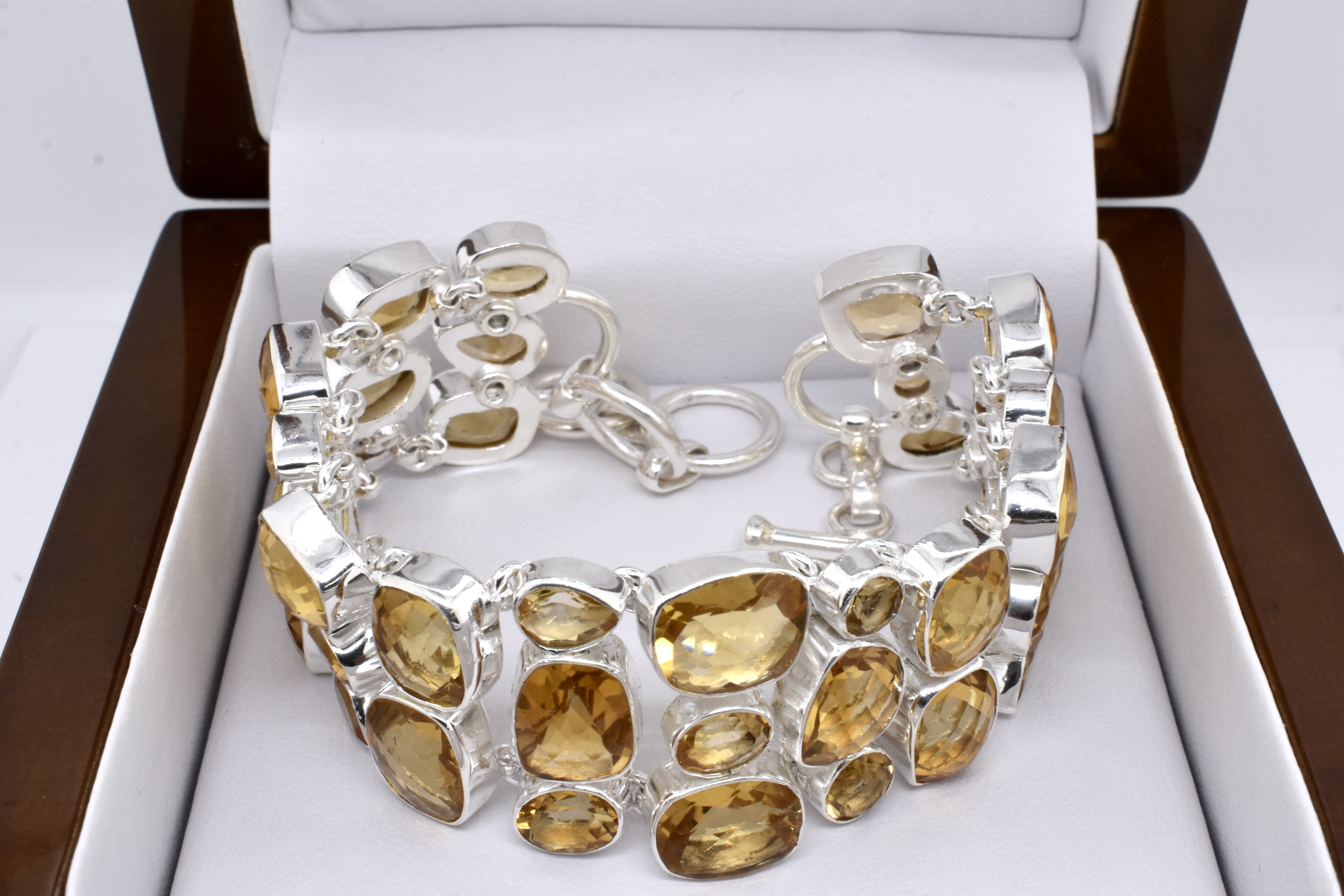 This sterling silver bracelet is set with many beautiful, freeform shape citrine with pretty chequerboard faceting, all bezel set and interconnected. Bracelet has a T-bar closure and is 19cm long with a 3cm extension making it 22cm at its longest