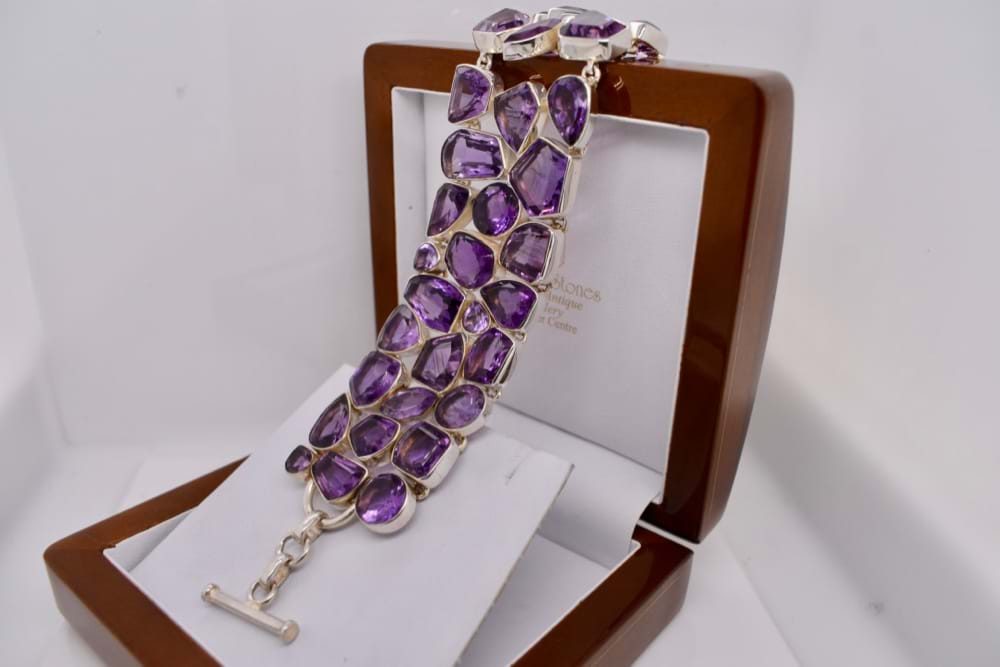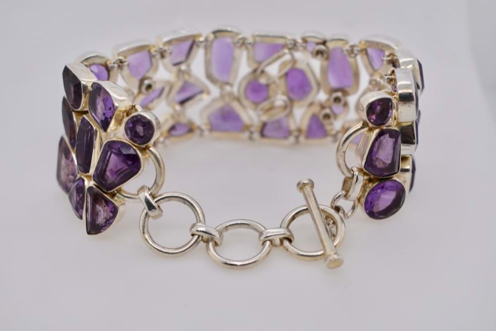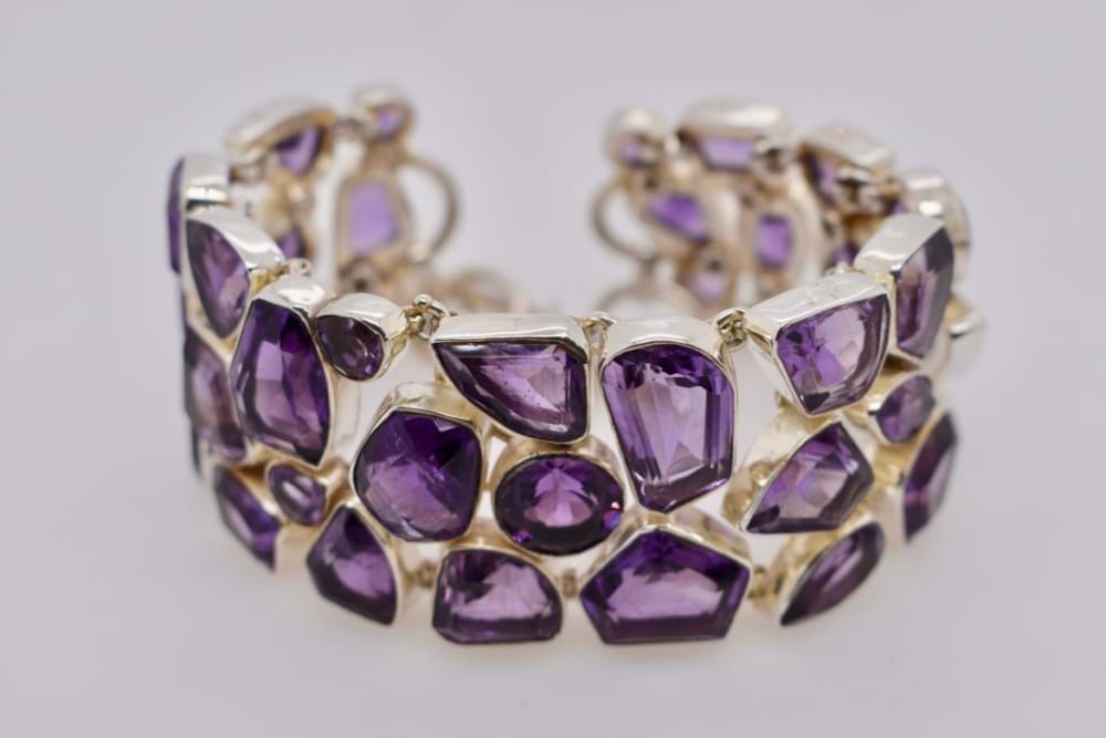 Sterling silver 30cm wide adjustable bracelet bezel set with multi shaped natural Amethyst. Adjustable from 18-21cm