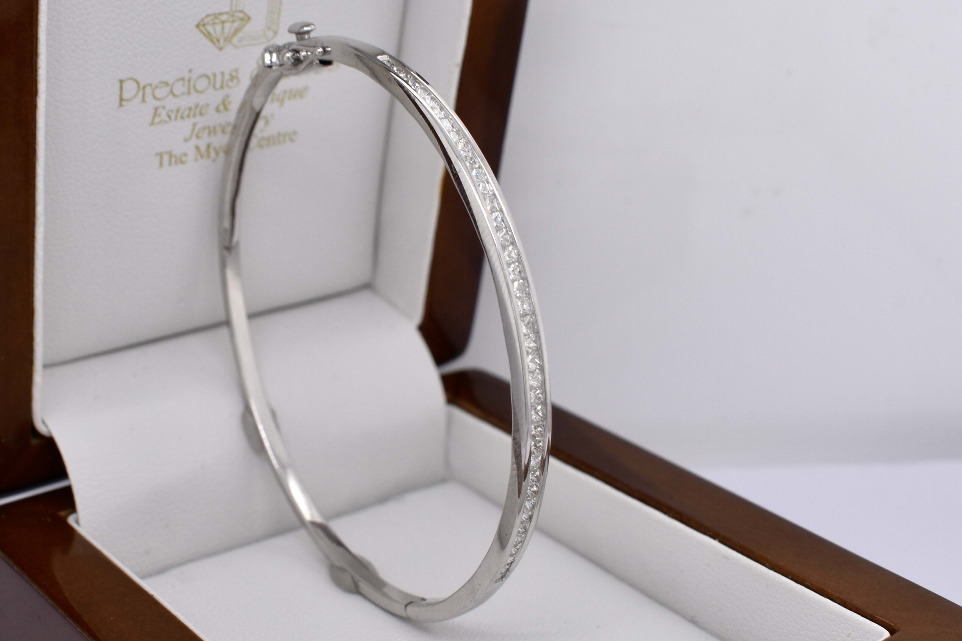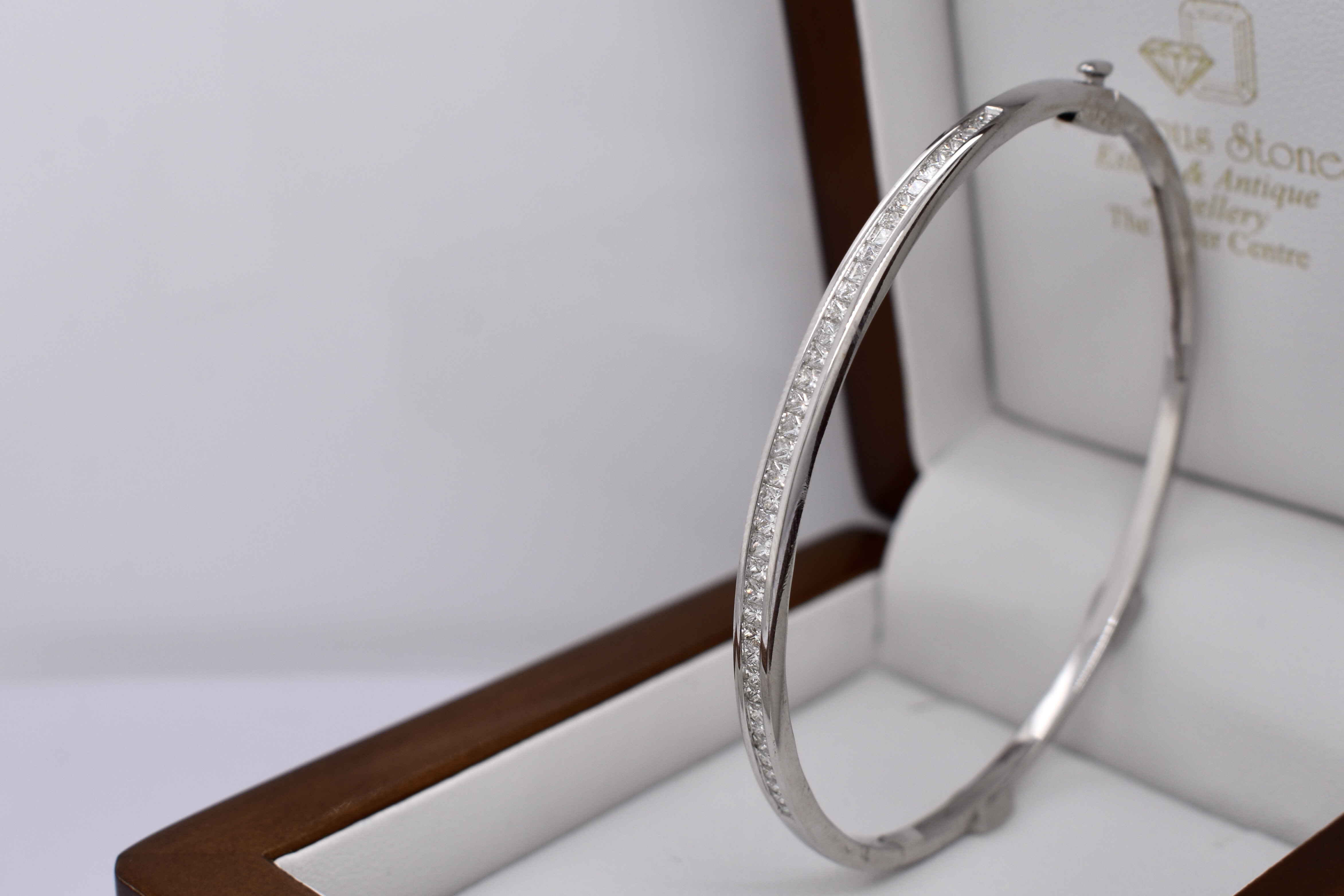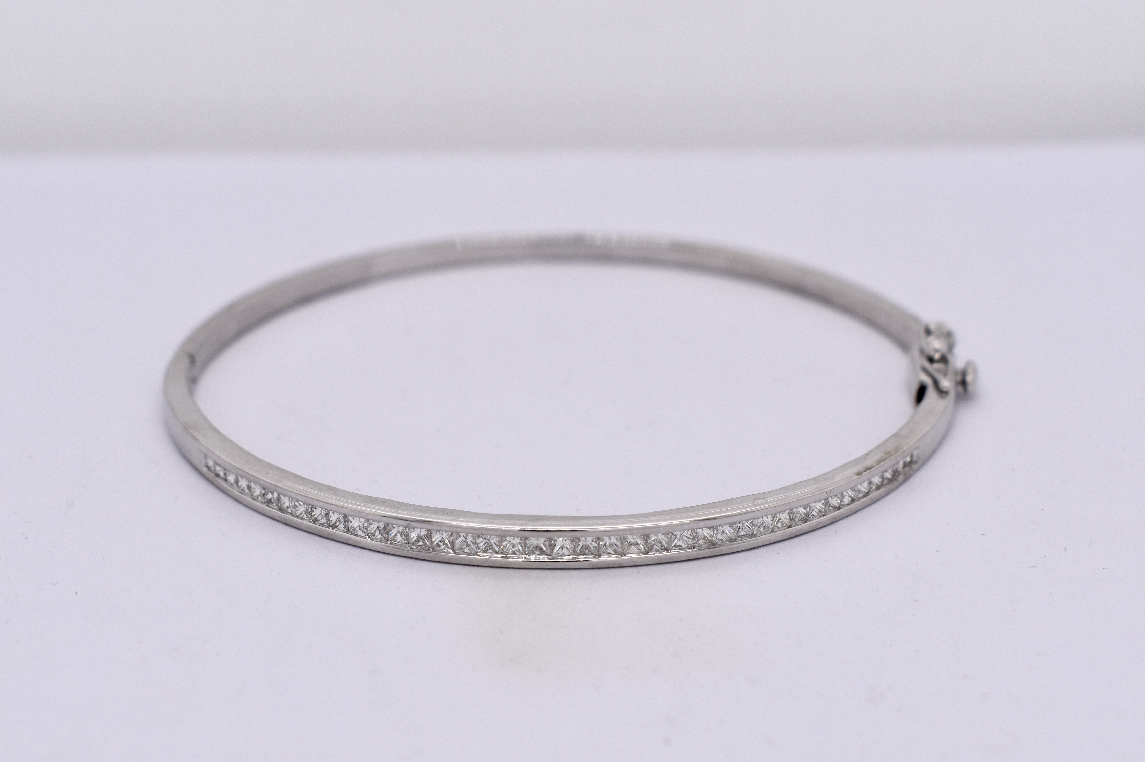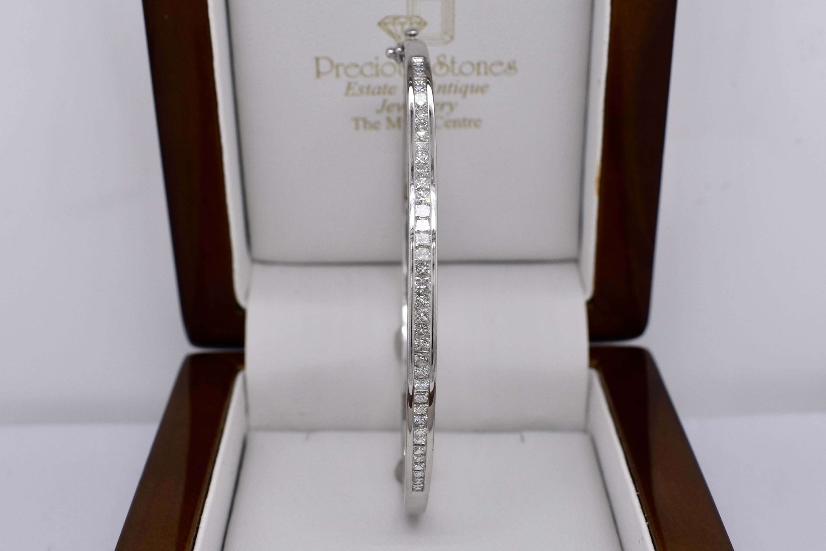 Elegant secondhand bargain! This classy 18ct white gold bangle features 39 princess cut 1.80mm diamonds, totalling 1.00ct H VS-SI, all channel set in an oval hinged 3.52-2.41mm bangle. Bangle is secured with a concealed box clasp and figure 8 safety catch. 12.25 grams. Independent valuation supplied.