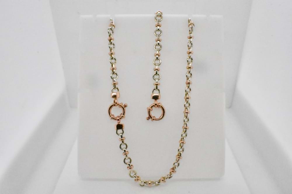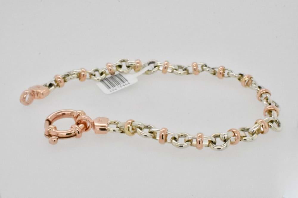 A beautifully handcrafted 9ct rose and white gold bracelet with rose gold end finials and boltring clasp. Measuring 19cm and weighing 14.25grams this bracelet has a matching chain which is available for separate purchase (20275457).