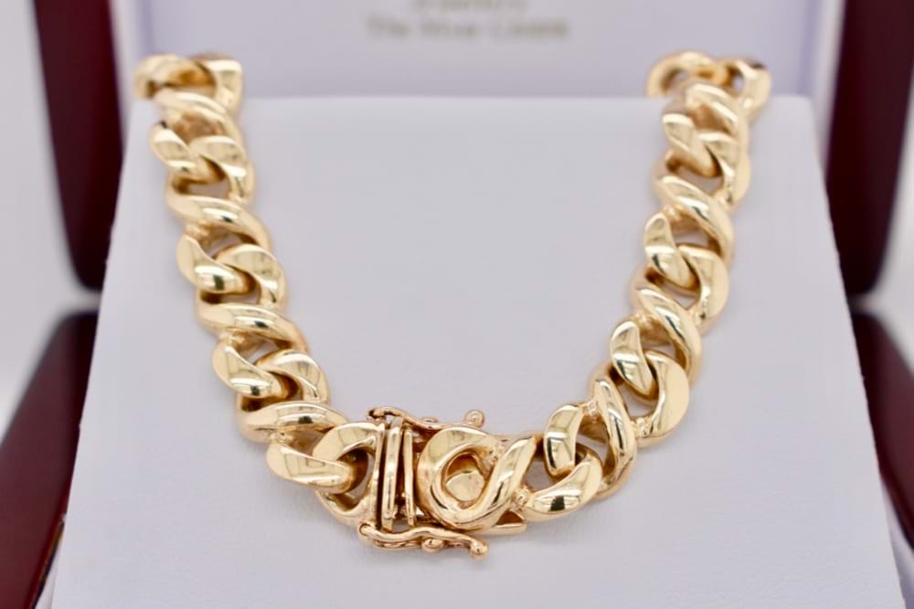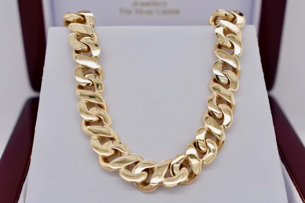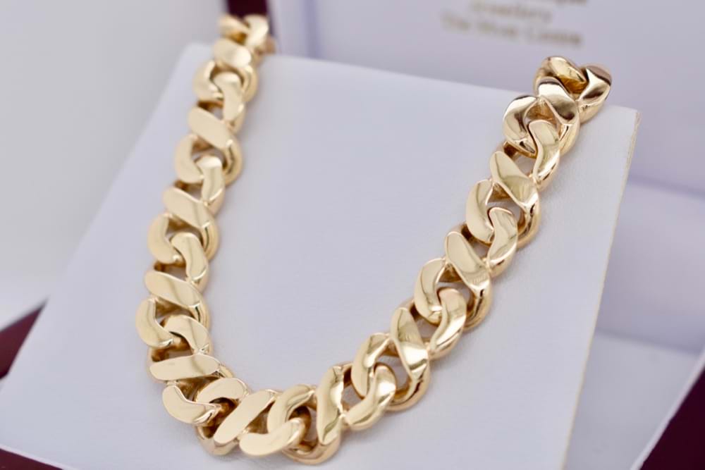 A different interpretation of a curb link bracelet, rounded on the exterior and flat on the inside with a tongue and groove clasp and two figure of 8 safety catches. Crafted in 9ct yellow gold total weight 36.18grams