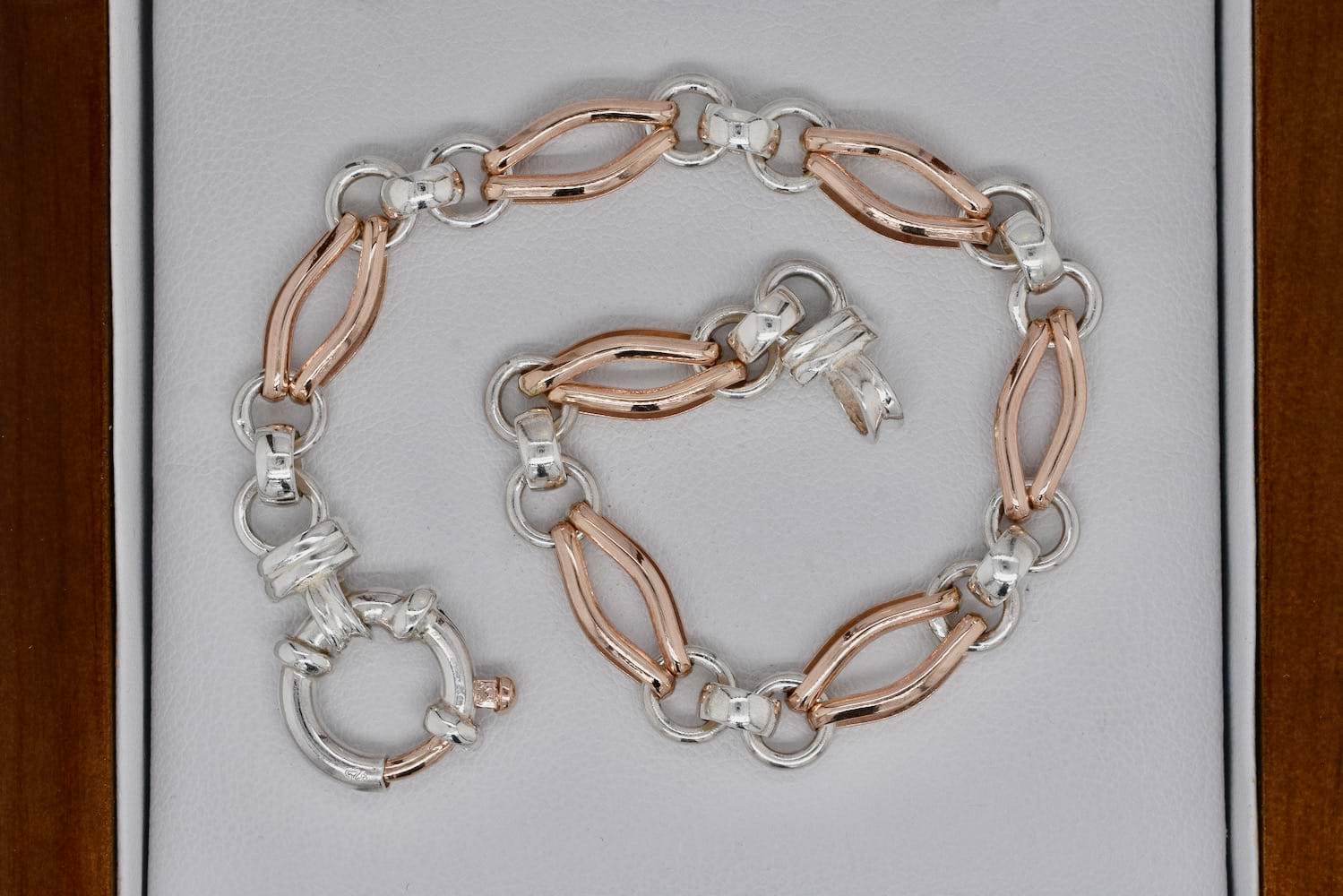 This 9ct rose gold and sterling silver bracelet features an open marquise link alternating with a classic belcher link with end finials and a two tone bolt ring clasp. Length: 20cm
