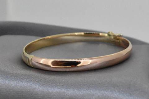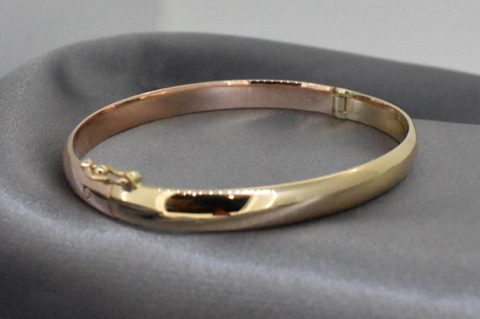 Beautifully crafted in 9ct two tone, this solid hinged bangle is rose gold on one side and yellow gold on the other. Measuring 6x60mm, this hinged bangle makes a versatile and stunning addition to your jewellery collection.