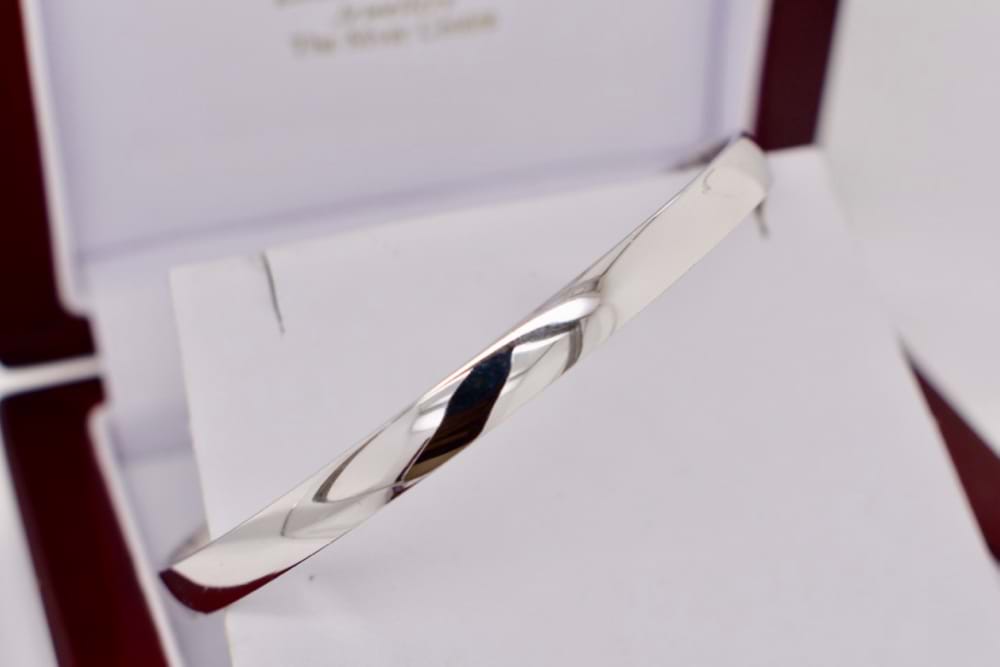 A solid 9ct white gold bangle with a 5mm wide half round profile and internal round fit of 62mm. Total weight 16.45grams