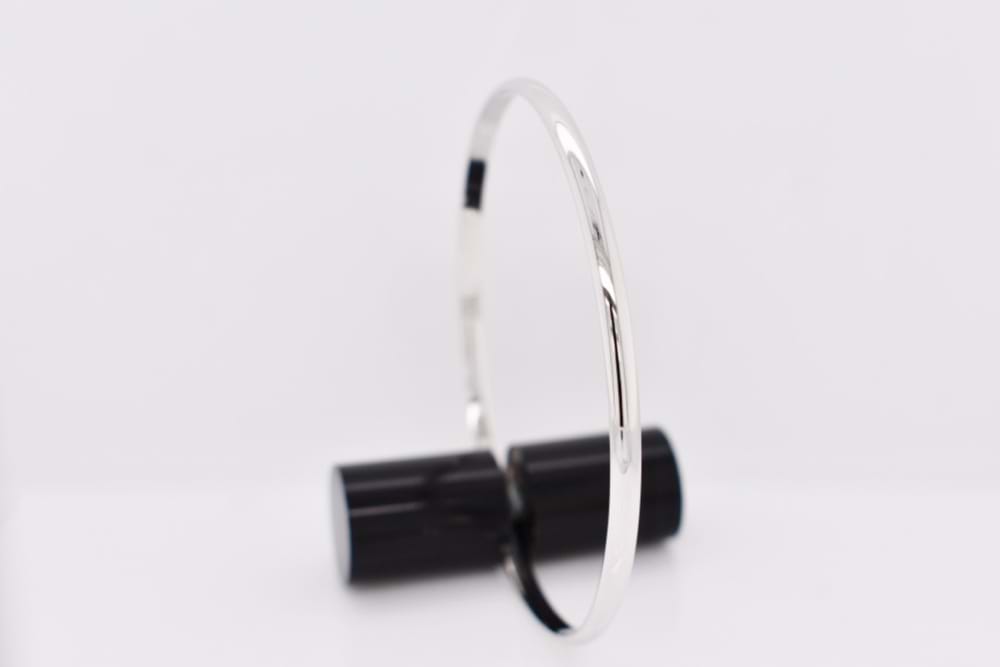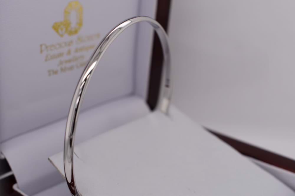 Solid 9ct white gold bangle, half round profile 3mm wide with an internal round fit of 62mm. Weight 8.9grams.