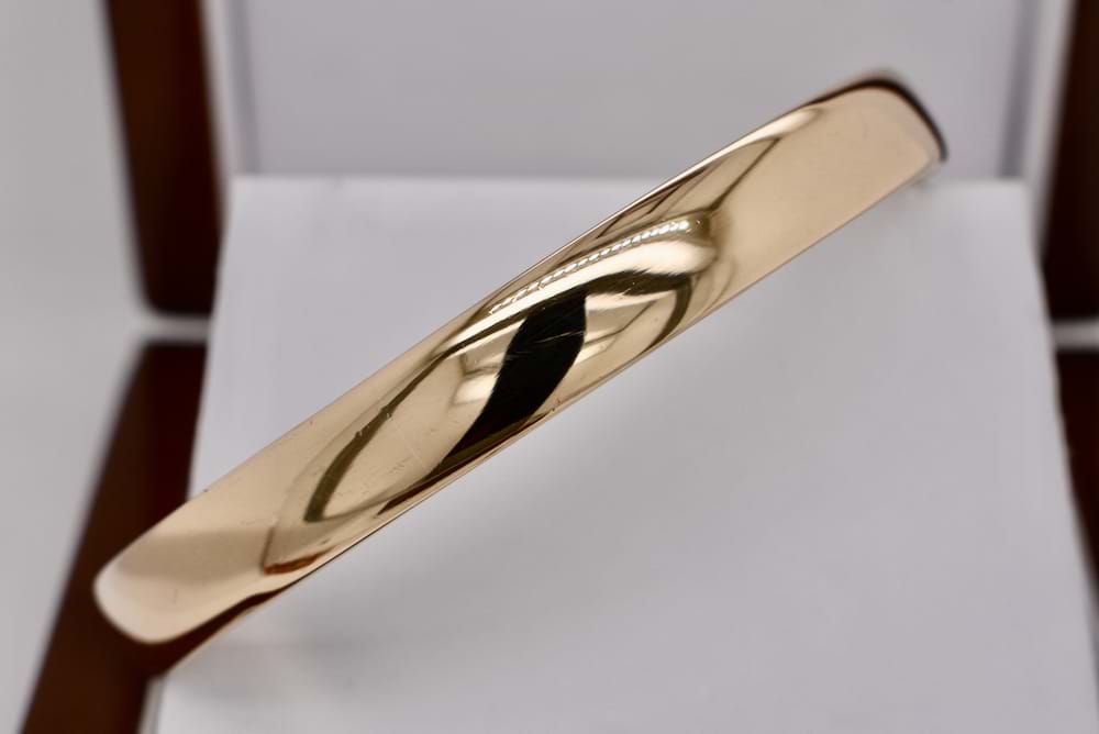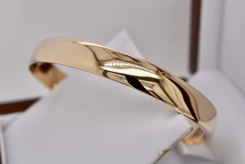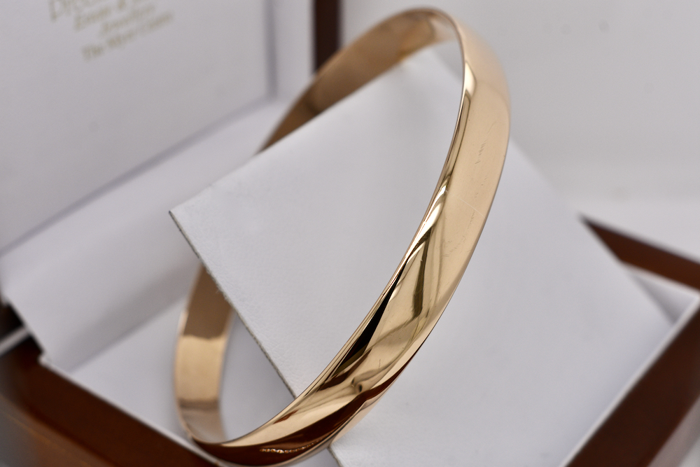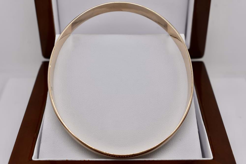 An oval shaped solid 9ct yellow gold bangle measuring 68 x 60mm internally by 8.5mm wide. Bangle weight is 26.5 grams