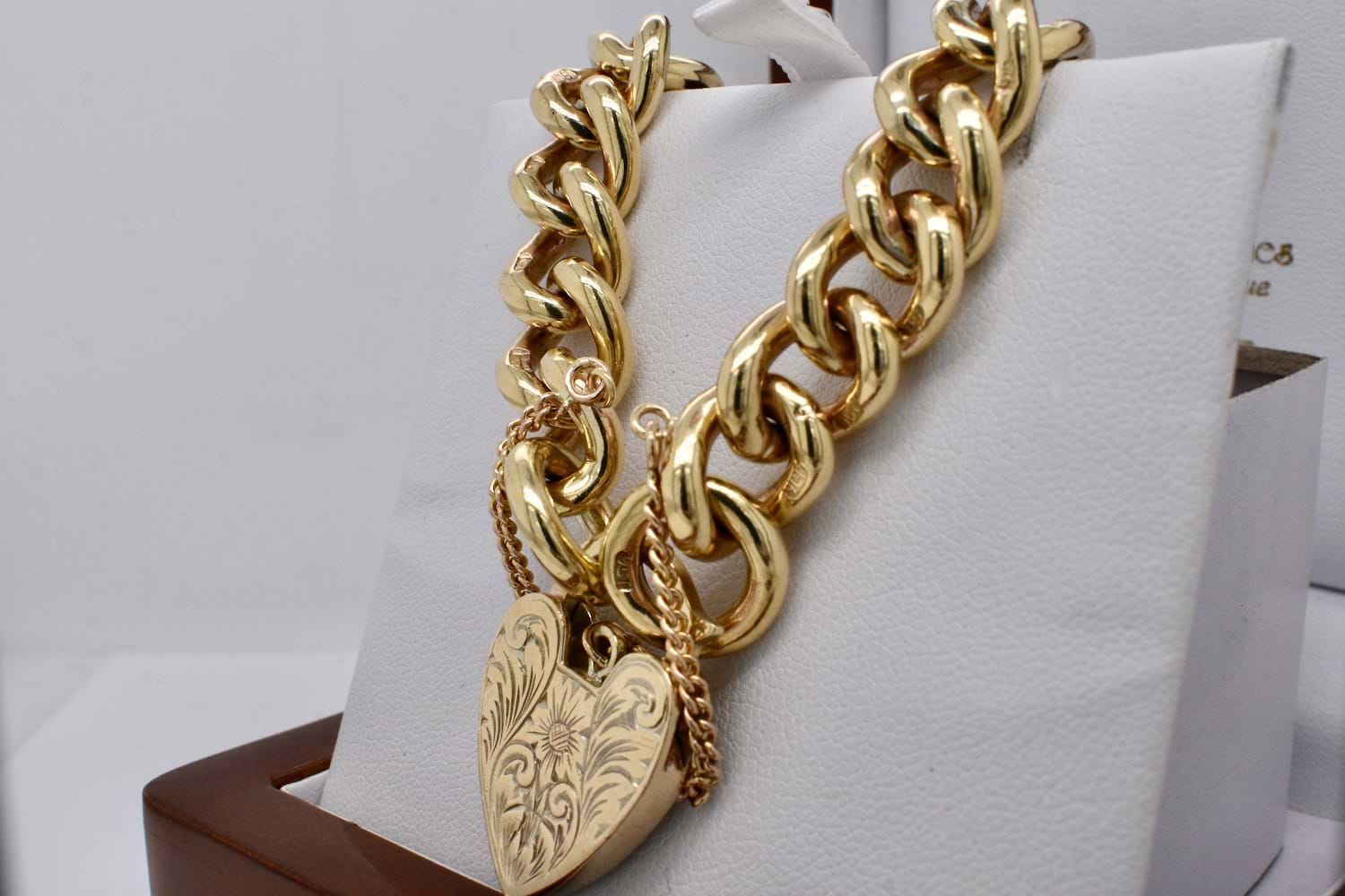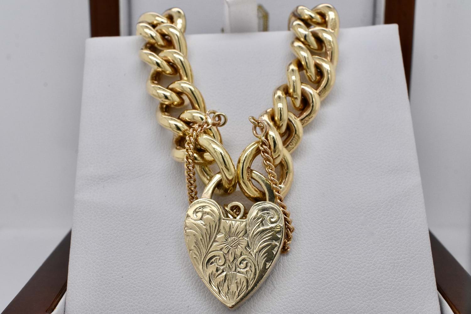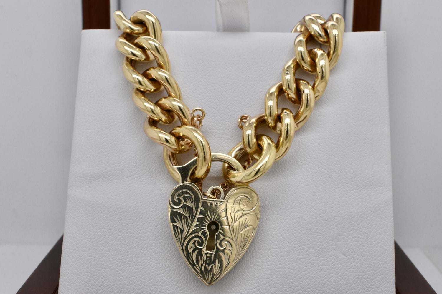 This chunky solid 9ct yellow gold curb link bracelet has two large end rings to accommodate the striking and equally chunky engraved heart padlock and safety chain. Approx length of bracelet is 20cm, width 11mm. Weight: 68.88grams