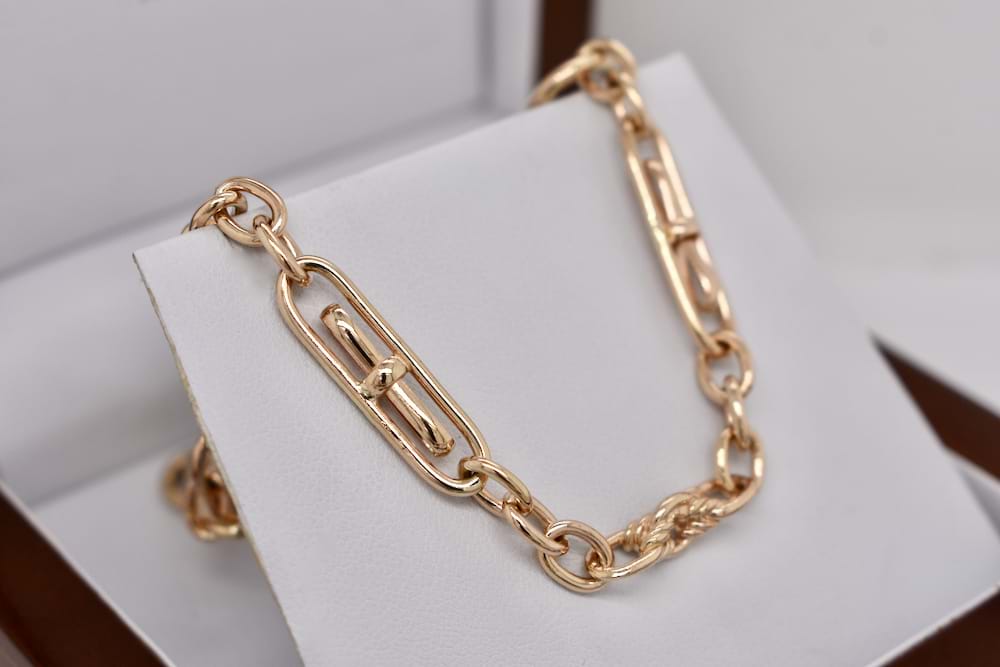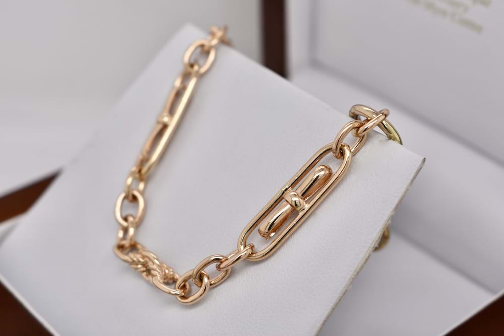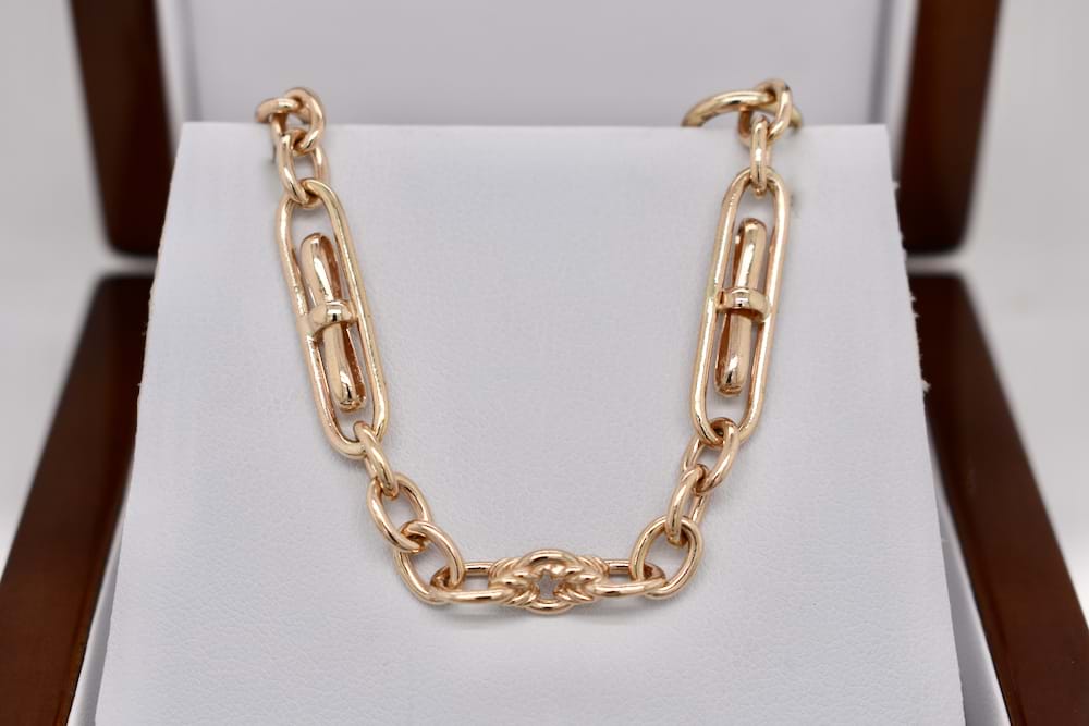 This pretty 9ct yellow gold bracelet has Birmingham bow links with one swivel, handmade by our goldsmith. The bracelet measures 19.5cm long and weighs 13.1 grams