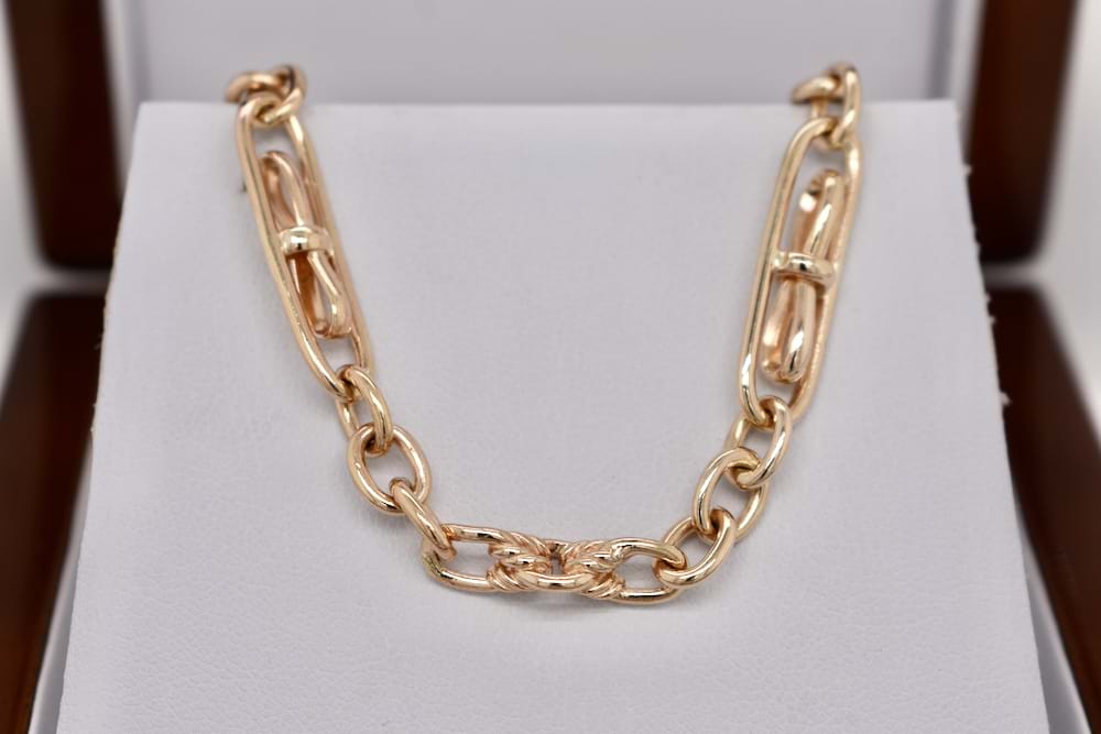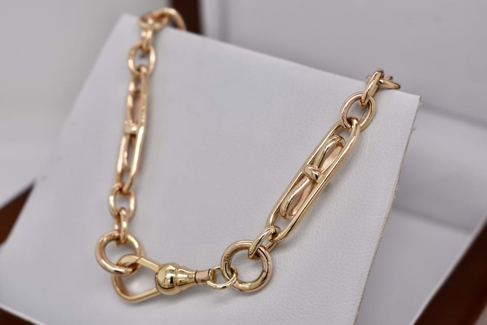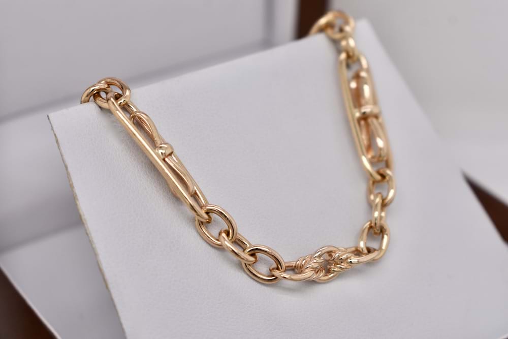 This lovely 9ct yellow gold bracelet handmade by our goldsmith has Birmingham bow links and one swivel. Bracelet length is 19cm and weighs 13.1 grams