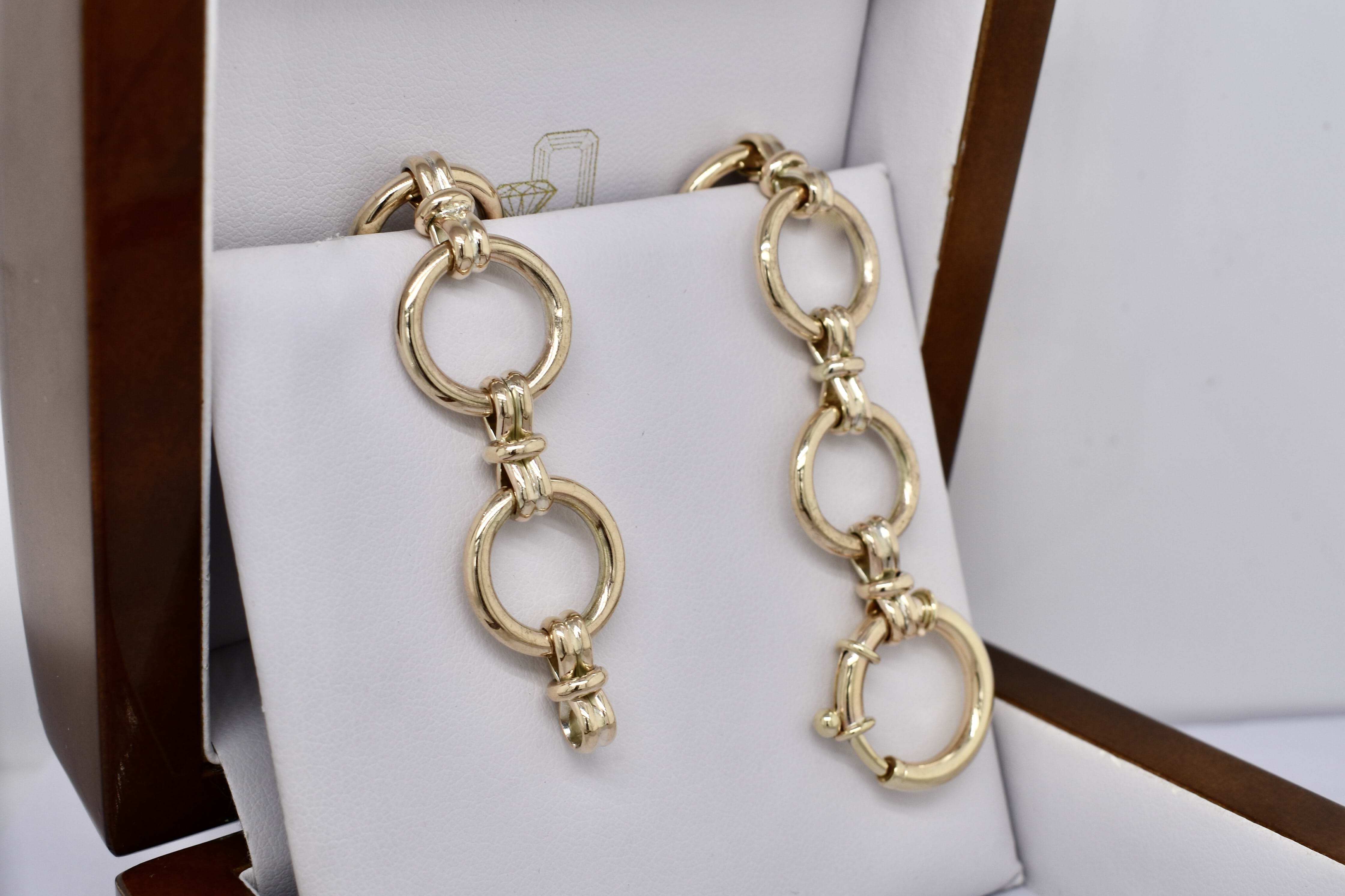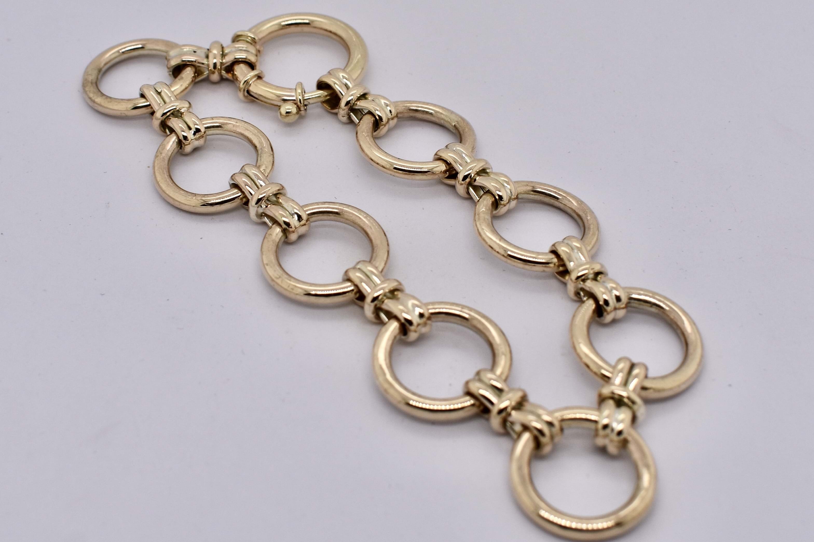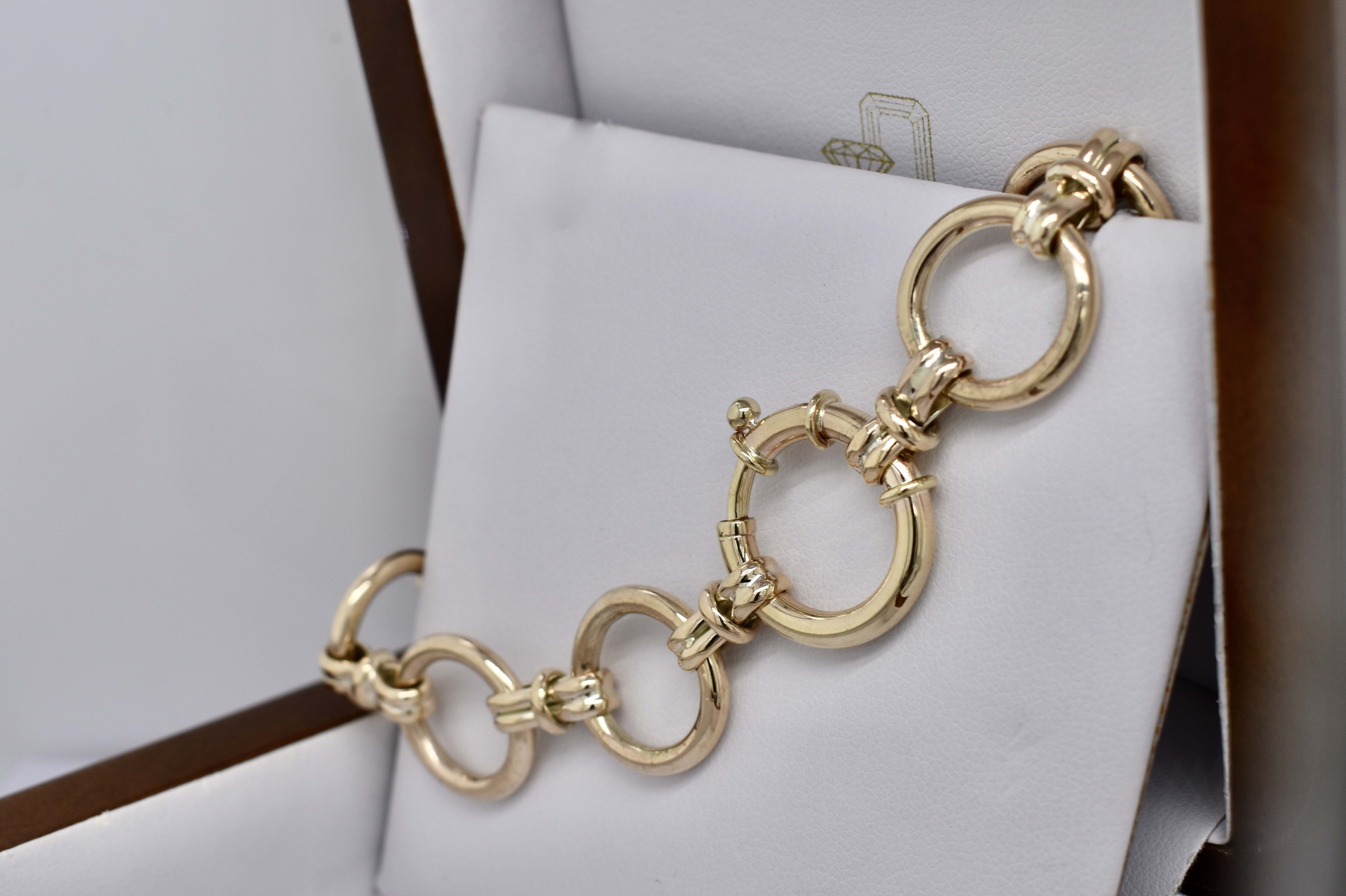 This handmade 9ct yellow gold 'Olympus' link bracelet is the perfect addition to any collection. Measuring 21.5cm long and is completed with a beautiful 20mm bolt ring clasp. Weighing 32.92 grams.