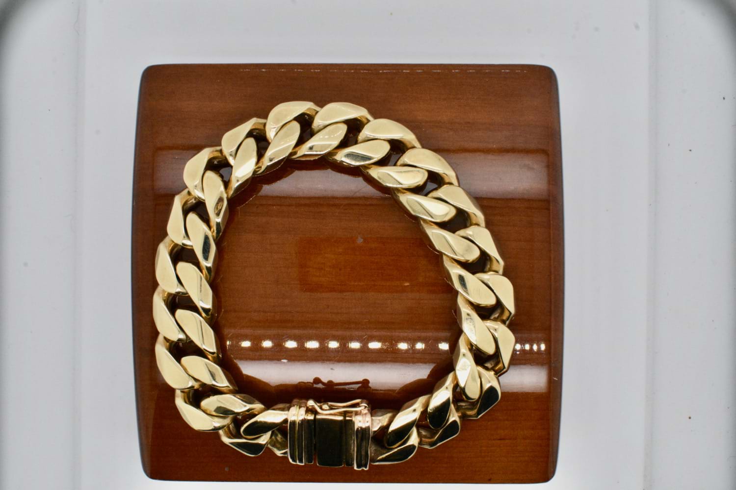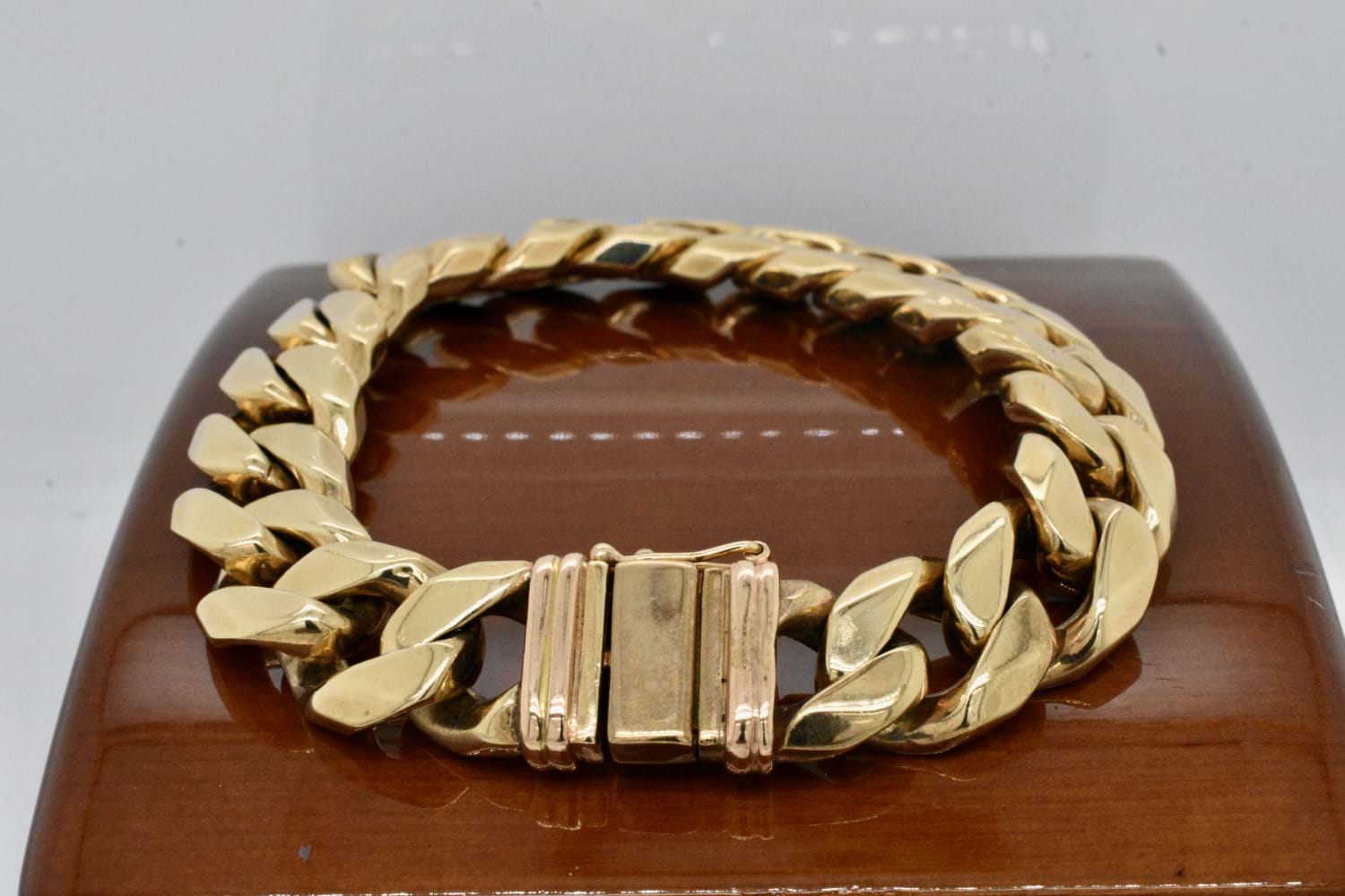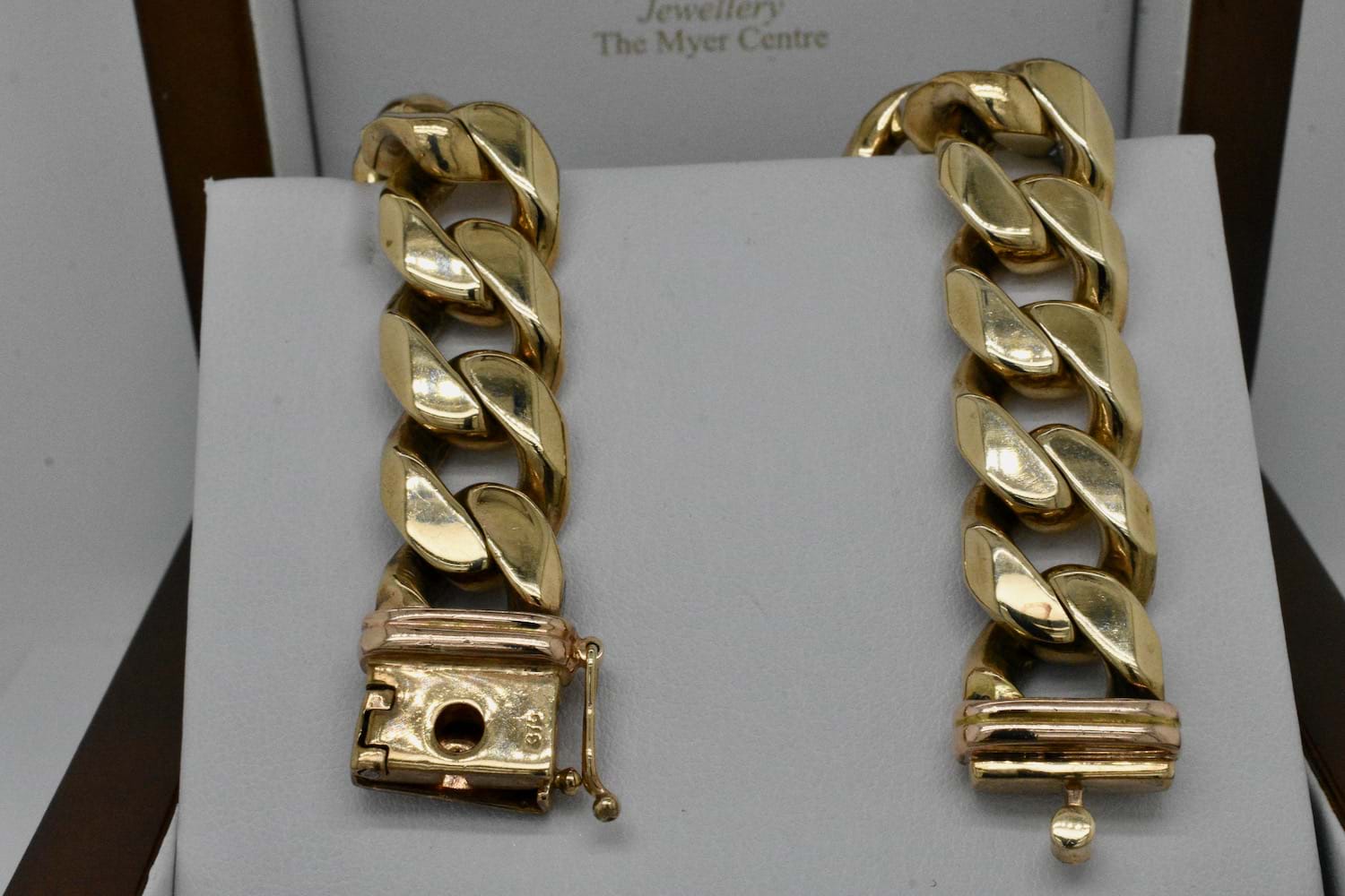9ct yellow gold flat curb link 13.42mm wide bracelet with grooved end finials with folding box hook & eye style clasp with figure 8 safety catch. Length = 21 cm Weight = 96.48 grams. Independent Valuation Supplied